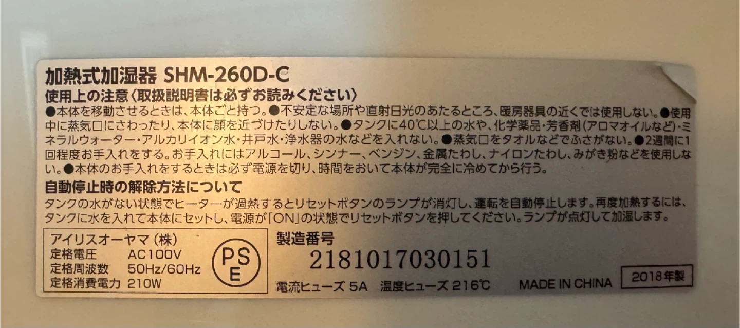 アイリスオーヤマの加湿器です。 【情報】 ブランド:アイリスオーヤマ 型番:SHM-260D-C 年式:2018年製 定格電圧:AC100V 定格周波数:50/60Hz 消費電力:210W 中古品であることをご了承ください。 綺麗に洗浄してあります。 取りに来てくださる方へお譲りします。
