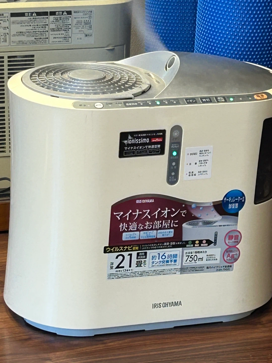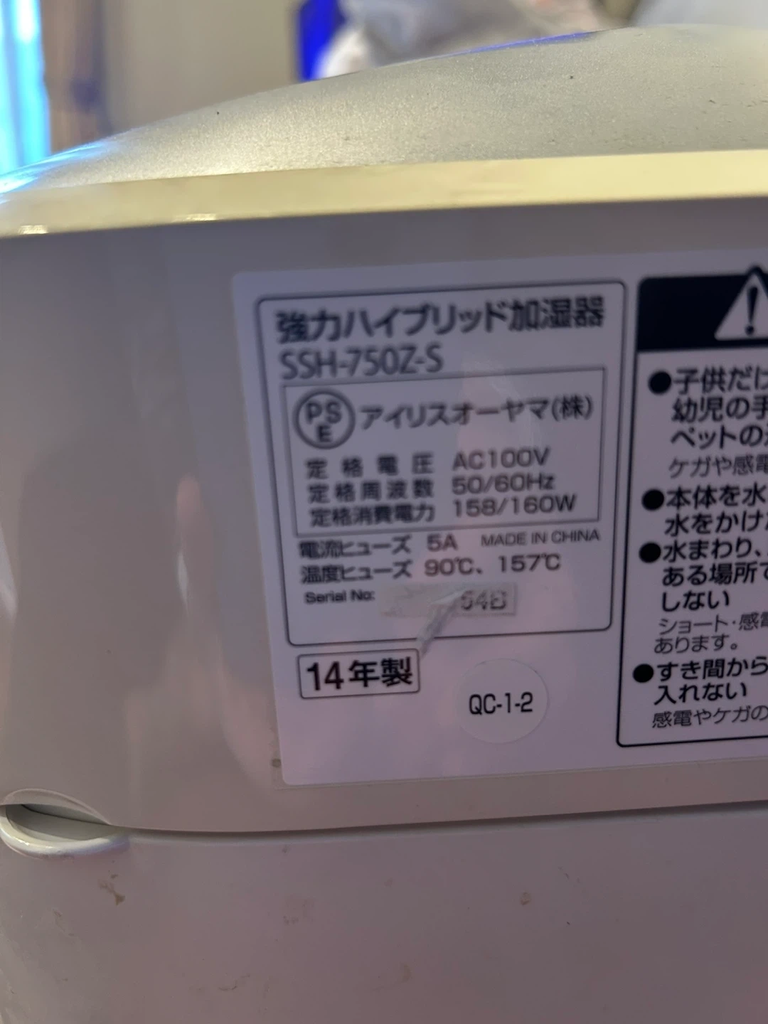アイリスオーヤマのハイブリッド加湿器です。 【情報】 ブランド:アイリスオーヤマ 型番:SSH-750Z-S 年式:14年製 定格電圧:AC100V 定格周波数:50/60Hz 定格消費電力:158/160W 洋室21畳 16時間稼働