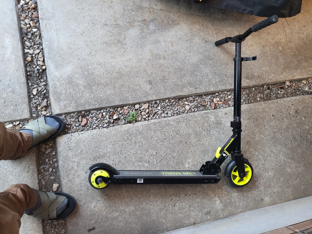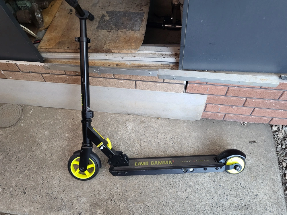 商品の説明 ・折り畳みが可能な、アシスト機能付キックスクーター ・前輪6インチPUホイール 後輪モーター内蔵4インチラバーホイール ・約時速5km以上になるとモーターがONになり、約5秒間起動し一度OFFになります。 ・最高速度15km/h 走行距離 約7km(バッテリーの使用状況により異なります) ・バッテリー残量は色で認識、今の時代に合った安全なアシスト機能 ・充電時間:約3時間(家庭用電源) ○乗った感じ、バッテリーは問題なく使用できます。 ○充電も問題ありません。 ○ステップまわりにキズ、多少の凹みなどあります。 【注意事項】 本製品は私有地のみ走行可能(法的基準は満たしておりません) 説明書.販売証明 無しです。