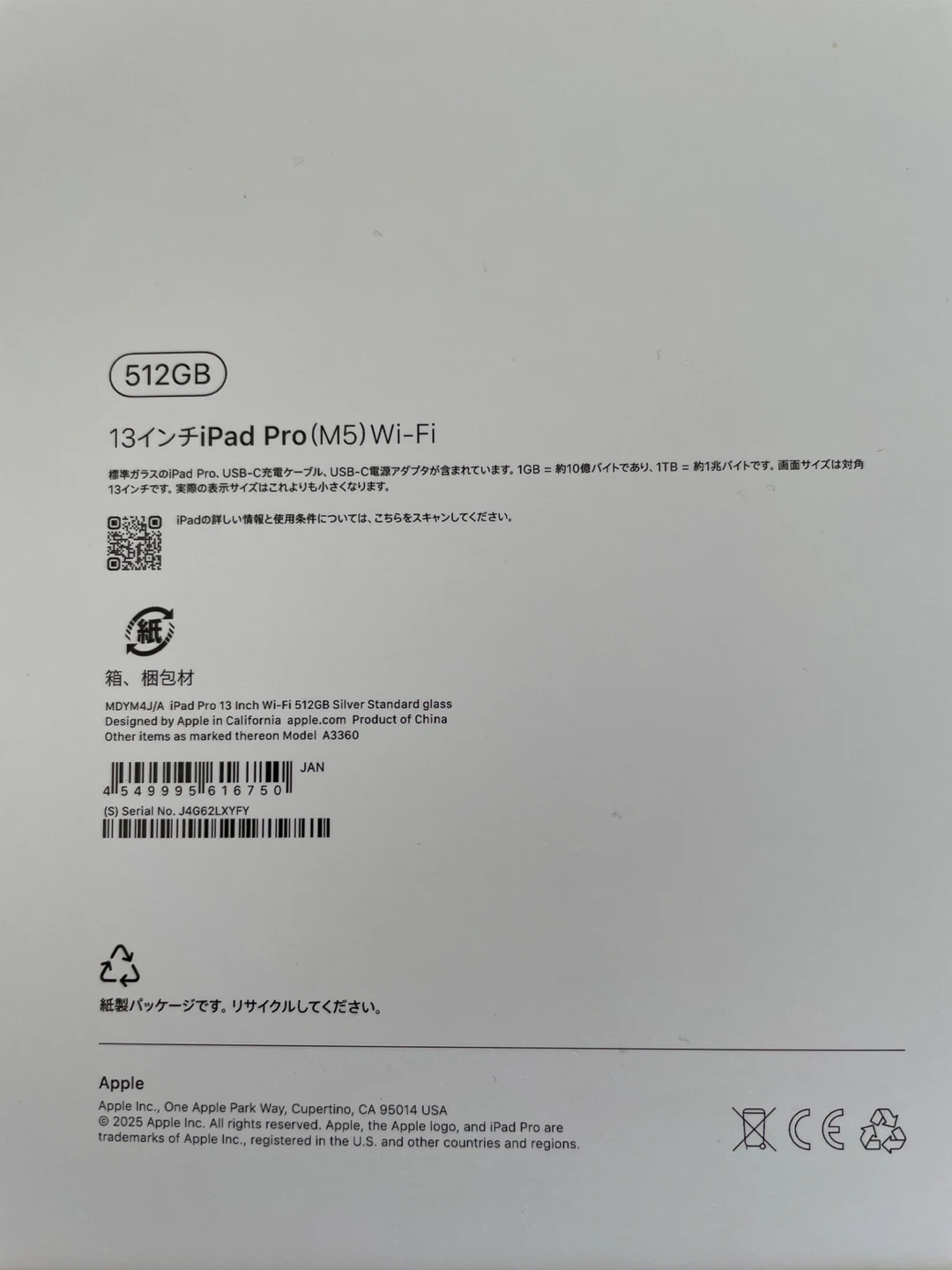 アップル 13インチ iPad Pro (M5) Wi-Fi 512GB 箱のみ