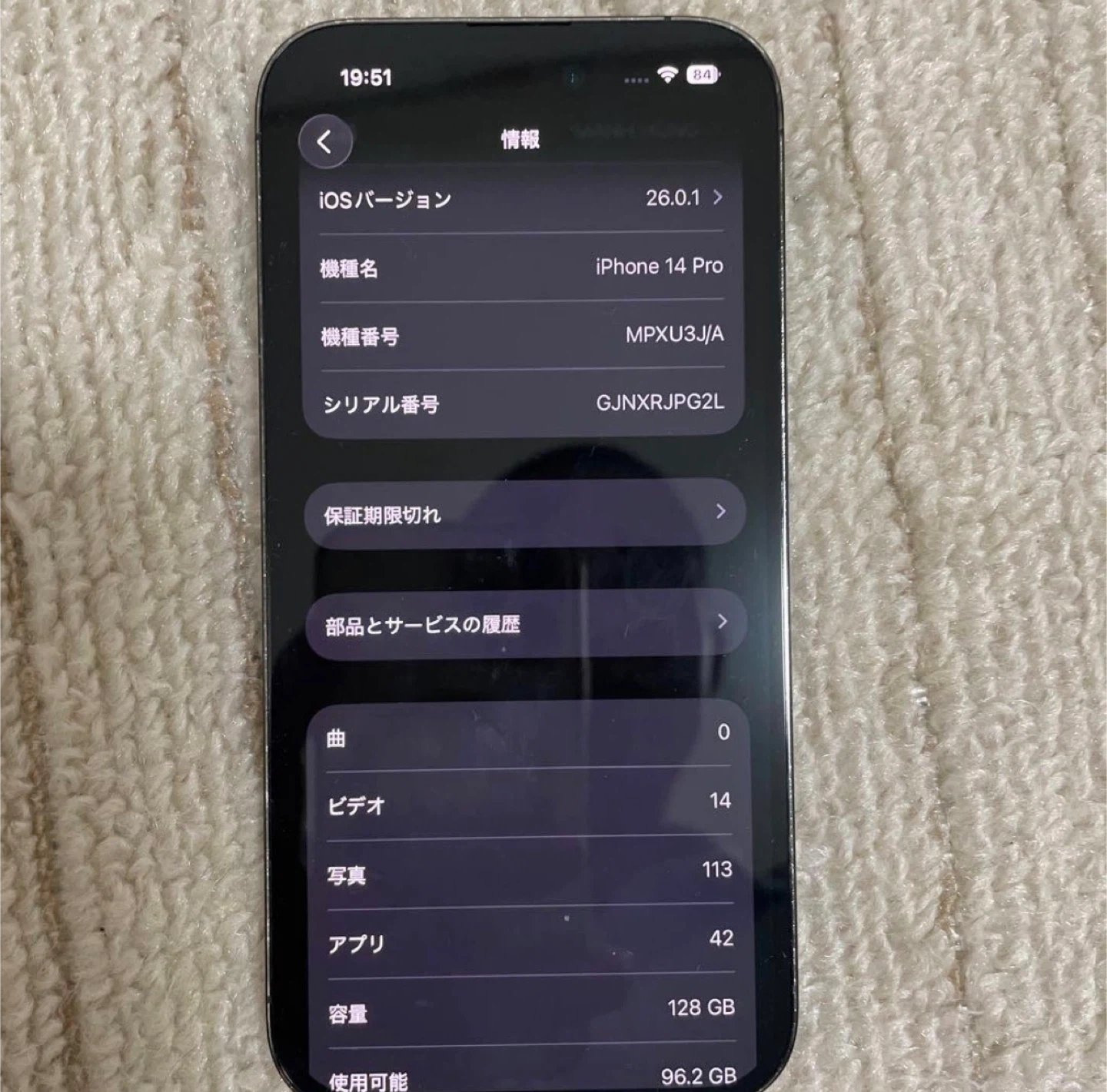 アップルのiPhone 14 Proです。 【情報】 機種名:iPhone 14 Pro 容量:128GB iOSバージョン:26.0.1 【状態】 使用感あり 【その他】 バッテリーは2025年10月9日に交換済みです。 128GBストレージのiPhone 14 Pro、バッテリー良好 - 機種名: iPhone 14 Pro - ストレージ容量: 128 GB - バッテリー状態: 良好 - 修理履歴: バッテリー交換済み ご覧いただきありがとうございます。 10月9日にApple Store純正バッテリー交換。 すべての機能は正常に動作します。 シリーズ···iPhone 機種名···iPhone 14 Pro スマートフォン カラー···スペースブラック 容量···128GB 機能不良···なし 中古品であることをご了承ください。