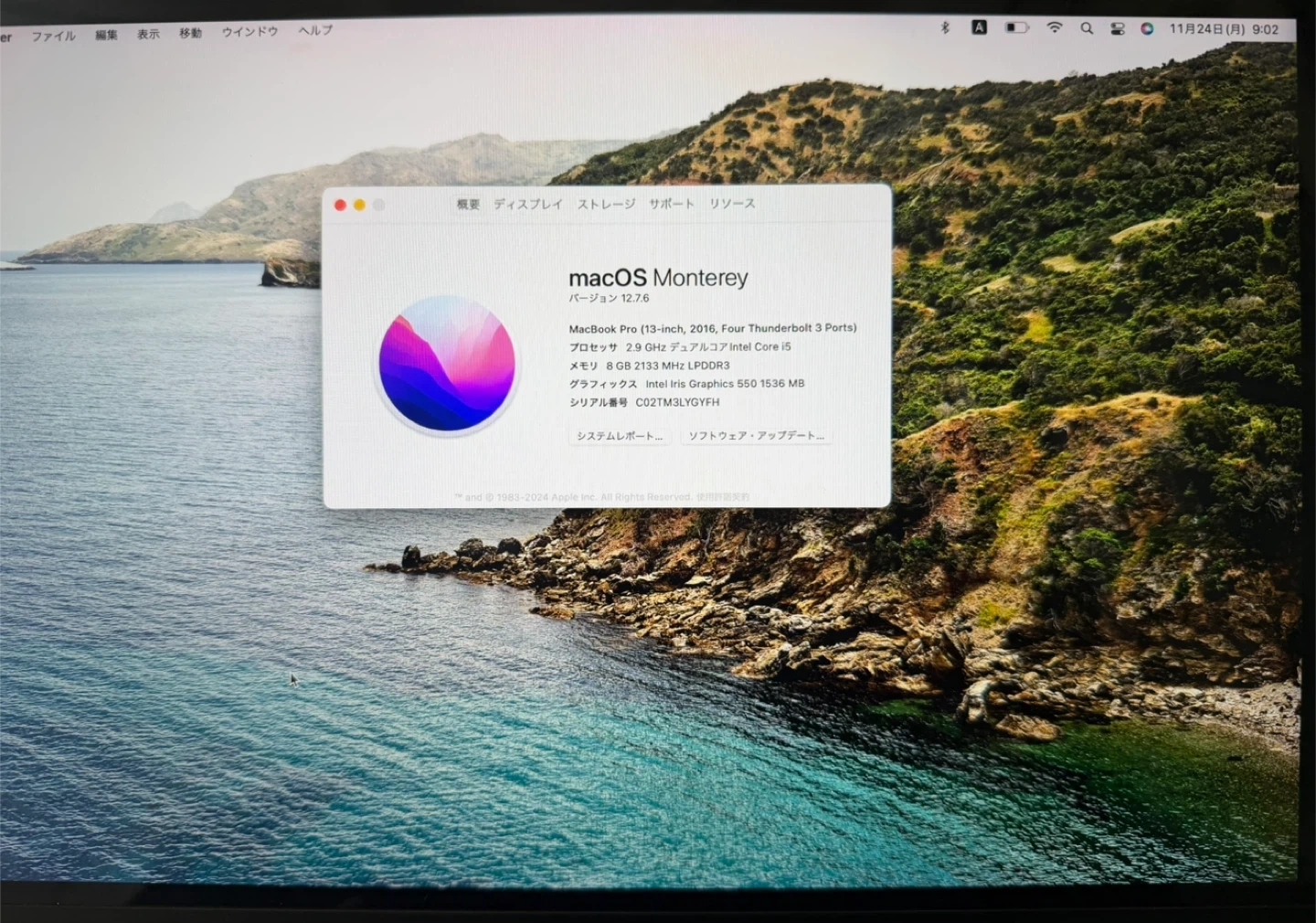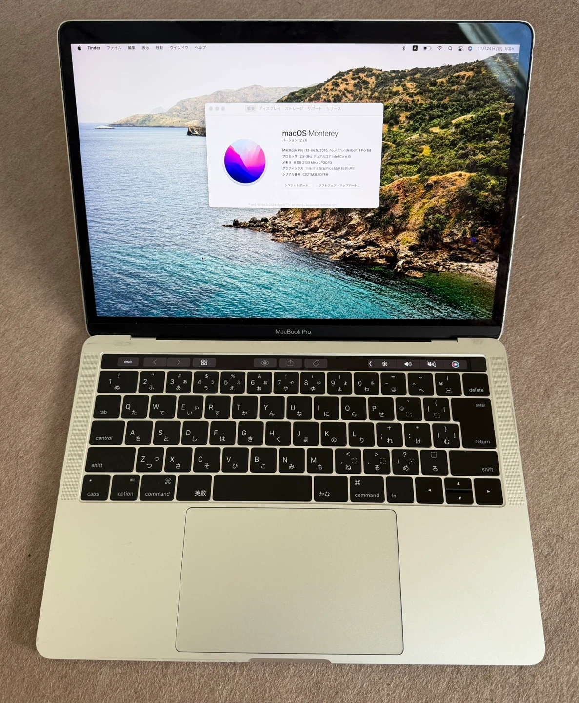 アップルのMacBook Proです。 【情報】 ブランド:アップル モデル:MacBook Pro (13-inch, 2016, Four Thunderbolt 3 Ports) OS:macOS Monterey プロセッサ:2.9 GHz Intel Core i5 メモリ:8 GB 2133 MHz LPDDR3 グラフィックス:Intel Iris Graphics 550 1536 MB ヤフオクにも出しており閲覧数や❤️マークが付いていますのでお早めにどうぞ 【状態】 使用感あり 中古品であることをご了承ください。 大した汚れは無いのですが、縁の凹みはあります。 しかし十分に使用できますよ。 電源は市販のUSB-Cケーブルでおねがいします。 元箱でお渡しします。 受け渡し場所の相談は受けます。