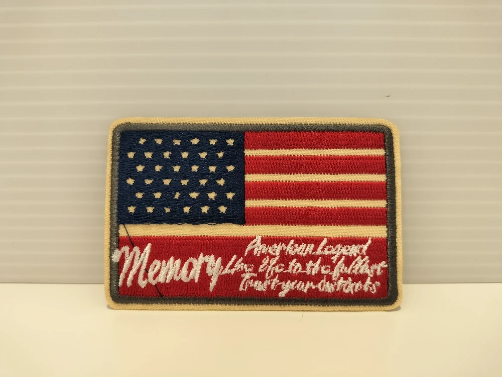 アメリカ国旗のデザインパッチです。 ・アメリカ国旗のデザイン ・「Memory」、「American Legend」、「Live life to the fullest」、「Trust your instincts」の文字入り ・縁はベージュ 中古品であることをご了承ください。