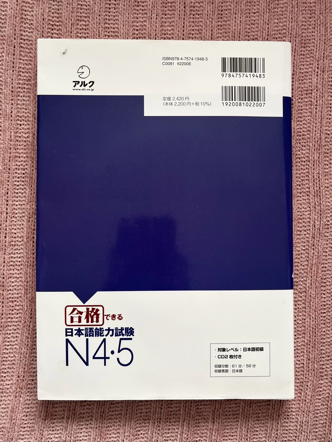 日本語能力試験 N4・5の参考書です。 【情報】 ブランド:アルク 種類:日本語能力試験参考書 レベル:N4・5 付属品:CD2枚付き 【状態】 使用感少なめ、書き込みなし。 中古品であることご了承ください。