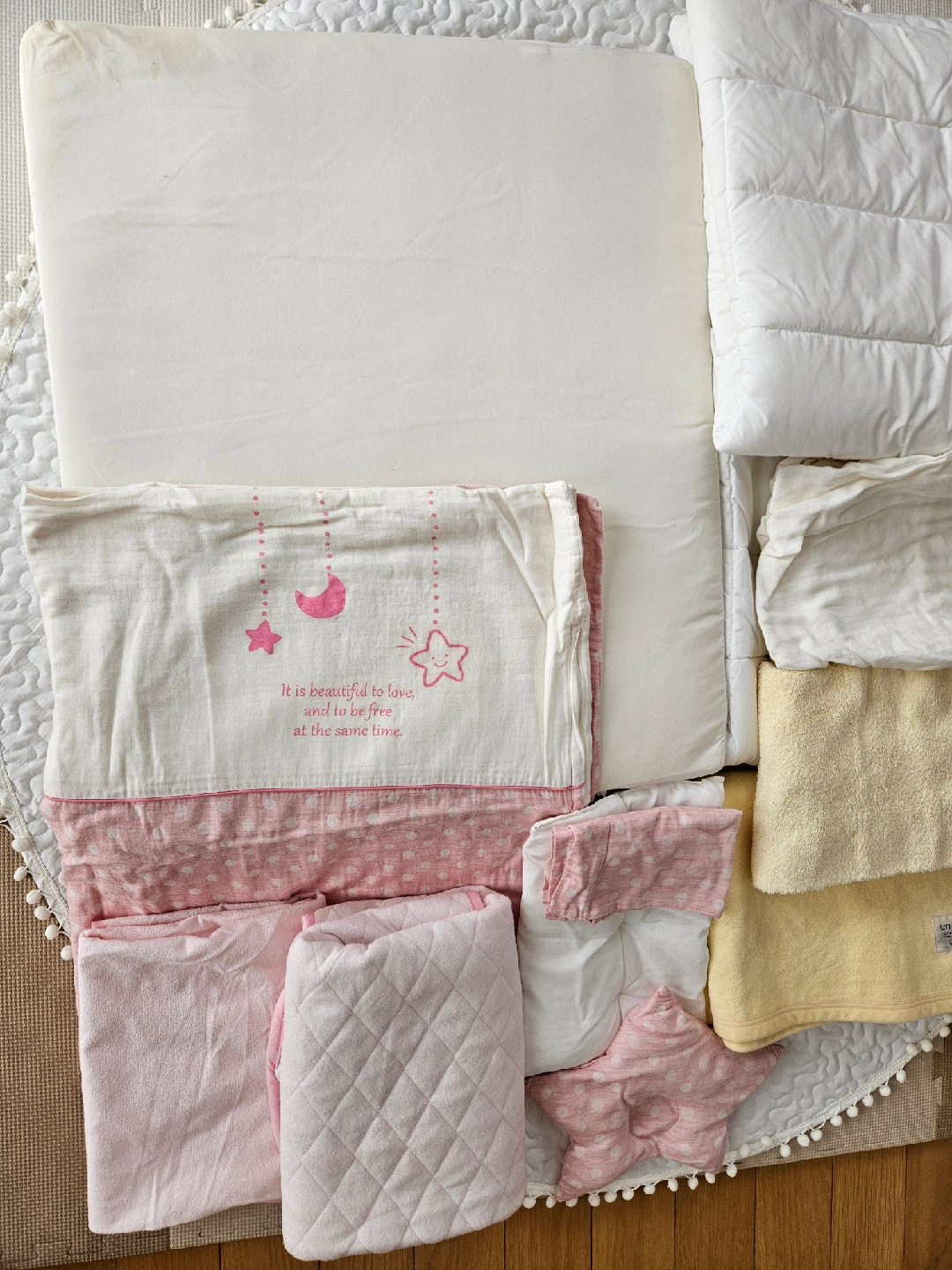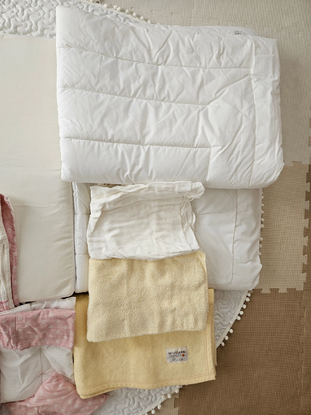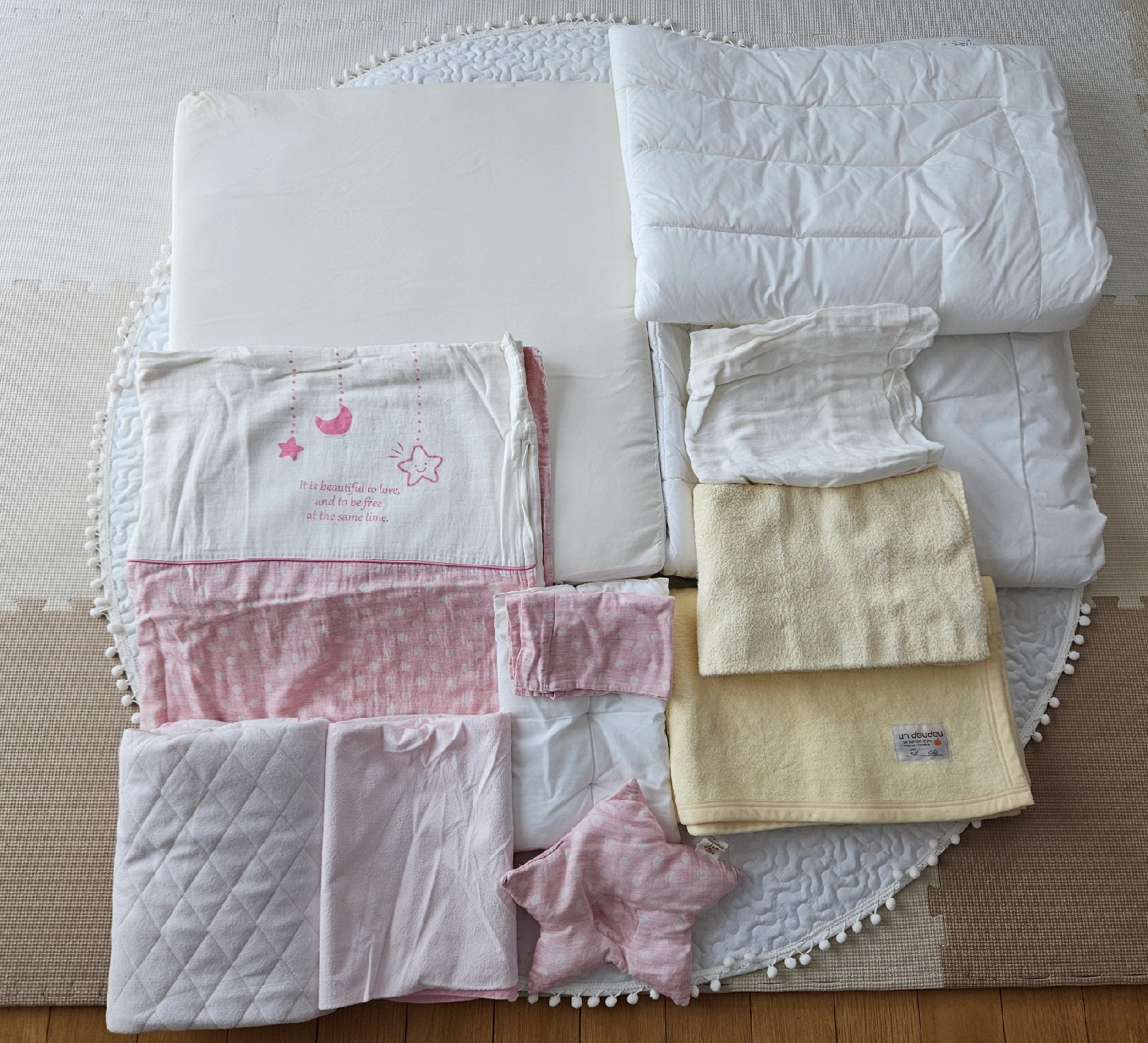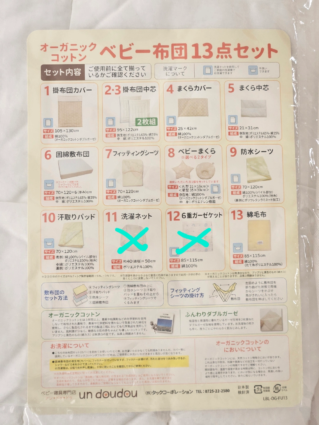 ご覧いただきまして、ありがとうございます(⁎ᴗ͈ˬᴗ͈⁎) un doudouのオーガニックコットンベビー布団セットです。 歳の差兄妹の末娘のために全て新調したものになります。掛け布団は寒冷地ではないため一枚しか使用しなかったです。 固綿敷布団以外は全て洗濯可能で衛生的です! もちろん全て洗濯済みです! セット内のガーゼケットと洗濯ネットは付属しませんのでご注意ください。 おまけで、洗い換え用のフィットシーツとブランケット+ボアパッドもおつけします! 捨てるには綺麗で勿体無いし、とっておくにもまだまだ孫なんてできるわけでもないので、どなたかにご活用していただけたら嬉しいです♪ よろしくお願いいたします! ※中古品であることご了承ください