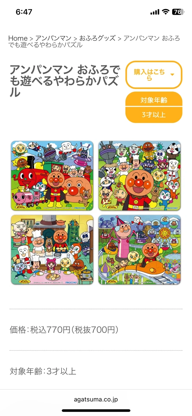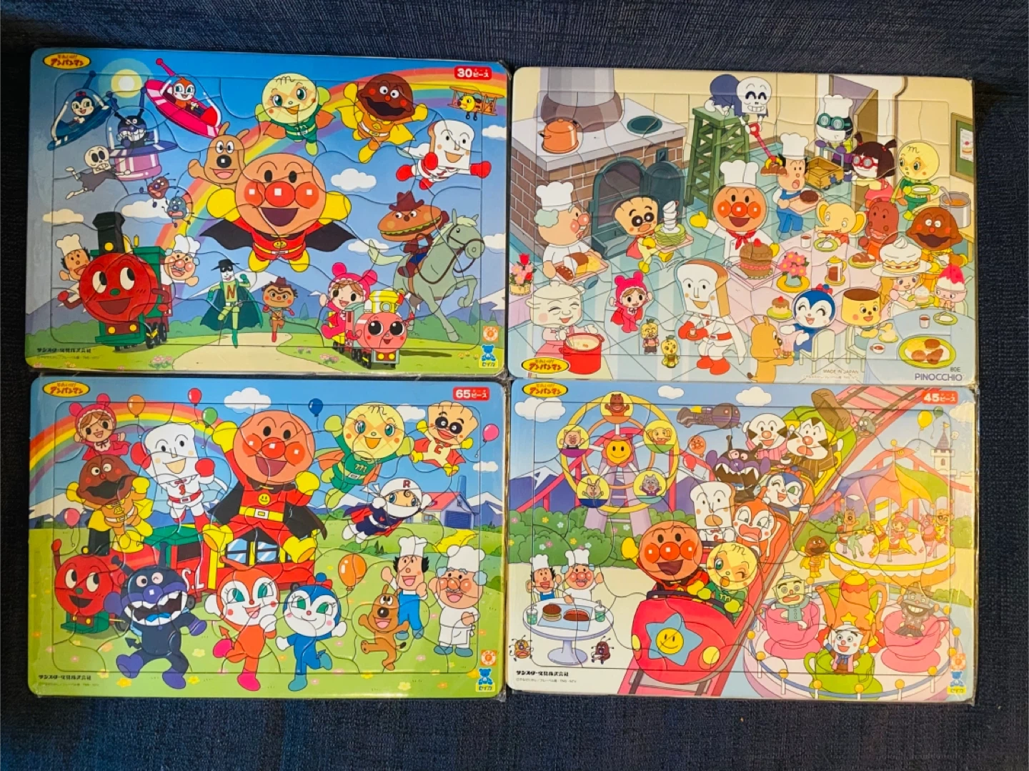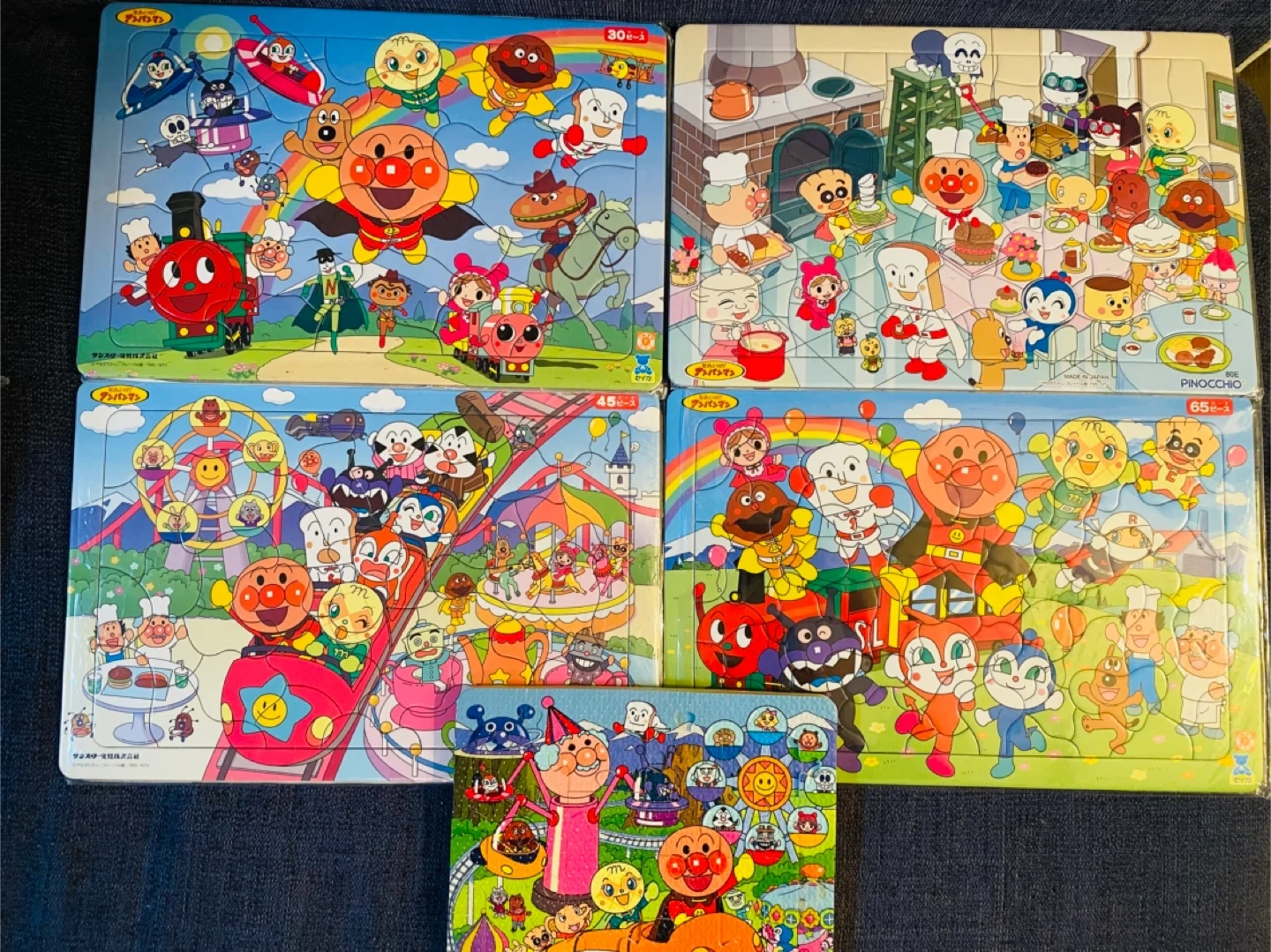 アンパンマンのパズル5点セットです。 ・ブランド:アンパンマン, PINOCCHIO, セイカ, サンスター文具 ・ピース数:30ピース、45ピース、65ピース、80ピース、お風呂パズル16ピースのパズルが5点 ・状態:殆ど使用しておらず、写真のように販売されていたビニールに入れて保管していた為、全体的にきれいです。 ※お風呂パズルは使用していましたが、まだまだ綺麗だと思います。(写真3.4枚目参照) 中古品であることご了承ください