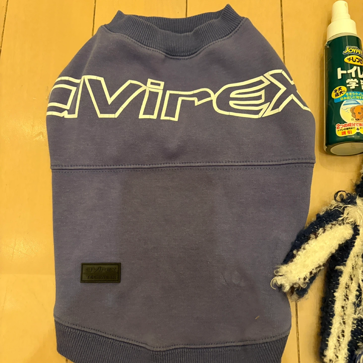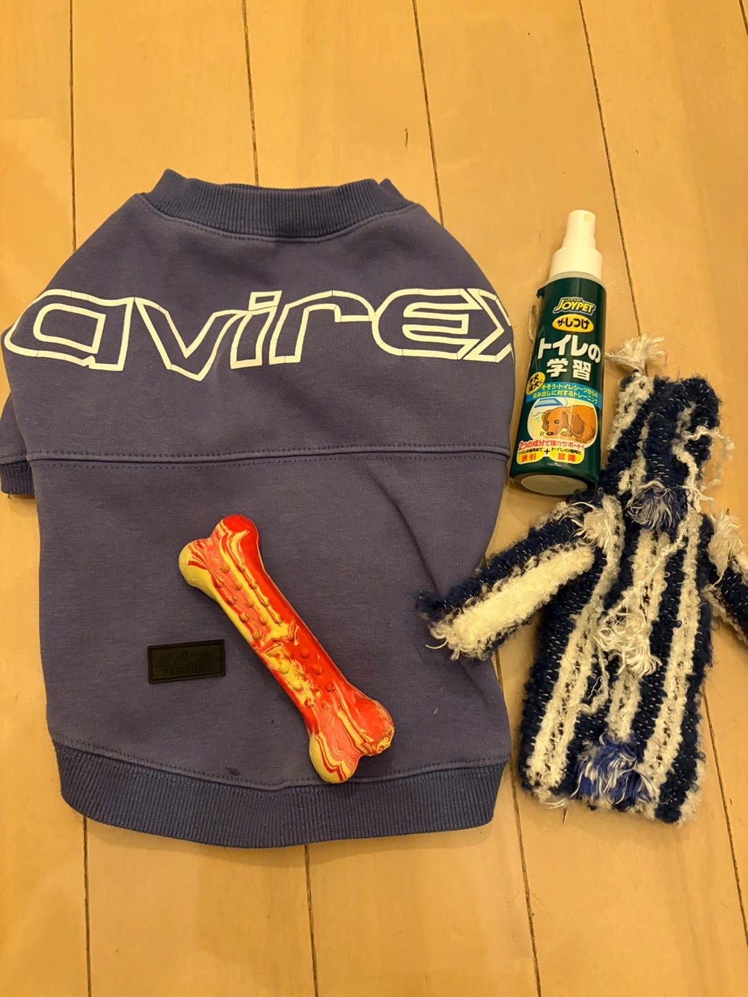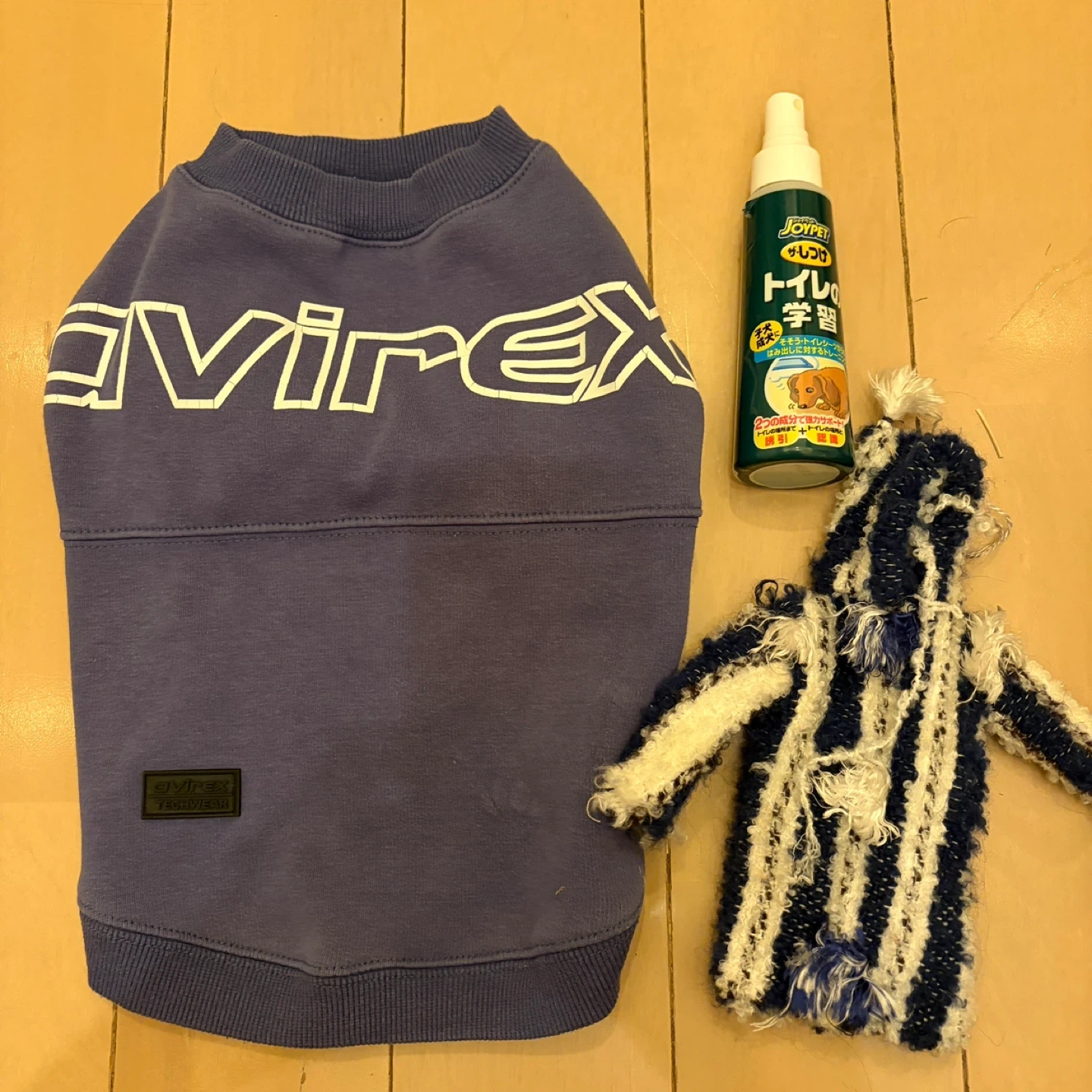 犬用の服とトイレ用しつけスプレーです。 【情報】 ブランド:アヴィレックス(服) 丈35 幅24 【状態】 ・犬用服に使用感あり ・しつけスプレー残量半分 おもちゃとガム ガムはかじったあとあります。 中古品であることをご了承ください。