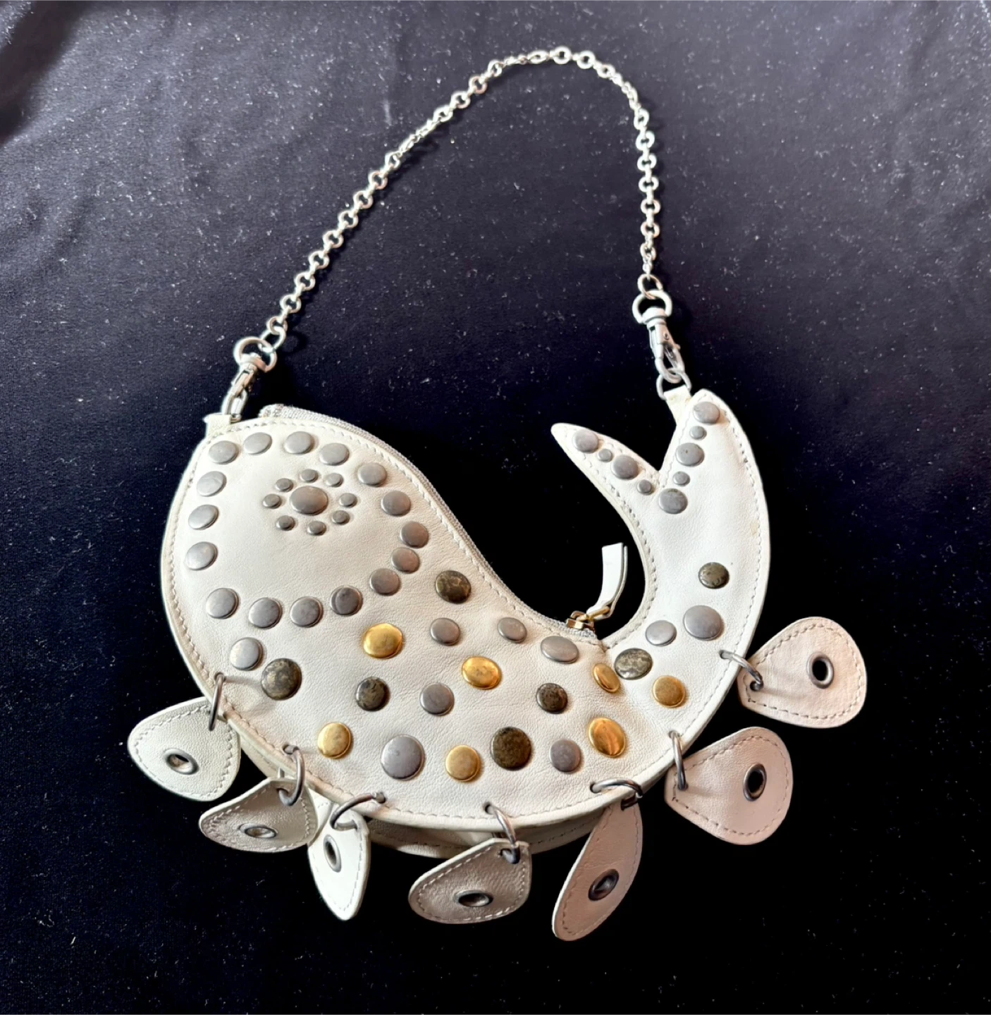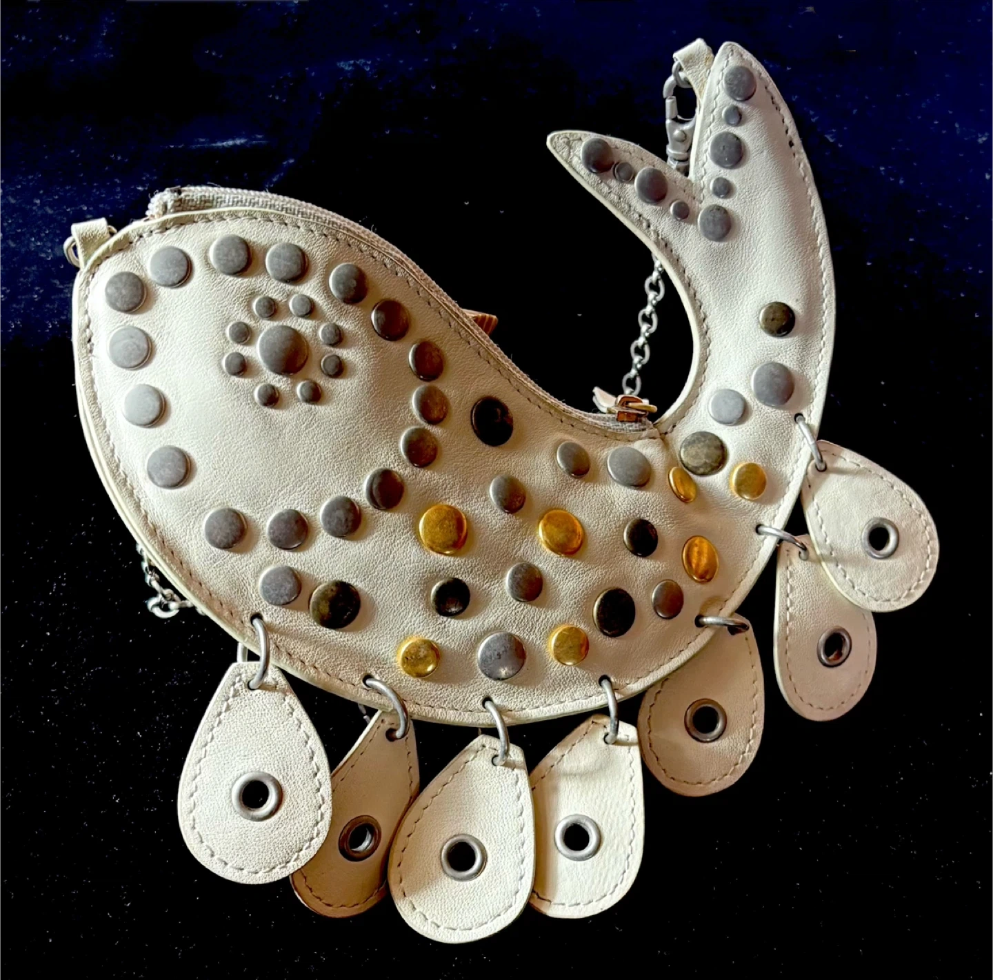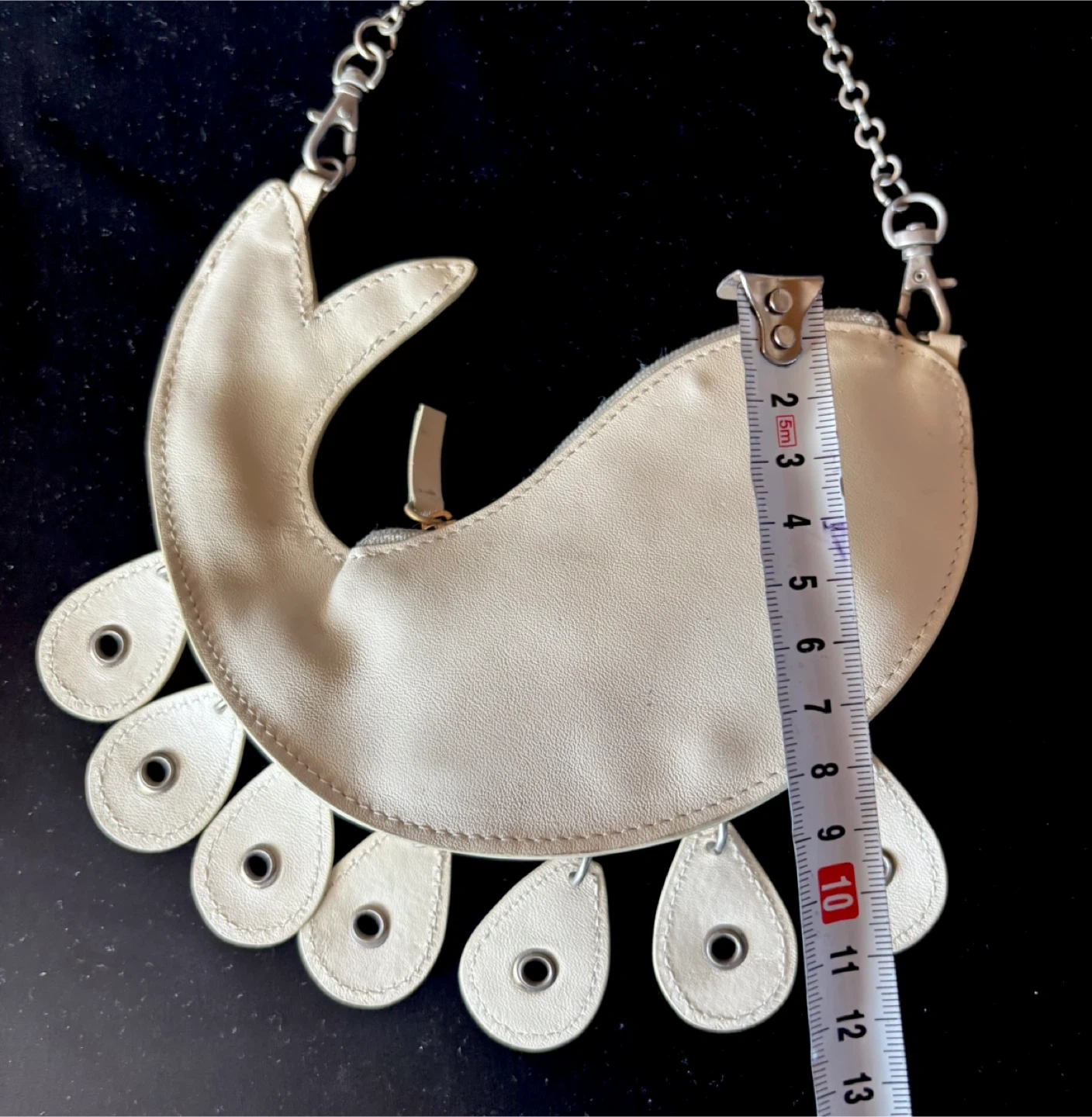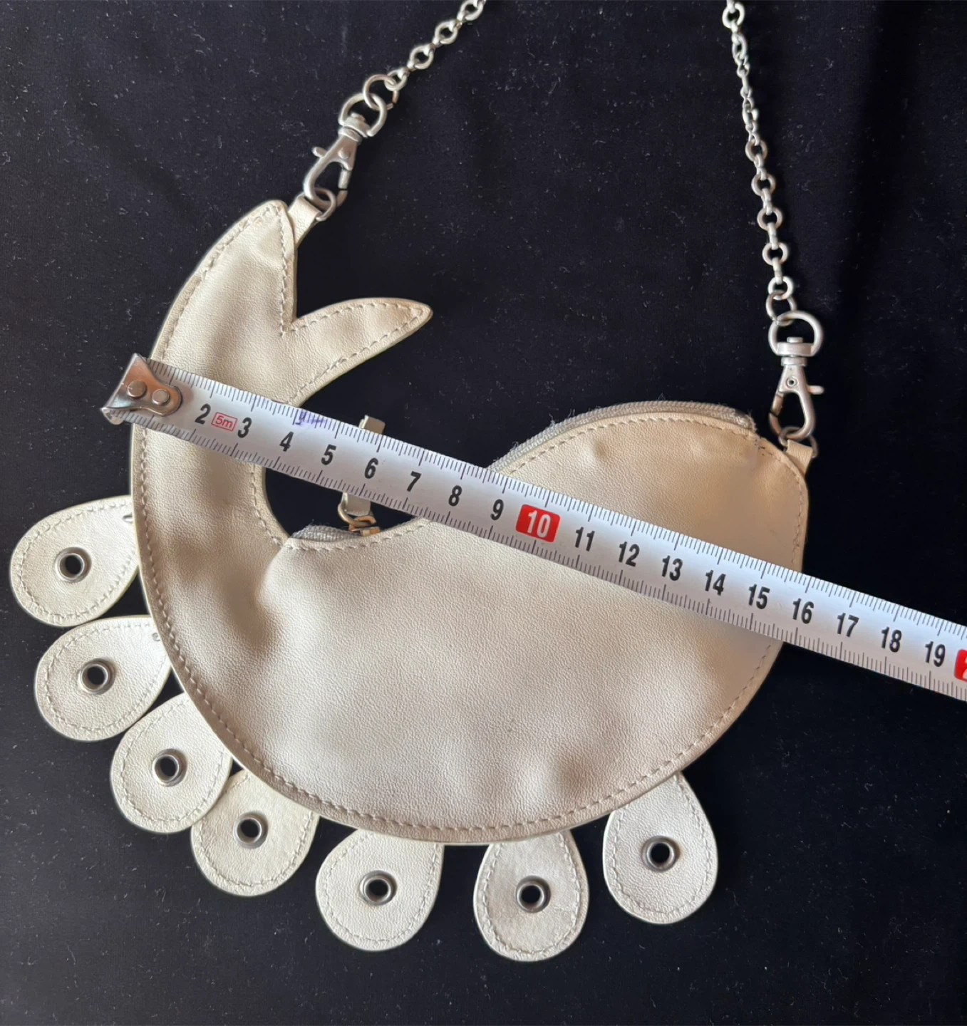 ユニークな魚型レザーショルダーバッグ、メタルスタッズ装飾付き。 バッグといえばバッグの形状ですが、 どちらかというと大きめチャームやカードケースや小銭入れみたいな大きさです。 チェーンは取り外しできるので、長いものにかえれば、斜めがけでファッションのアクセントになるかもしれません。 海外なのか国内かは不明ですが、アーティストの方が作ったもののようです。 何かのお土産でいただきました。 ずっと保管していまして比較的綺麗かと思います。中もベタつきもないです。 長い間の自宅保管品、中古品です。くすみ、小さなスレ、金属部分のくすみが見られます。 ご理解ある方にお譲りします。 - デザイン: 魚型デザイン - 素材: レザー - カラー: ホワイト - 装飾: メタルスタッズ - ストラップ: チェーンストラップ - サイズ: コンパクト - 開閉: ファスナー式 - 特徴: ユニークな形状 ●大きさは写真をご参考になさって下さい チェーンの長さ  約33.5cmぐらい          留め具含む マチ       約4cmぐらい 素人採寸 ご覧いただきありがとうございます。 #カードケース #小銭入れ #コインケース #ショルダー #魚 #アート #バッグ