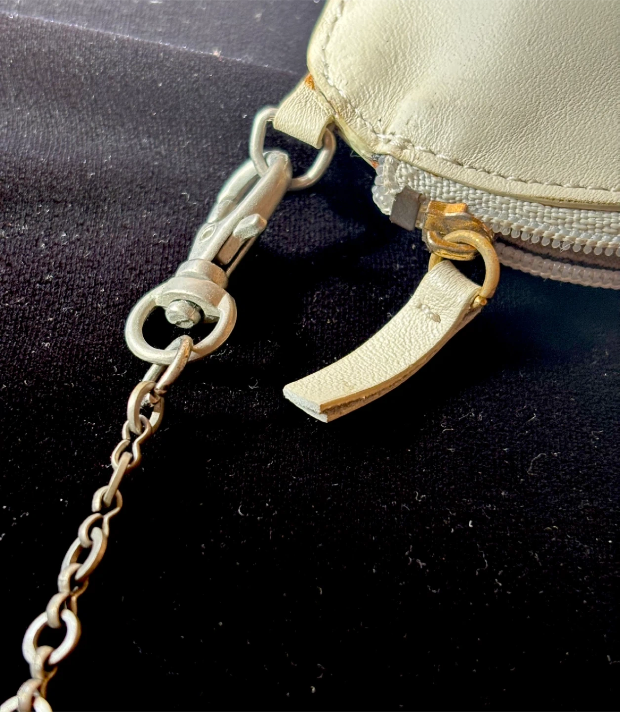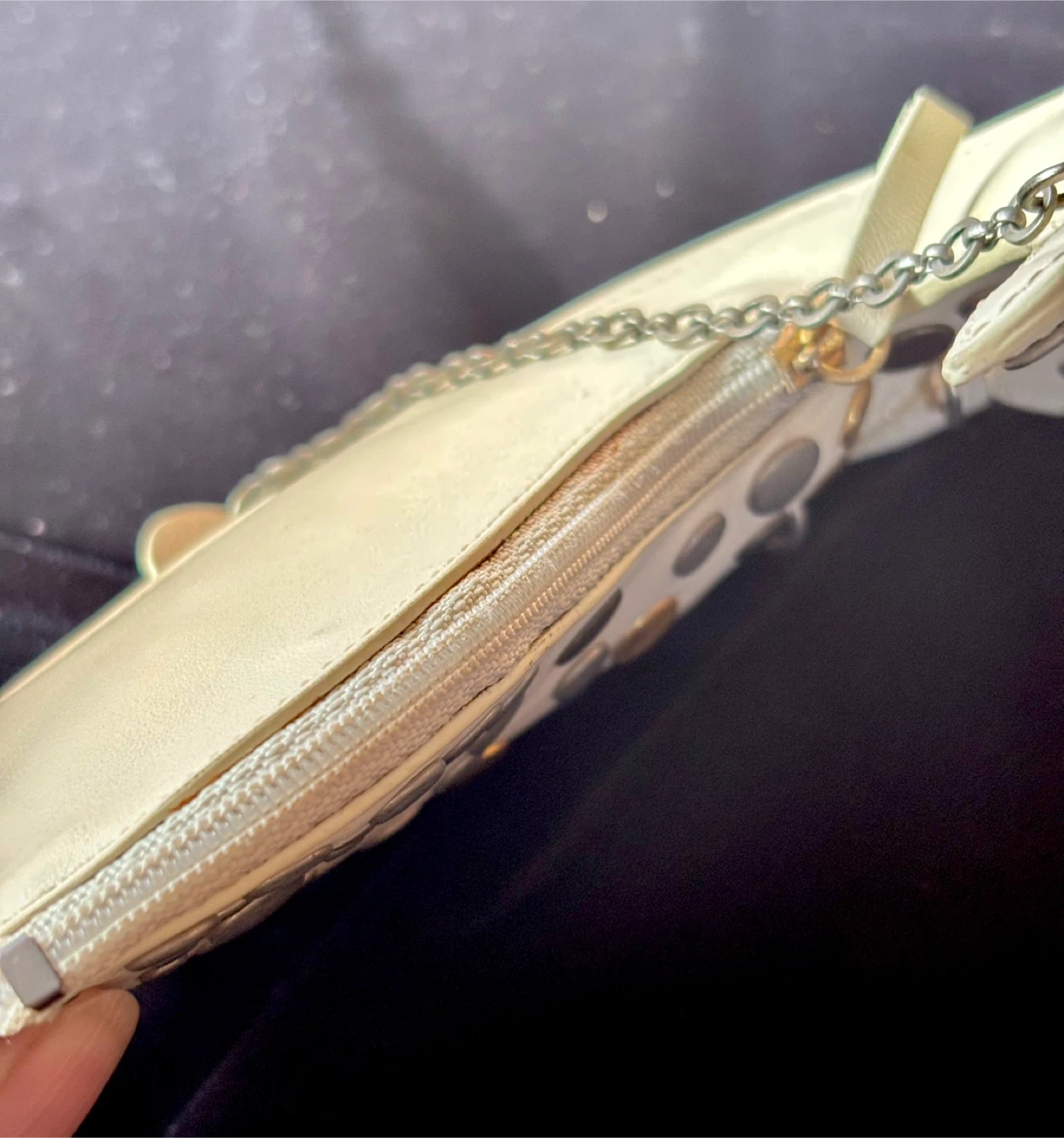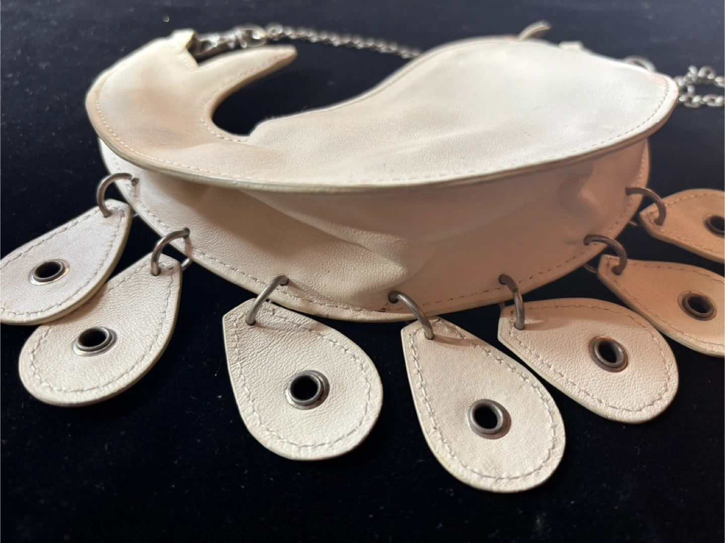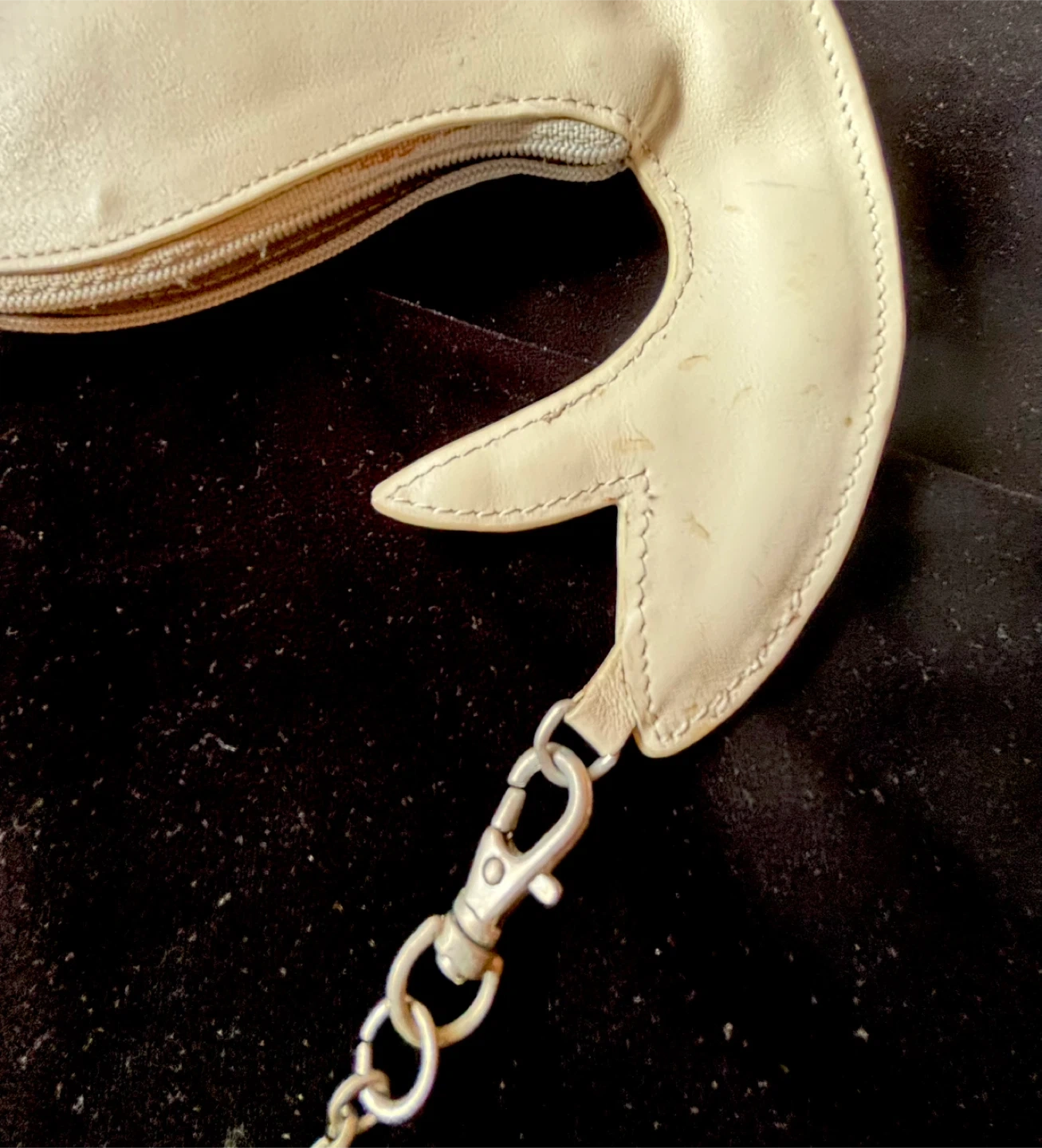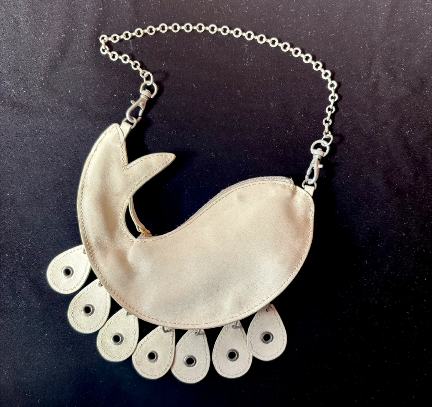 ユニークな魚型レザーショルダーバッグ、メタルスタッズ装飾付き。 バッグといえばバッグの形状ですが、 どちらかというと大きめチャームやカードケースや小銭入れみたいな大きさです。 チェーンは取り外しできるので、長いものにかえれば、斜めがけでファッションのアクセントになるかもしれません。 海外なのか国内かは不明ですが、アーティストの方が作ったもののようです。 何かのお土産でいただきました。 ずっと保管していまして比較的綺麗かと思います。中もベタつきもないです。 長い間の自宅保管品、中古品です。くすみ、小さなスレ、金属部分のくすみが見られます。 ご理解ある方にお譲りします。 - デザイン: 魚型デザイン - 素材: レザー - カラー: ホワイト - 装飾: メタルスタッズ - ストラップ: チェーンストラップ - サイズ: コンパクト - 開閉: ファスナー式 - 特徴: ユニークな形状 ●大きさは写真をご参考になさって下さい チェーンの長さ  約33.5cmぐらい          留め具含む マチ       約4cmぐらい 素人採寸 ご覧いただきありがとうございます。 #カードケース #小銭入れ #コインケース #ショルダー #魚 #アート #バッグ