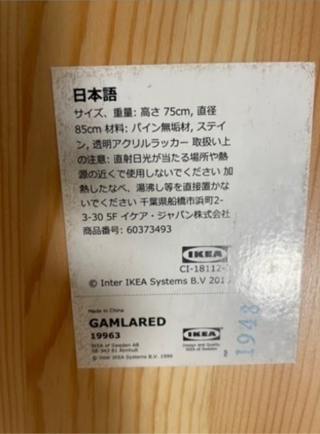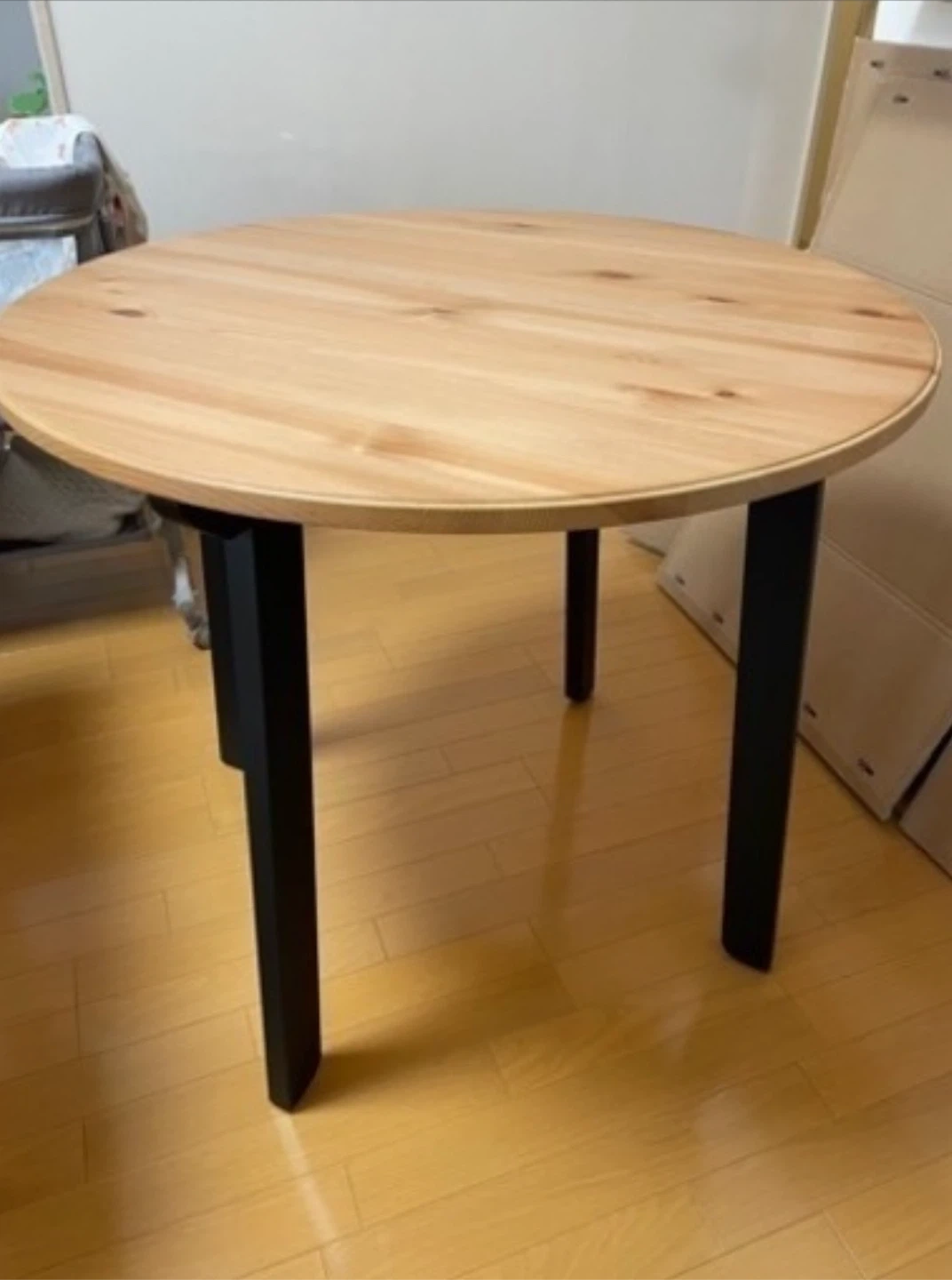 IKEAダイニングテーブル GAMLARED ガムラレード ※生産終了モデル 高さ75cm 直径85cm パイン無垢材使用 3年ほど使用しました。引っ越しに伴い新しい家具を購入したためお譲りします。 画像4枚目の通り、多少のスレ、打痕はあります。 中古品とご理解いただける方のみお願いします。 分解した状態で直接お渡ししたいと思います。 組み立ては15分ほどの簡単なものになります。 (6角レンチとプラスドライバーが必要) 定価 ¥14990