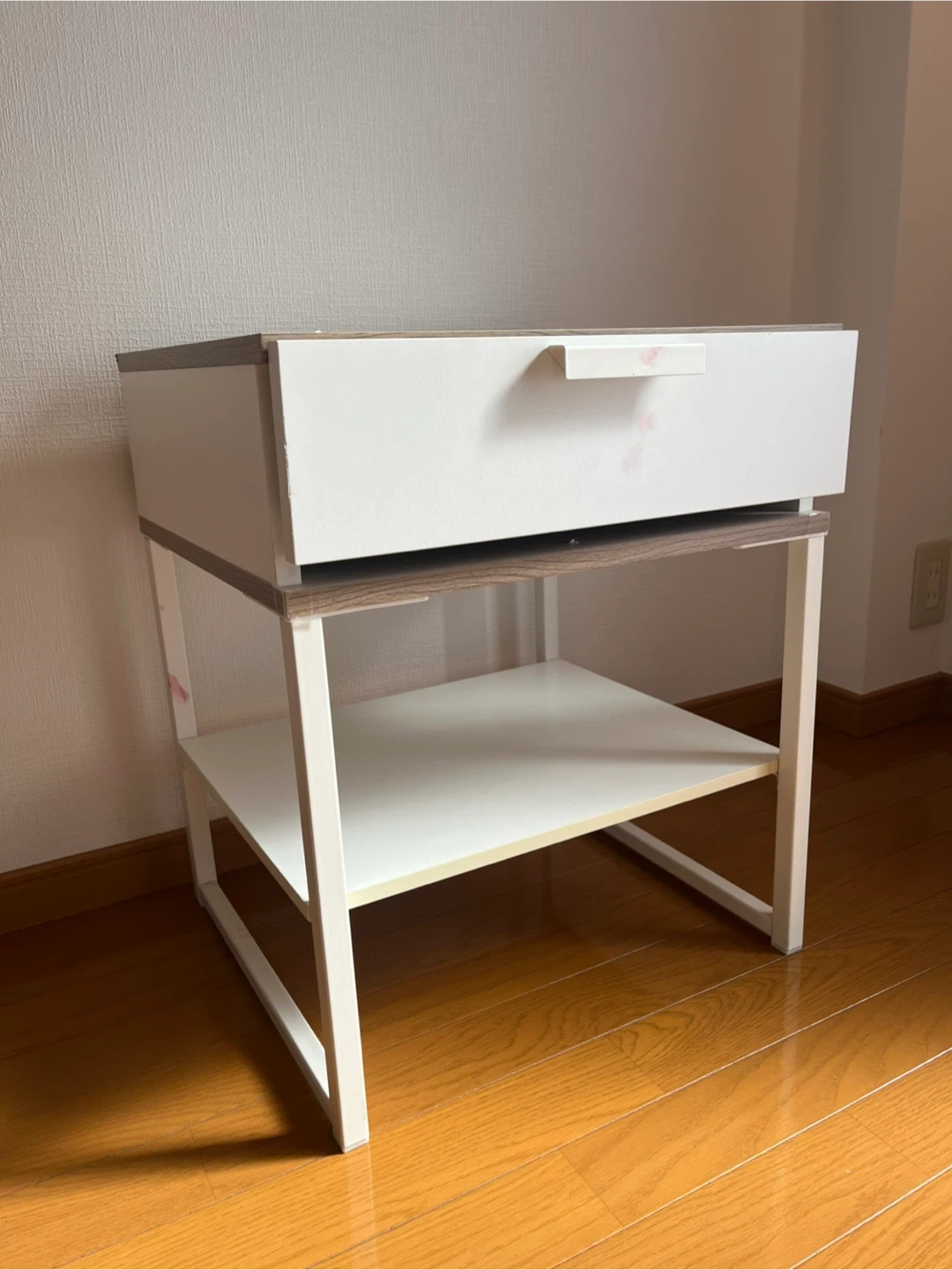 IKEAの収納棚です^_^ サイズは素人採寸ですが、 縦44×横45×高さ55cmです。 引き出しの中に釘穴、平らな部分には傷がありますが、 引き出しの開け閉めもスムーズに使えます。 引き出しの下にも棚があり、物が置けて便利です。 テレビ台として使用していました。 塗り直して使おうと思っていましたが、 なかなか時間が取れないので出品します。 物々交換も可能です。 ほしい物リストはプロフィールをご確認ください。 お値段交渉などありましたらお気軽にどうぞ^_^