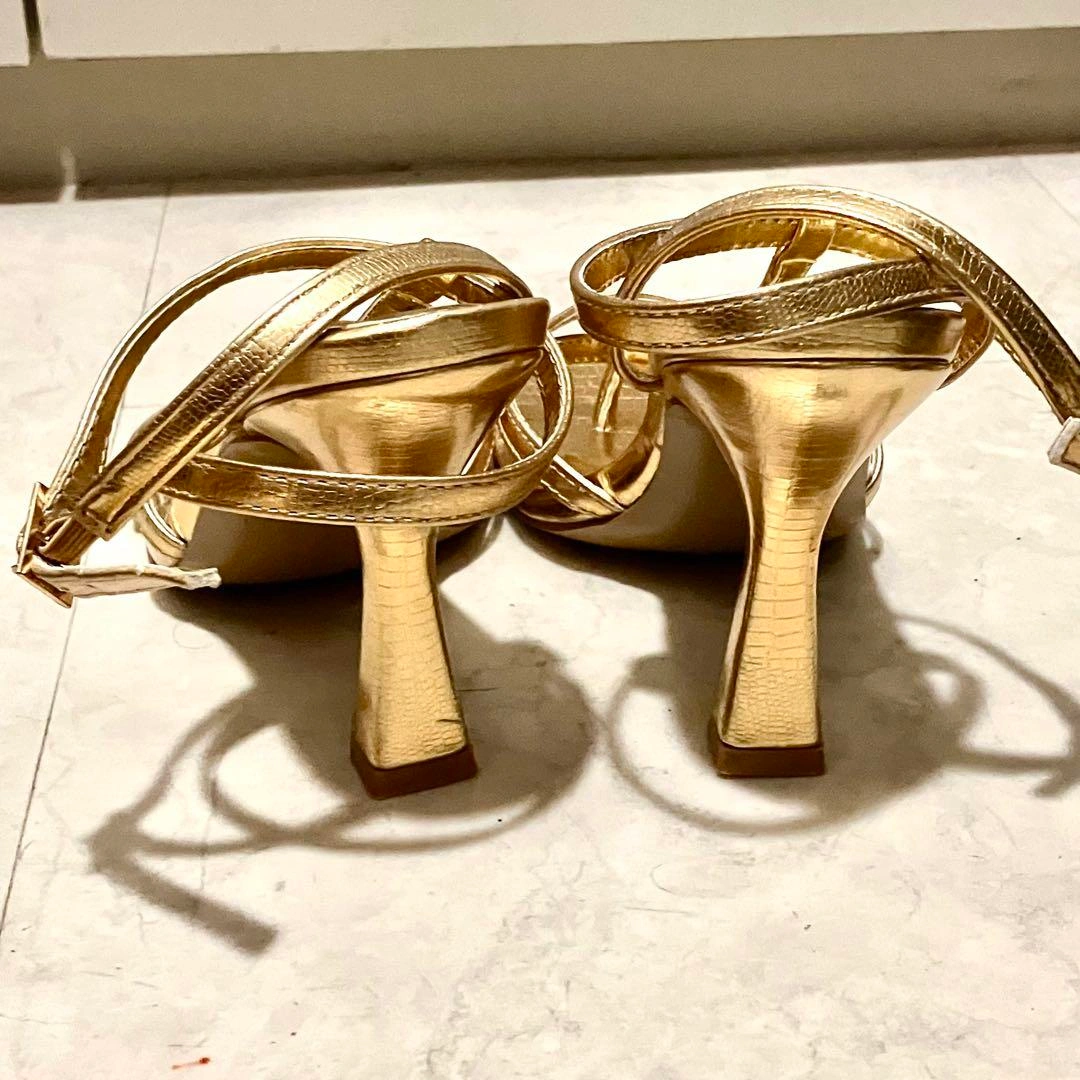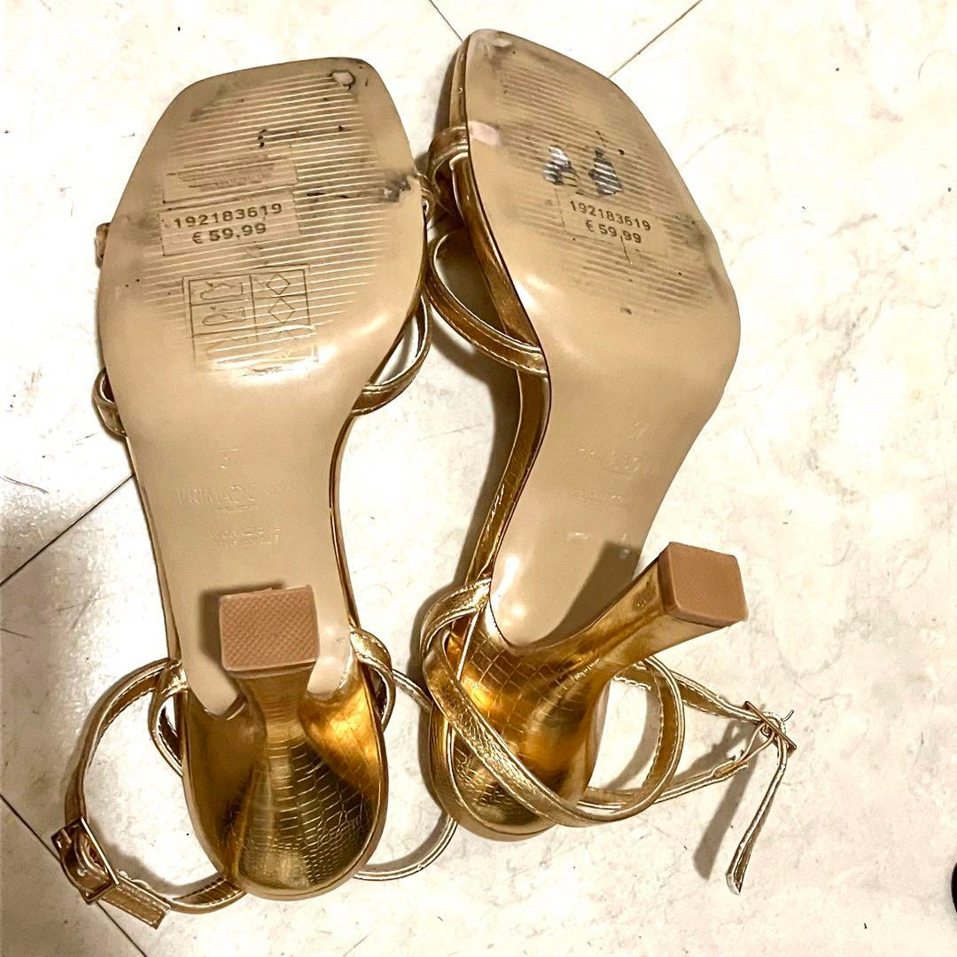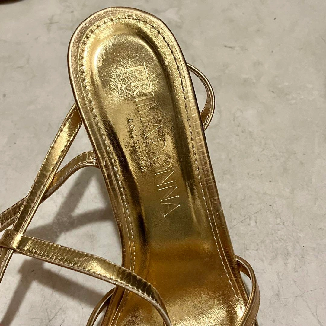 イタリアのPRIMADONNAで購入しました。 ダンス用に購入しましたが、1,2回の使用のみです。 ゴールドが輝くスタイリッシュなデザイン エレガントなストラップデザインが特徴です。特別なイベントやパーティーにぴったりの一足です。 約9cmのヒールは、スタイルを引き立て、脚を美しく見せる効果があります。 表記サイズ 37(ヨーロッパサイズ) 23.5cm (普段24cmの私ですが、丁度サイズでした) - ブランド: PRIMADONNA - 色: ゴールド - スタイル: ハイヒールサンダル - デザイン: ストラップ付き - 素材: 合成皮革 - ヒールの高さ: 約9cm 他にも出品しております。 複数ご購入はお値引きいたします。 宜しくお願いします ご希望の方はお気軽にご連絡ください。