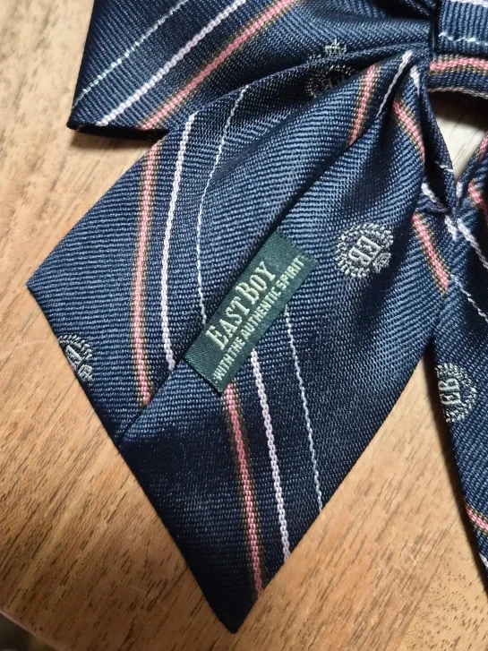 イーストボーイのスクールリボンです。 小学校の卒業式に1度着用しました。 ・ブランド:イーストボーイ ・色:紺色、ストライプ柄 ・状態:使用感少なめ 中古品であることをご了承ください。