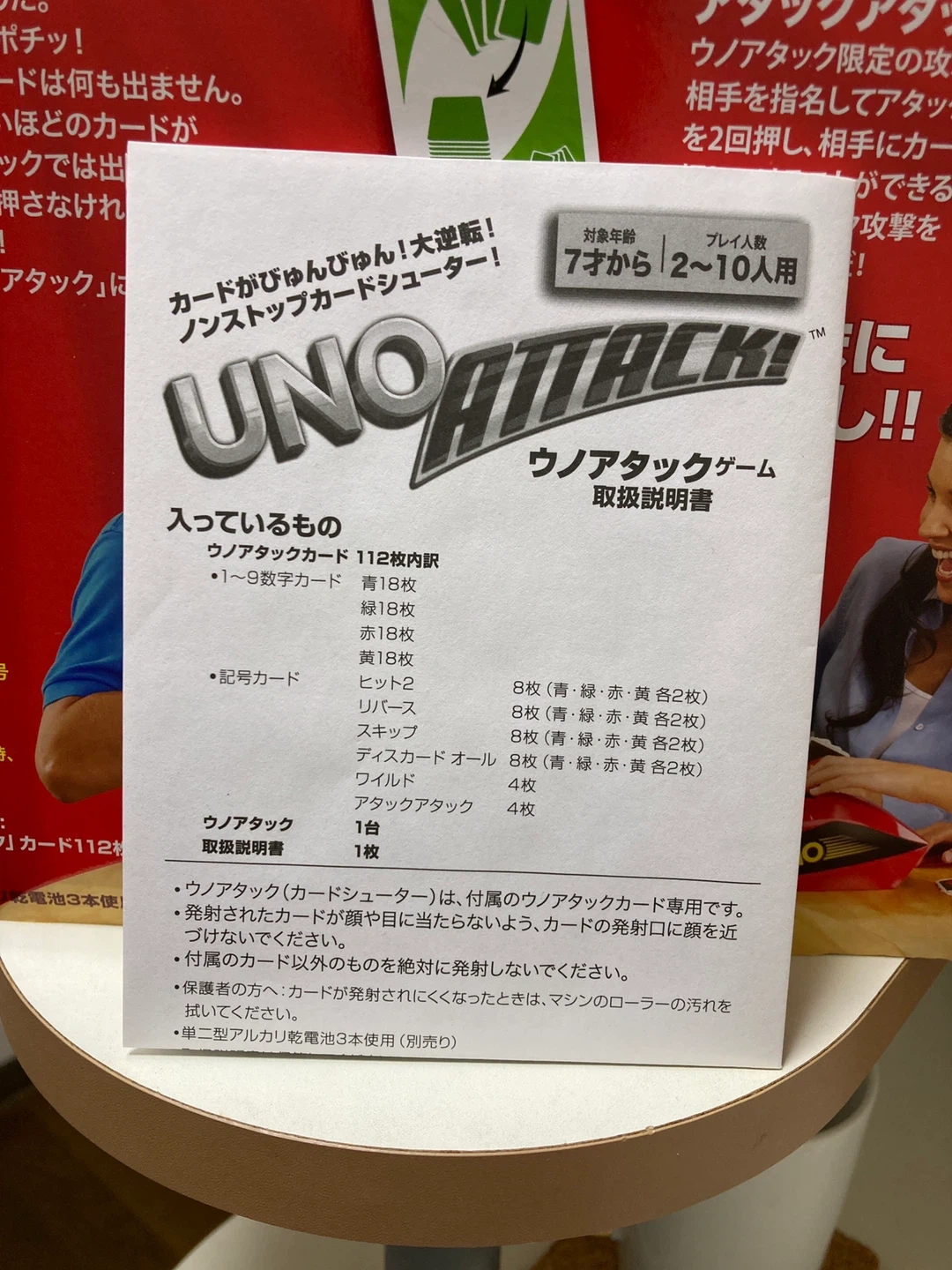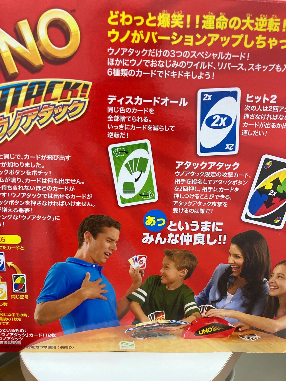 ウノアタックのカードゲームです ・対象年齢:7歳から ・プレイ人数:2~10人用 ・カード枚数:112枚 ・取扱説明書 ・単二電池4本付 中身確認の為に開封しました。箱に傷がありますが未使用品です。