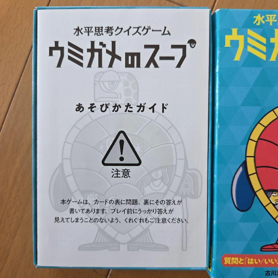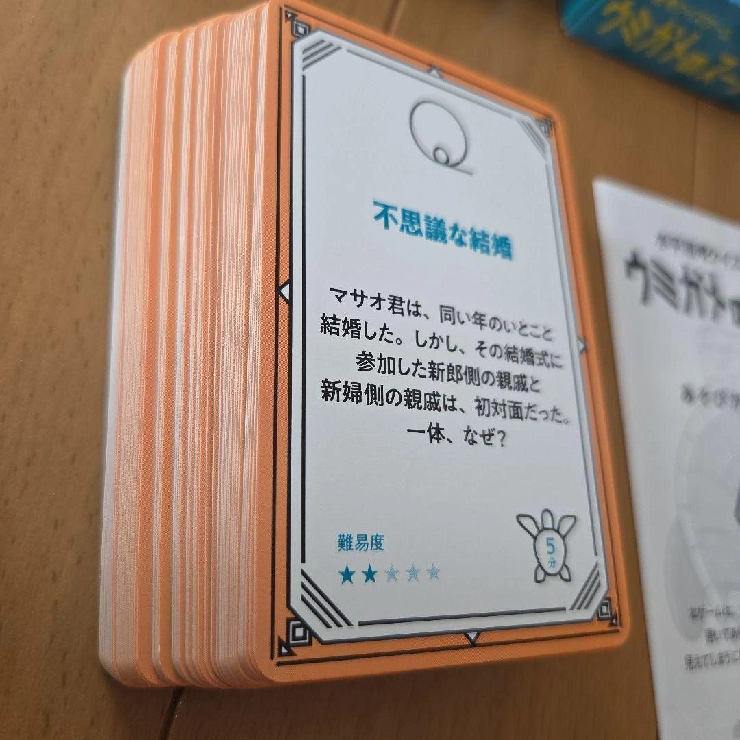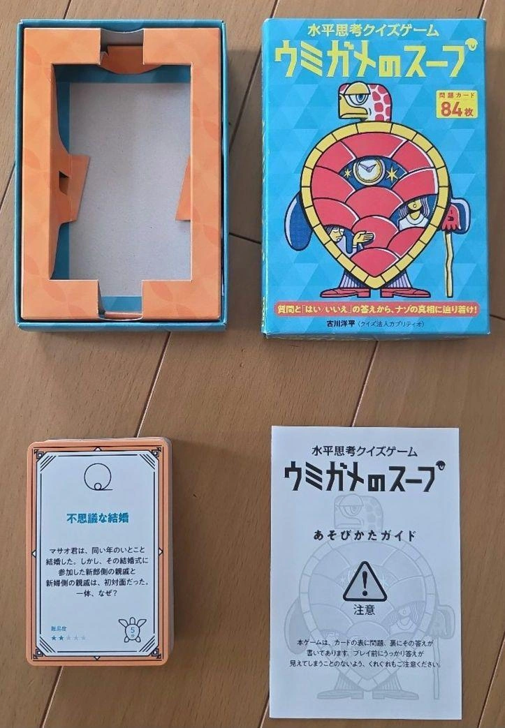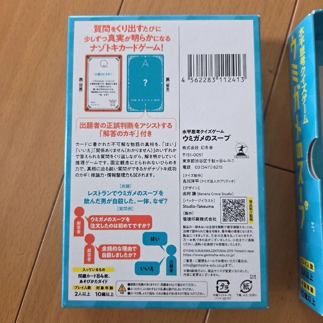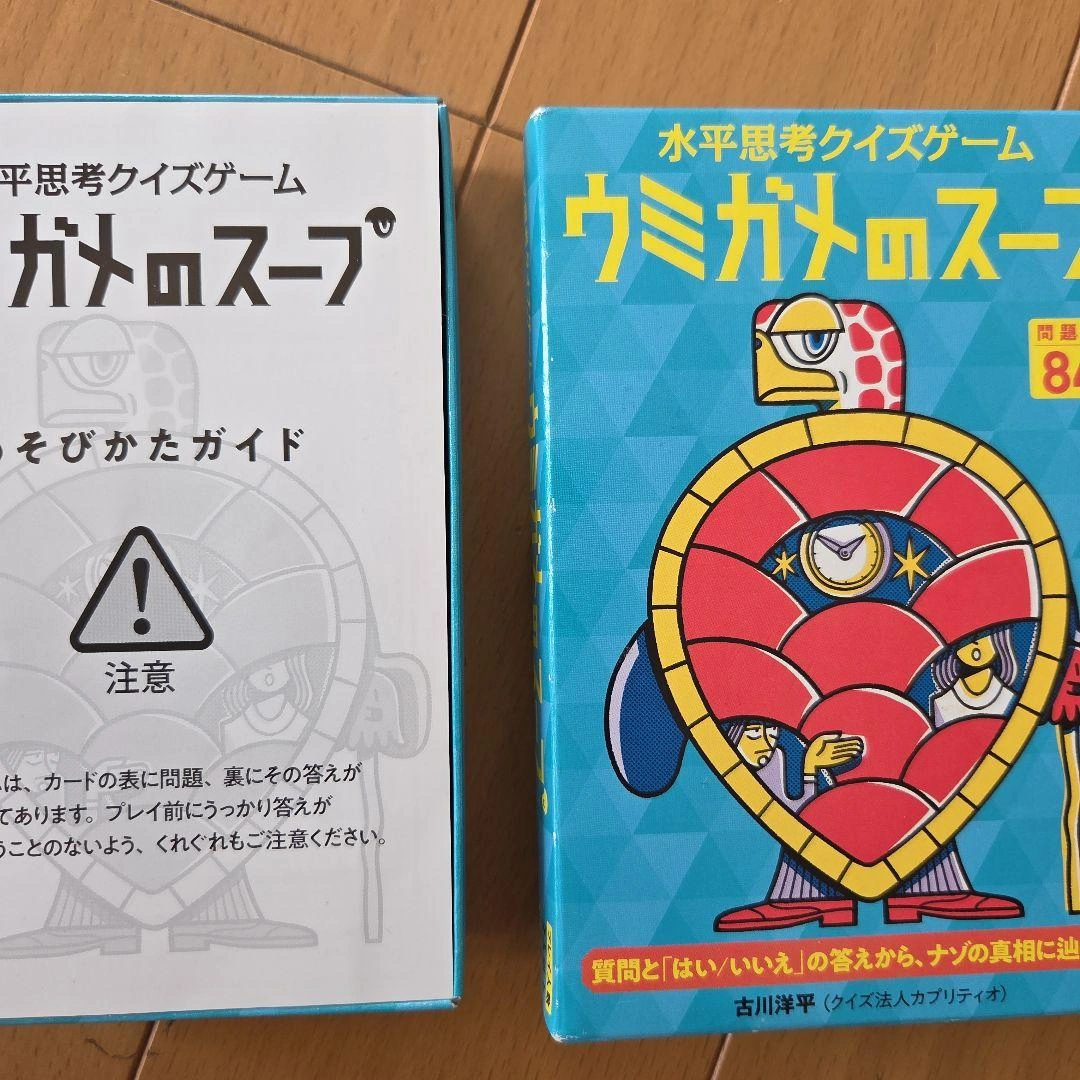 ご覧いただき、ありがとうございます。 【ウミガメのスープ】水平思考クイズカードゲーム/問題カード84枚入りです! 一度使用済みの商品です。 箱や外装に多少のスレやキズはありますが、 カードなど中身は比較的きれいな状態です。 (写真13.16.17.18) 84枚の問題カードと、解答用の「カギ」カード付きで、何度でも楽しめるナゾトキ系カードゲームです。 「はい」「いいえ」で答えられる質問を通して、少しずつ真相に迫っていく水平思考クイズが楽しめます。 おうち時間やパーティーにもぴったりです! ・中古品のため、完璧な状態をお求めの方はご遠慮ください ・箱にやや使用感あり(写真をご確認ください) #ウミガメのスープ #カードゲーム #水平思考クイズ #ナゾトキ #ボードゲーム #パーティーゲーム #中古美品 ご希望の方はお気軽にご連絡ください。