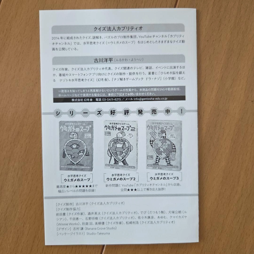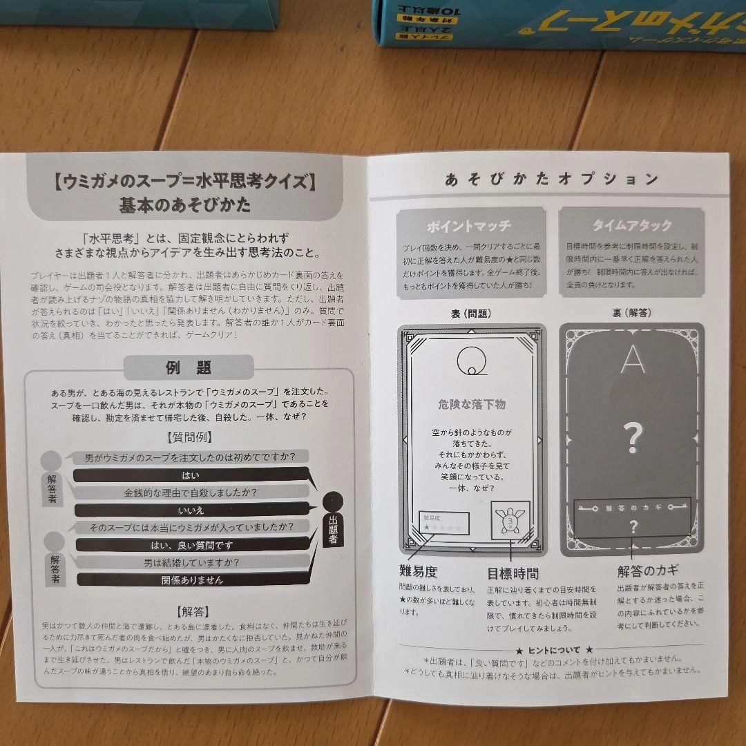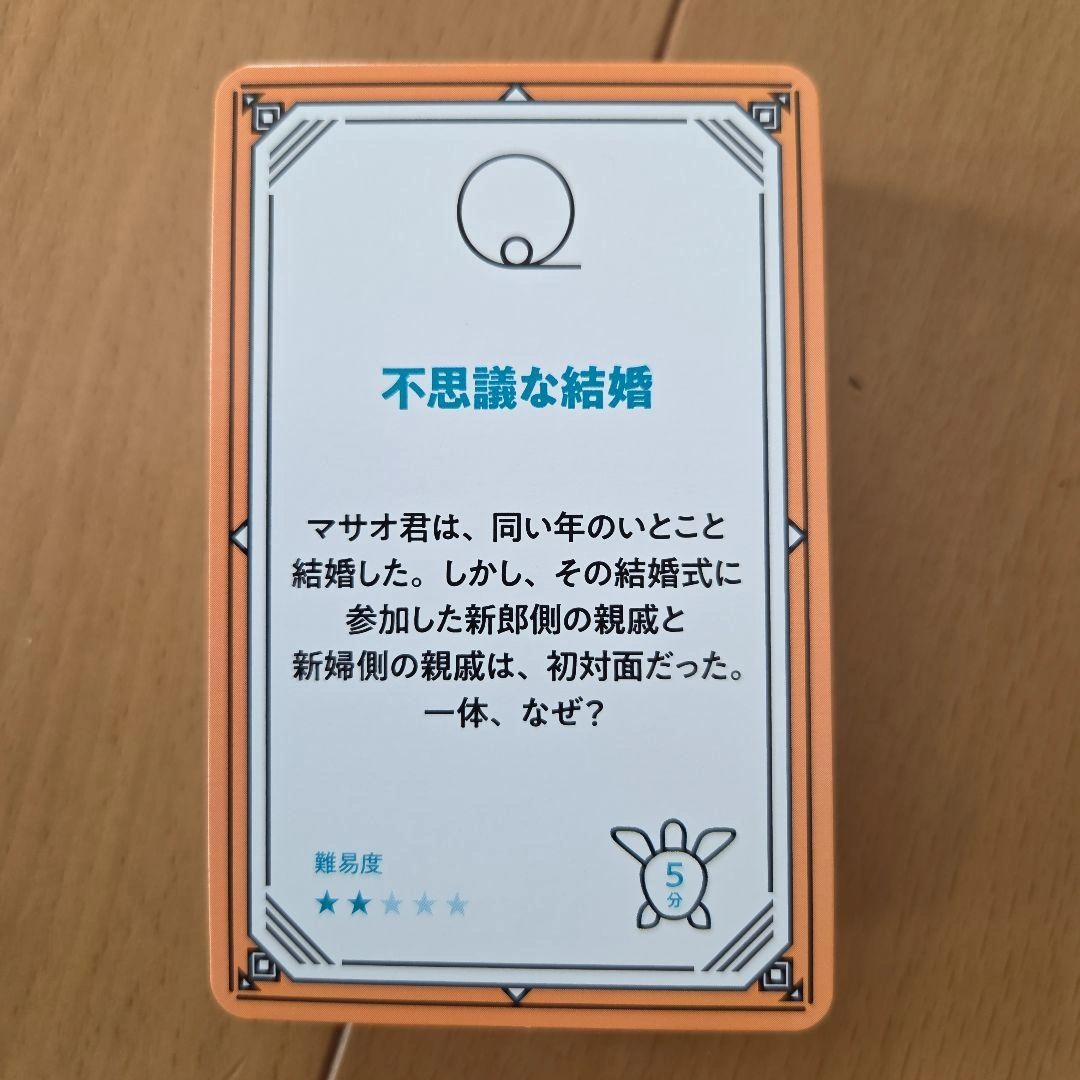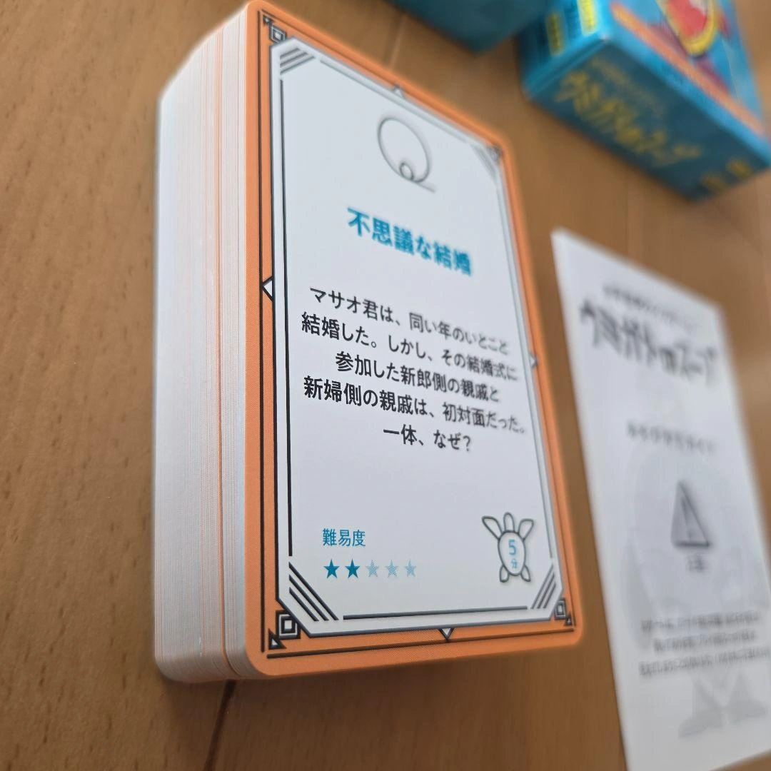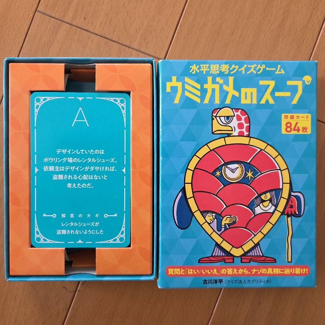 ご覧いただき、ありがとうございます。 【ウミガメのスープ】水平思考クイズカードゲーム/問題カード84枚入りです! 一度使用済みの商品です。 箱や外装に多少のスレやキズはありますが、 カードなど中身は比較的きれいな状態です。 (写真13.16.17.18) 84枚の問題カードと、解答用の「カギ」カード付きで、何度でも楽しめるナゾトキ系カードゲームです。 「はい」「いいえ」で答えられる質問を通して、少しずつ真相に迫っていく水平思考クイズが楽しめます。 おうち時間やパーティーにもぴったりです! ・中古品のため、完璧な状態をお求めの方はご遠慮ください ・箱にやや使用感あり(写真をご確認ください) #ウミガメのスープ #カードゲーム #水平思考クイズ #ナゾトキ #ボードゲーム #パーティーゲーム #中古美品 ご希望の方はお気軽にご連絡ください。