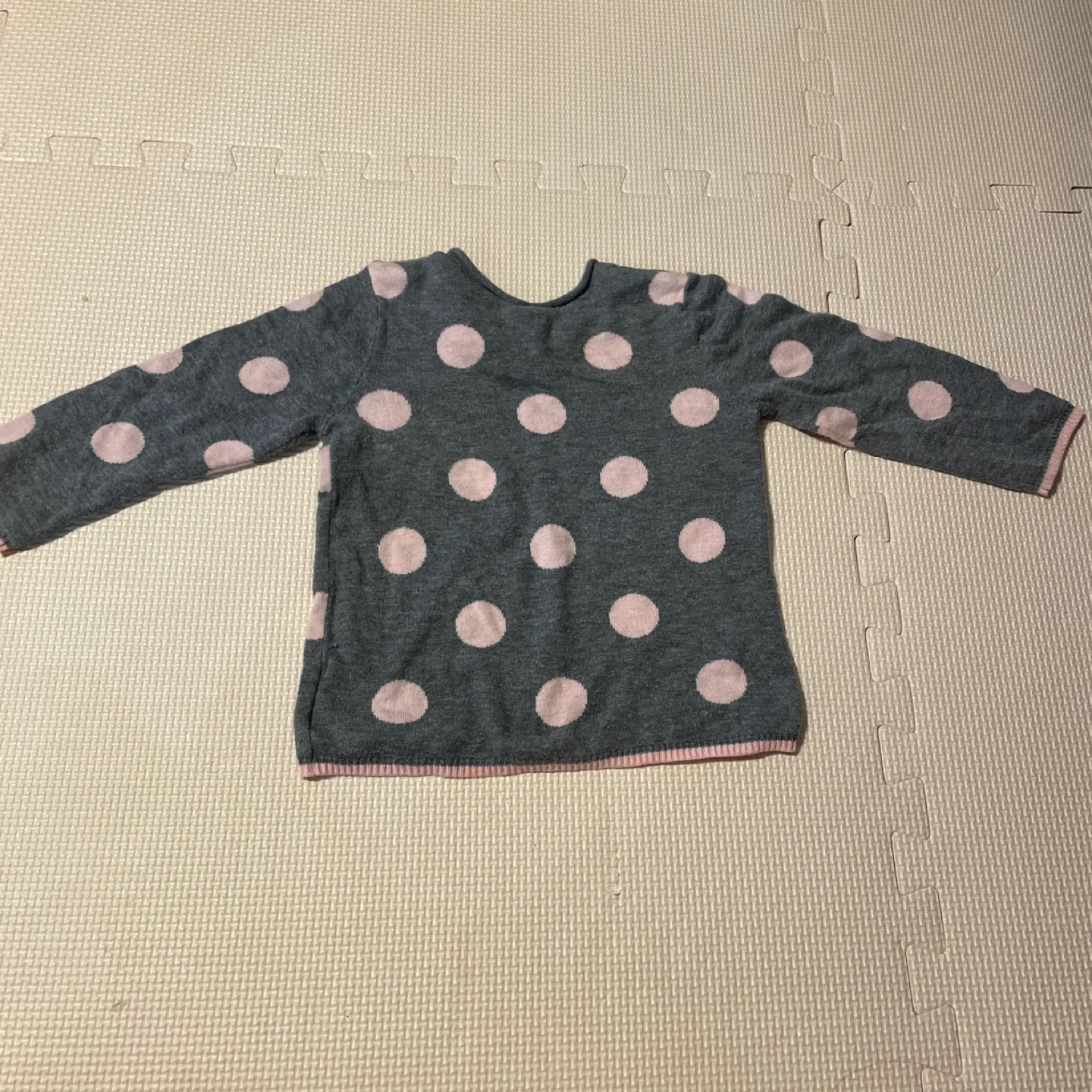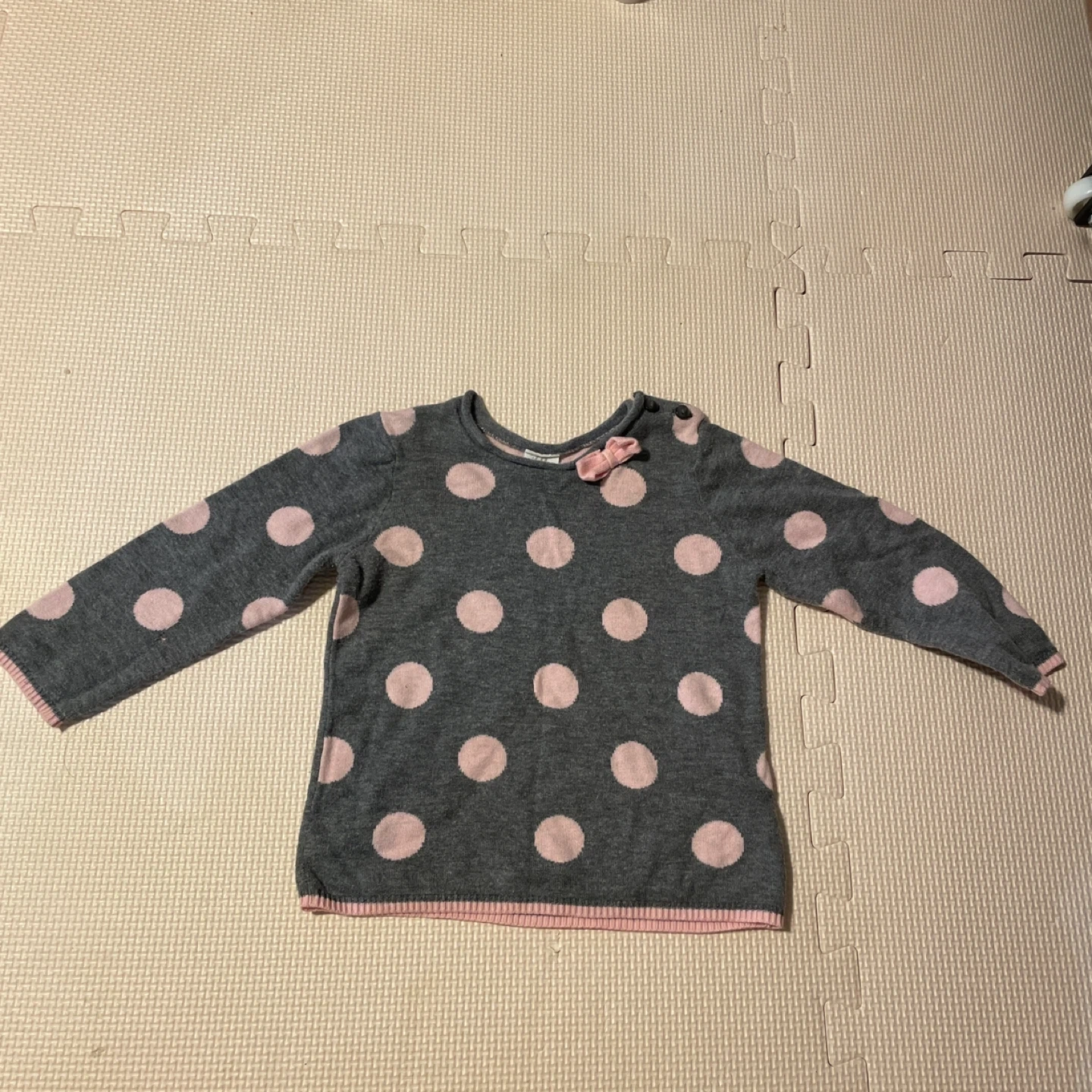 グレーのドット柄ニットセーター、肩ボタン付き9〜12monthサイズ。 毛羽立ちなどありますので写真でご確認ください。 - ブランド: H&M - サイズ: 80.90 - 色: グレー/ピンク - デザイン: ドット柄 - 特徴: ボタン付きの襟元、リボン付き - 素材: ニット 新丸子駅または武蔵小杉駅での取引も可能です。