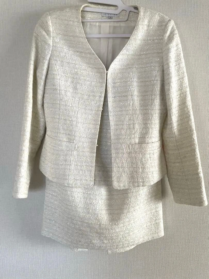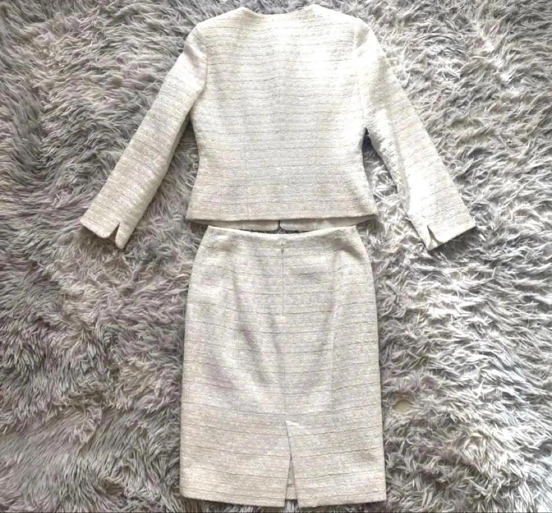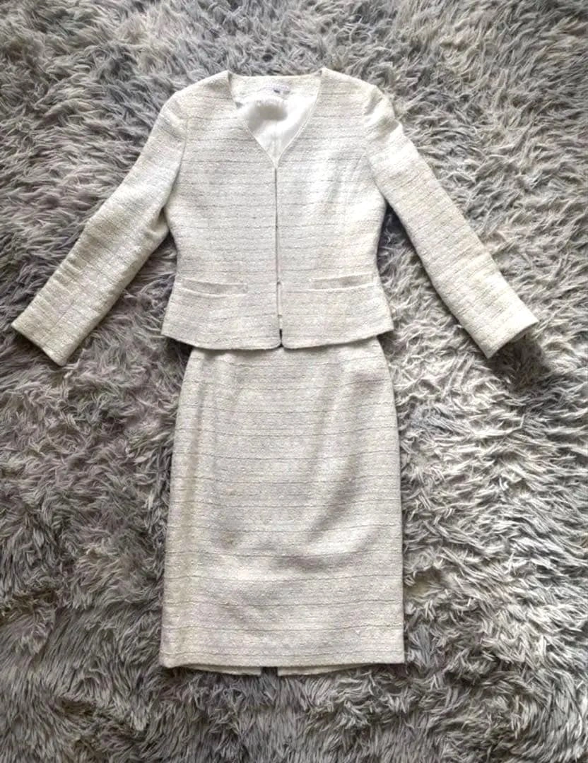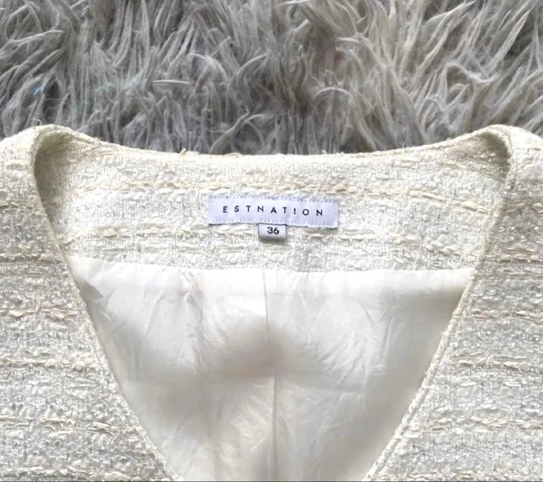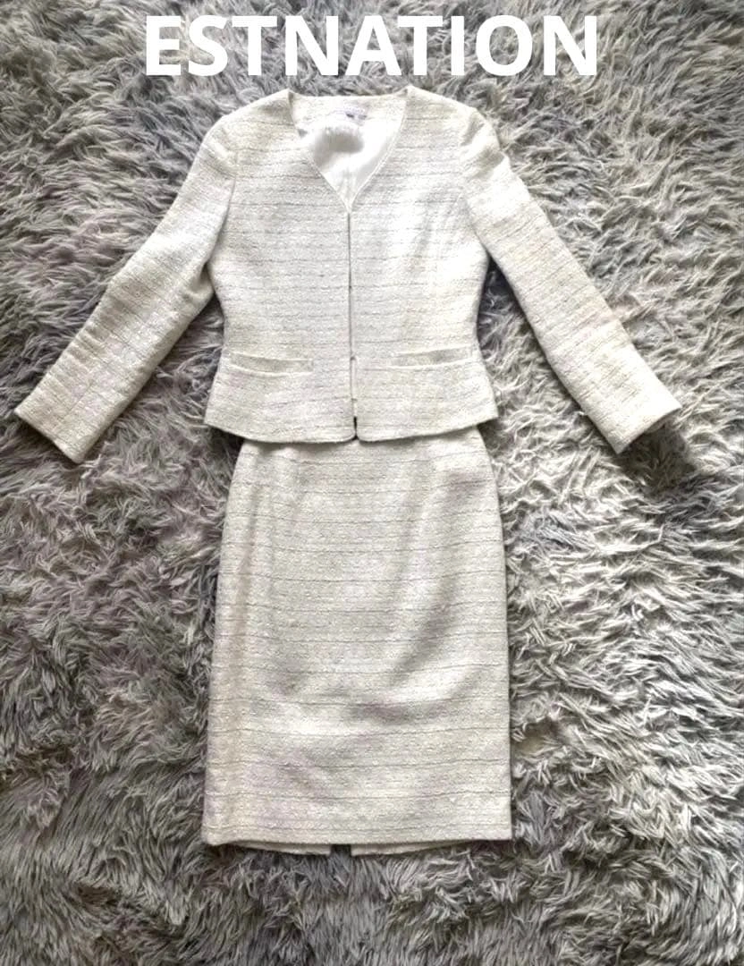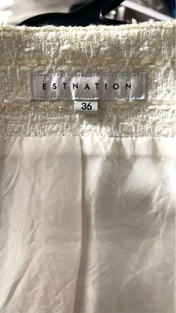 エストネーションのセットアップスーツです。 全体的には白に見えますがベージュも混じったツイードです。 卒業式や入学式などのイベントにも通勤にもおすすめです 目立った傷や汚れはありません。 ツイードなので少しほころんでいる部分がございますが、生地の特性上、目立ちません。 様々な角度から写真を掲載しておきますのでご確認くださいませ。 上→ノーカラージャケット ・ホック3 ・ポケット2 ・腕のスリットあり(折り返して7部丈で着ることが可能) ・肩幅 37 ・身幅(脇〜脇) 43 ・着丈 49.5 ・腕 54.5(折り返さない場合) 下→タイトスカート ・裏地あり ・後ろ中央スリットあり ・ウエスト 33.5 ・着丈 56 ※採寸は全て平置きで素人採寸ですのであらかじめご了承ください。 中古品であることをご理解の上ご購入頂けますと幸いです ご不明な点などございましたらコメントくださいませ