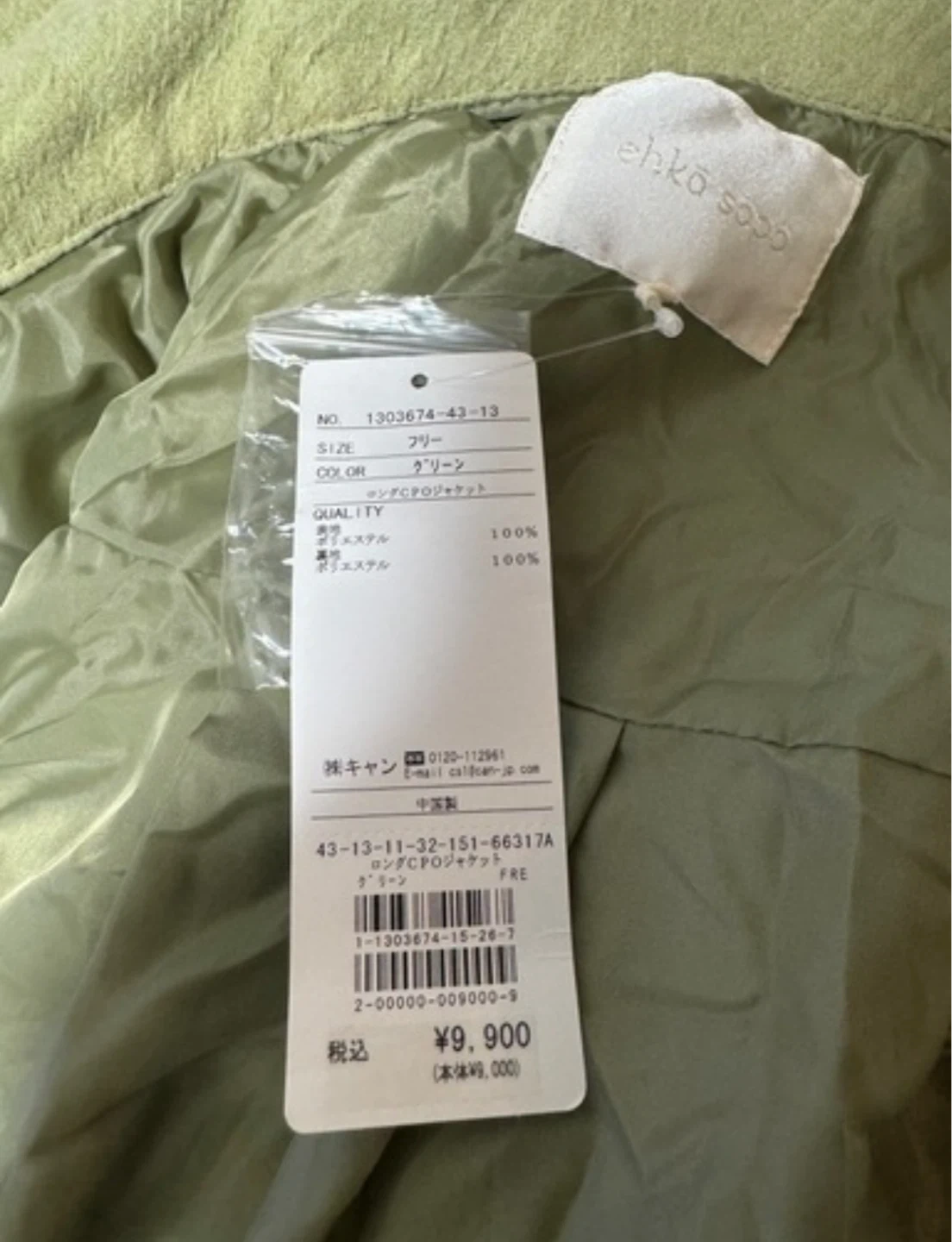 あたたかさエヘカソポのジャケットです。 【情報】 ブランド:エヘカソポ サイズ:フリー カラー:グリーン 品質:ポリエステル100% 定価:9,900円 タグ付き、新品未使用品です。