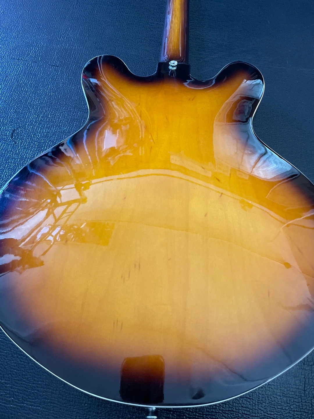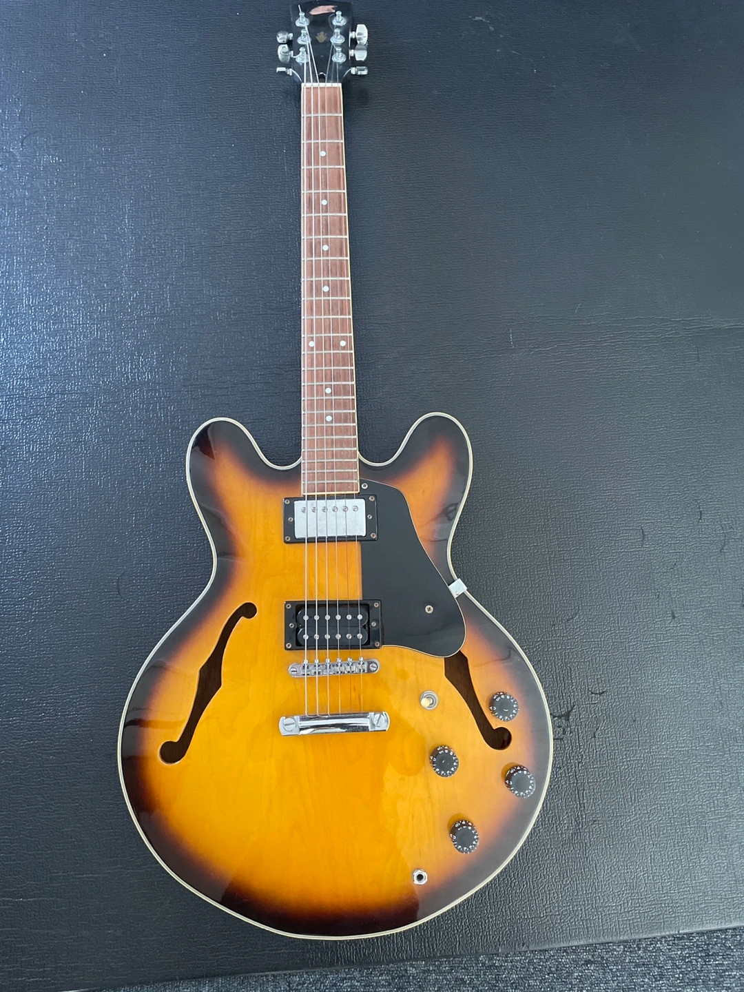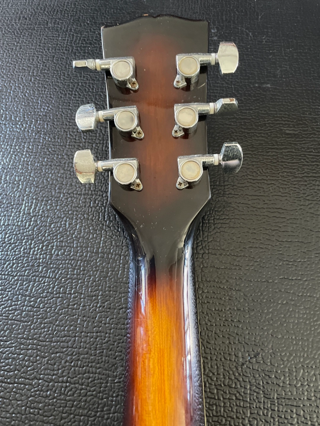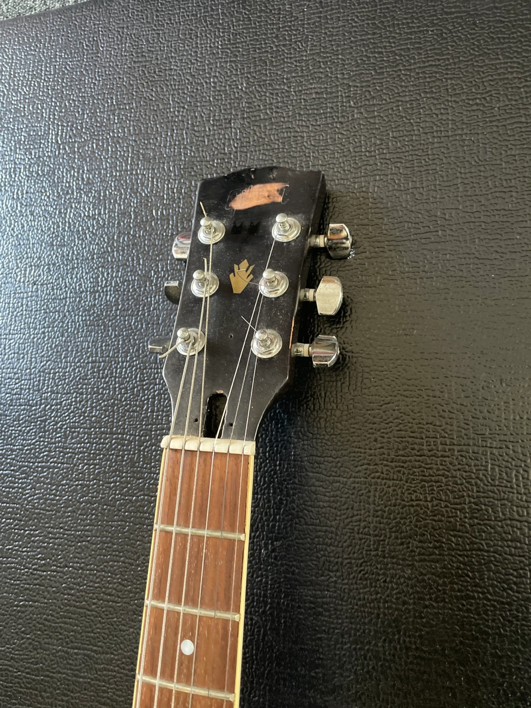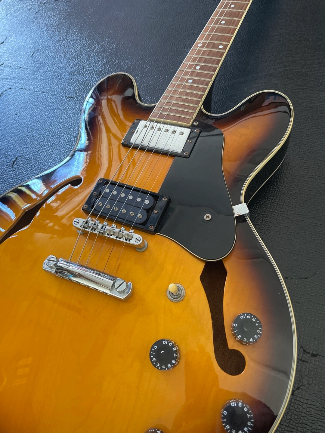 ギブソンES335モデルのギター 前の持ち主が、タグを剥がしヘッドのロゴも消してギブソンに寄せようとして、途中で辞めた作品です。 メーカー不明ですが、ヘッドがギブソンモデル時代の貴重品です メーカー名は消されています。 音はきちんと出ます。 フレットもまだまだ残ってます。 ネックの剃りも心配なし。 機材整理の為売ります。