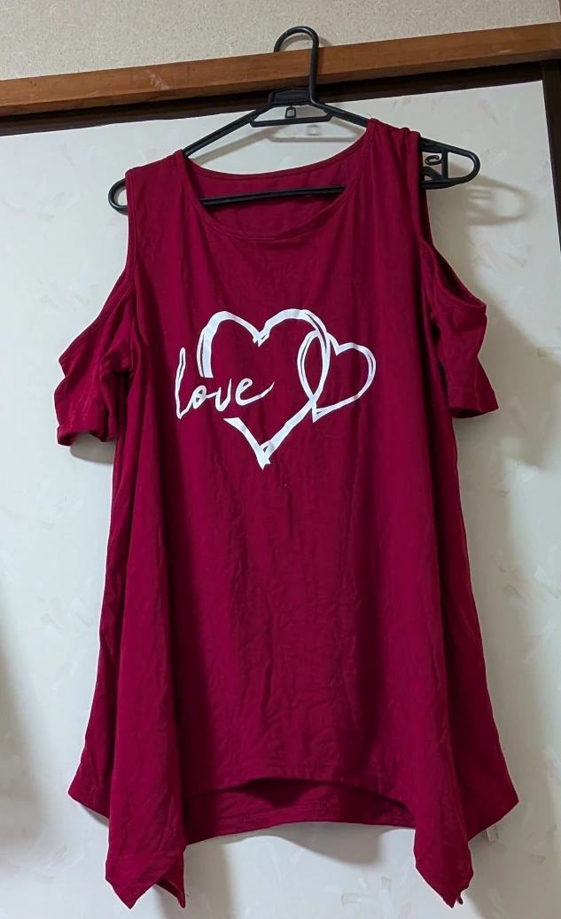 エムリーローズのカットアウトTシャツです。 ・色:ワインレッド ・デザイン:ハートと「Love」のプリント 安さにひかれてSHEINで買いましたが、Lサイズどころか、LLだと思います。