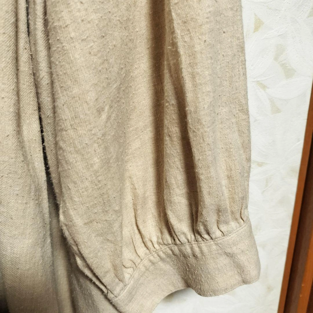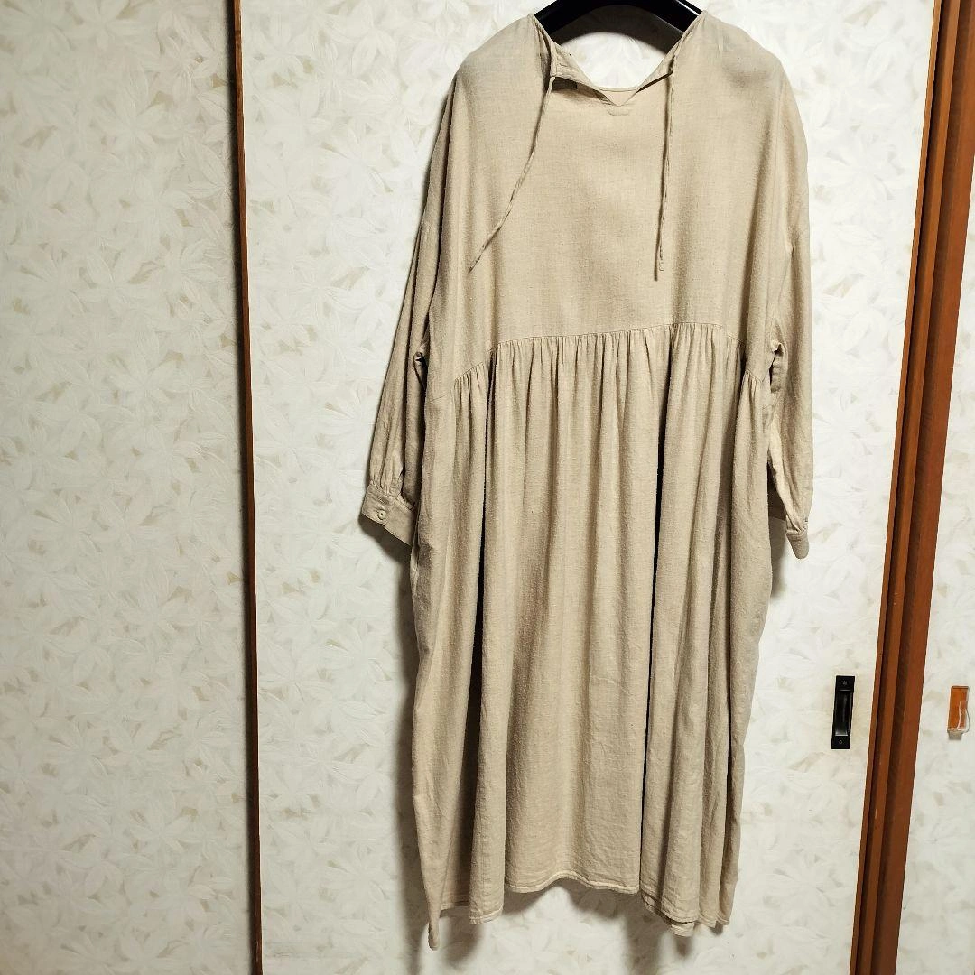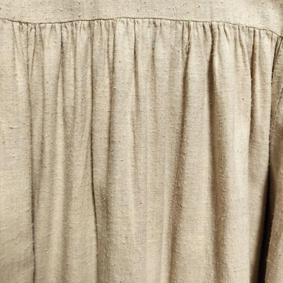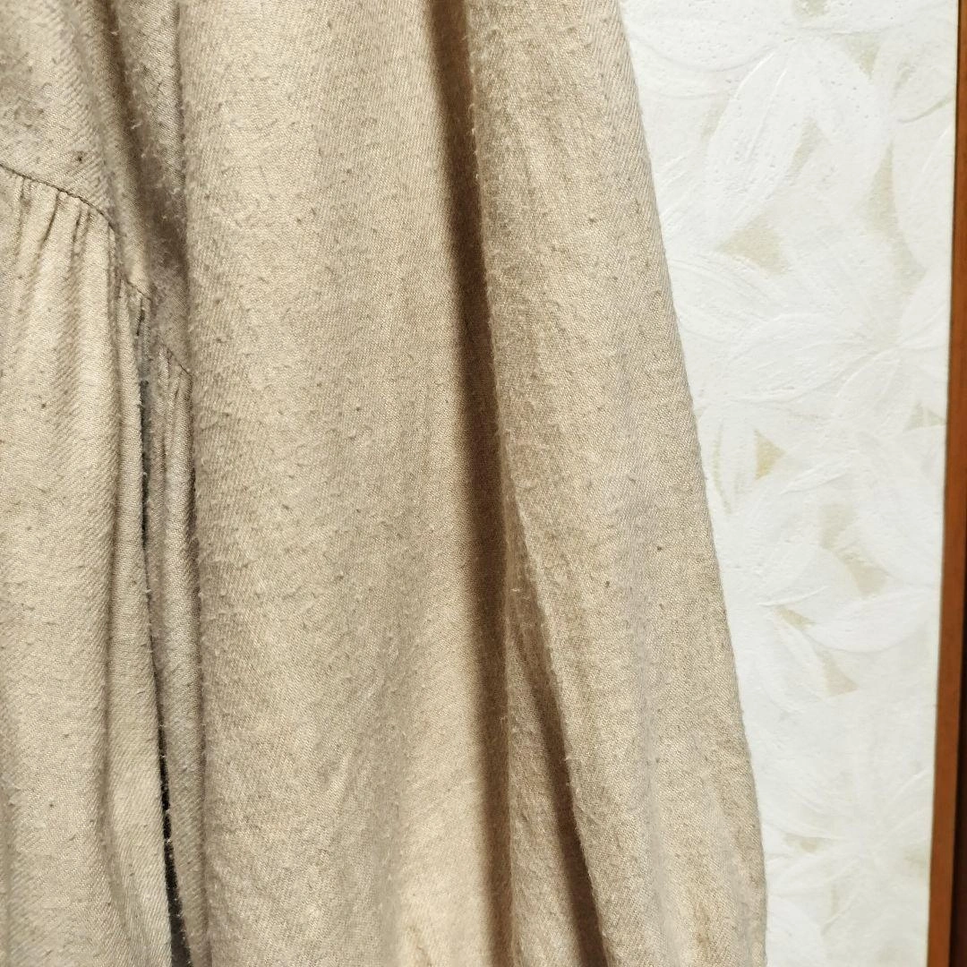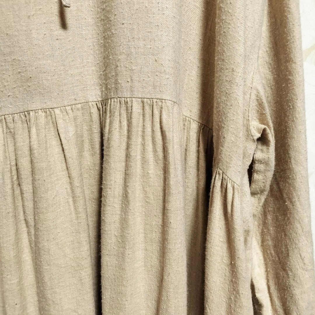 オオカミとフクロウのリネン風ベージュ長袖フレアワンピースです。ギャザー入りデザイン。 - 色: ベージュ - 袖の長さ: 長袖 - デザイン: フレアシルエット - 素材: 綿100% - ディテール: ギャザー入り 右フロント下の裾に黒い染みがあります。 全体的に毛玉がありますが、触り心地はとてもよくまだ着ていただけます。