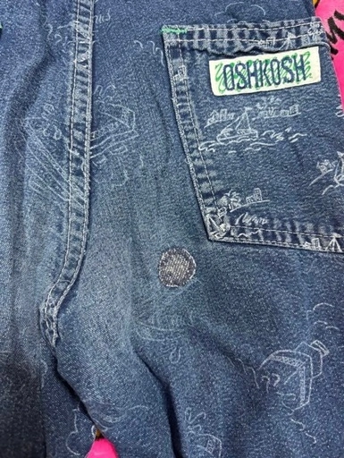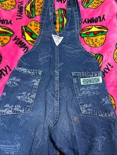 オシュコシュ総柄オーバーオールです。 サイズは90くらいです。 ヴィンテージキッズ古着屋で購入後1回着用しました。 海をモチーフにした船のデザインです。 後ろのポケットにオシュコシュのロゴがあります。 購入時からお尻部分にリペアがあります(3枚目)。 裾がリブになっていて動きやすかったです。 ヴィンテージにご理解ある方、慣れている方、ご希望の方はお気軽にご連絡ください。