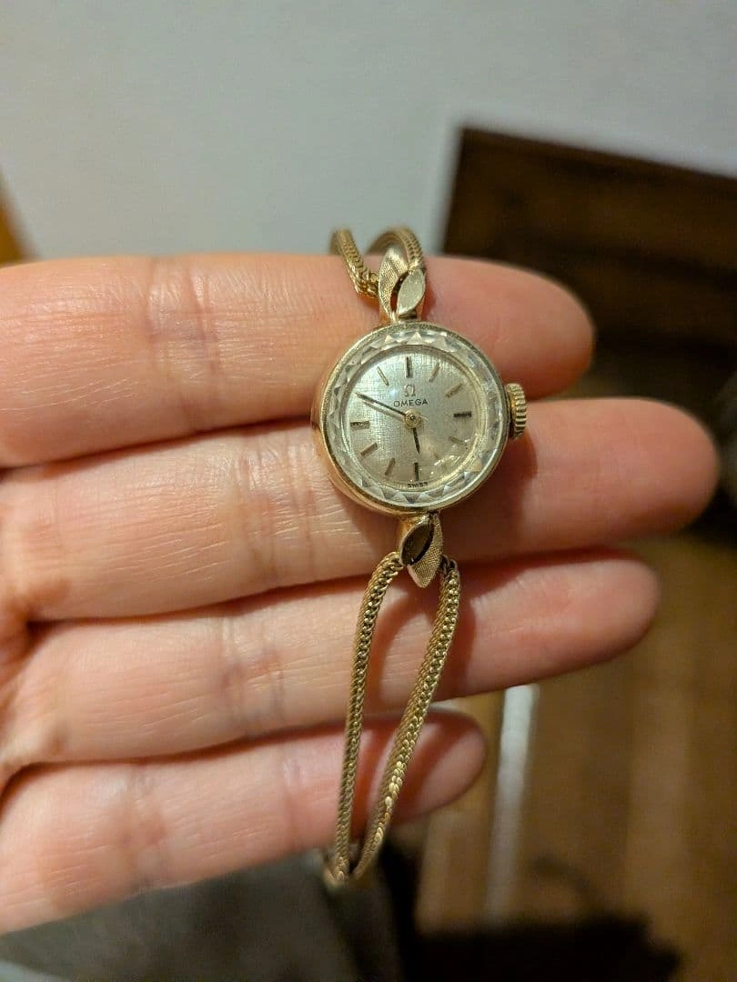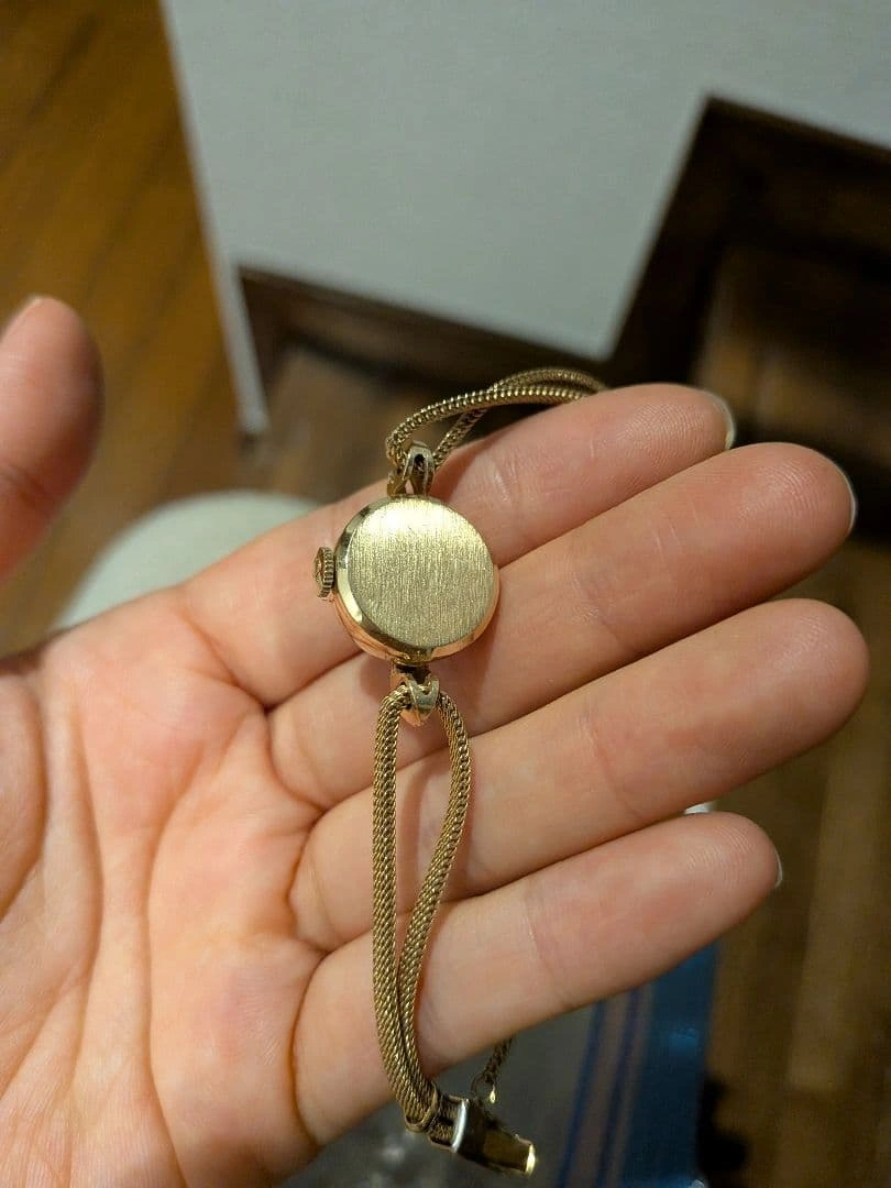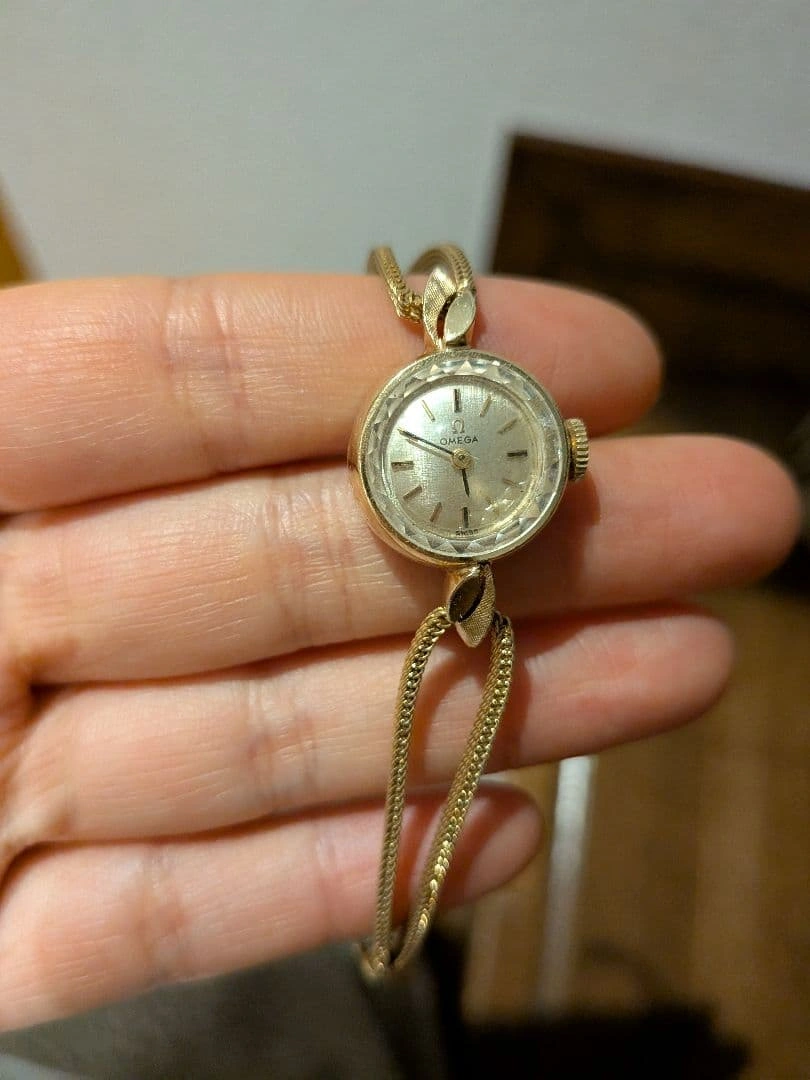 ゴールドのメタルバンドを持つ小型の手巻き時計です。シルバーの文字盤が特徴です。 東京ミッドタウンの中古時計専門店で購入しました。 - 色: ゴールド - デザイン: 手巻き時計 - バンド素材: メタル - 文字盤の色: シルバー - 裏面のデザイン: ブラシ仕上げ - サイズ: 小型 ご覧いただきありがとうございます。 ご希望の方はお気軽にご連絡ください。
