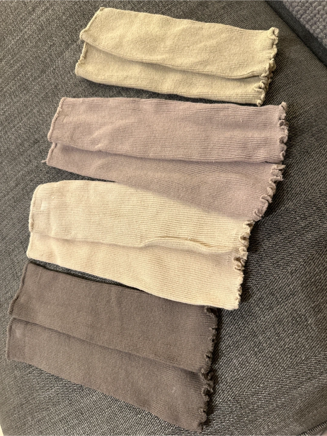 レッグウォーマー4足セットです。 ・色:ベージュ、パープル、オフホワイト、ブラウン ・状態:使用感あり 中古品であることをご了承ください。