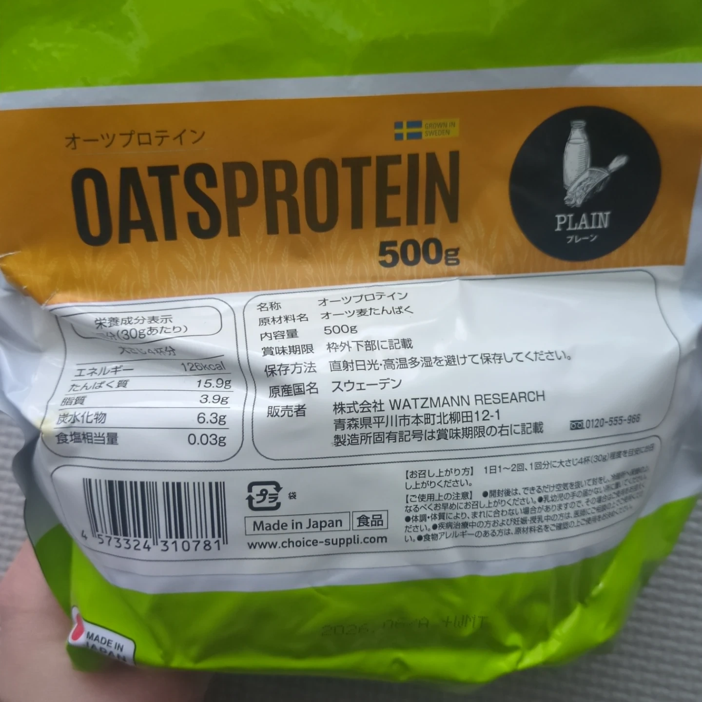 Choice チョイス オーツプロテイン 新品未使用未開封 溝の口駅周辺でお渡し希望です。 以下アマゾンより 100%スウェーデン産 植物性たんぱく質 500g 真空パック 遺伝子組み換え不使用 大豆不使用 ビーガン対応 ダイエット・筋トレ用 プロテインパウダー ブランド Choice Nutrition 風味 プレーン 商品の重量 500 グラム タンパク質 15.9 グラム 【スウェーデン産100%オーツ麦】北欧の厳選された農場で栽培された最高品質のオーツ麦のみを使用。空気と水がきれいなスウェーデンの自然環境が育んだ、栄養豊富で純粋なオーツ麦を、そのままの状態でお届けします。持続可能な農法で育てられた安心・安全な原料です。 【世界初の真空パック製法】鮮度と栄養価を最大限に保つ、世界初かつ日本唯一の真空パック製法を採用。開封後も最後まで新鮮な風味と高い栄養価を維持し、酸化を防ぎます。常に最高品質のプロテインをお楽しみいただけます。 【多様な調理法に対応】マイルドな風味と滑らかな食感が特徴の万能食材。シェイク、スムージー、ヨーグルト、ベーキング、ソースなど、様々な料理に簡単に取り入れられます。毎日の食事をより栄養豊富に、そしてより美味しくアップグレードできます。 【高たんぱく質・低脂肪】1食分あたり16gの高品質たんぱく質を含有し、かつ低脂肪。効率的なたんぱく質摂取、筋肉増強、ダイエットに最適です。食物繊維も豊富で、腸内環境の改善にも貢献。バランスの取れた栄養プロファイルで、健康的な体作りをサポートします。 【安心・安全な原料】遺伝子組み換え作物や大豆不使用。アレルギー反応の心配が少なく、幅広い方に安心してお使いいただけます。厳格な品質管理と衛生基準のもとで製造され、添加物や人工甘味料も不使用。自然由来の純粋なプロテインをお届けします。