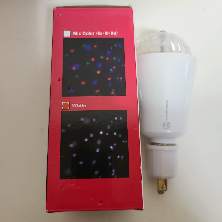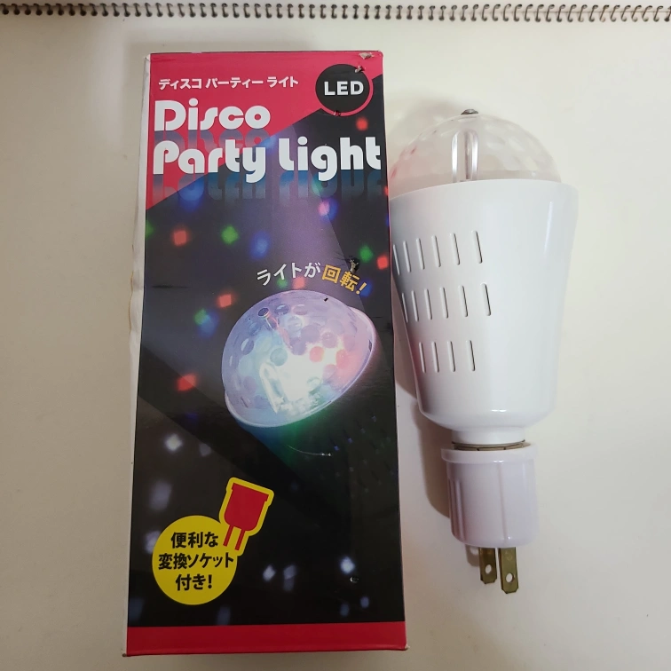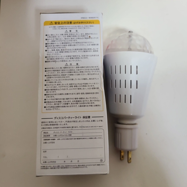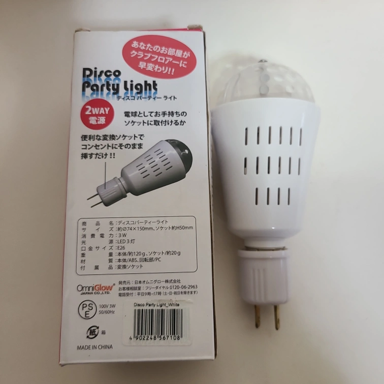 ディスコパーティーライトです 【情報】 ブランド:オムニグロー 商品名:ディスコパーティーライト サイズ:約Φ74×H150mm 電源:LED 3W 【状態】 2WAY設計のディスコパーティーライト。 - タイプ: ディスコパーティーライト - LED: 搭載 - カラーモード: /ホワイトカラー - サイズ: H95mm / D60mm - 電源: AC100V / 20W - 特徴: 2WAY設計(手持ちと固定式) 長期保管の為箱はちと古いが電灯は新品同様で作動確認済 ご覧いただきありがとうございます。 【付属品】 変換ソケット 中古品であることご了承ください