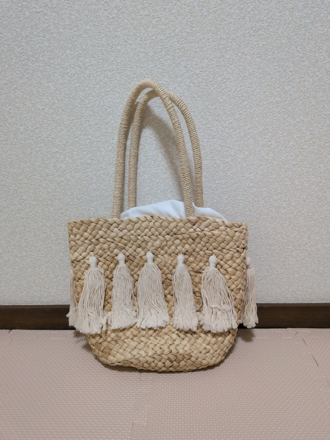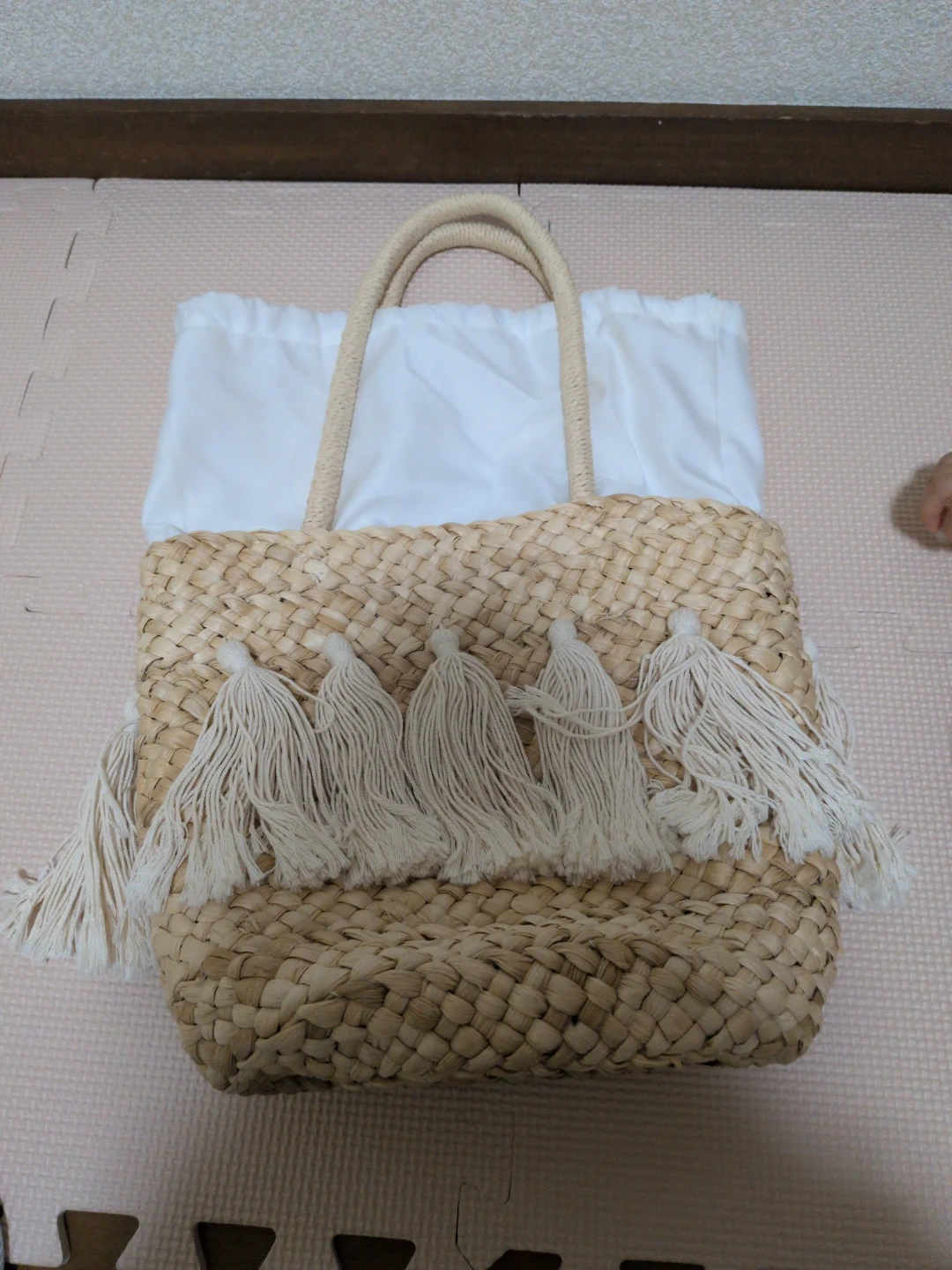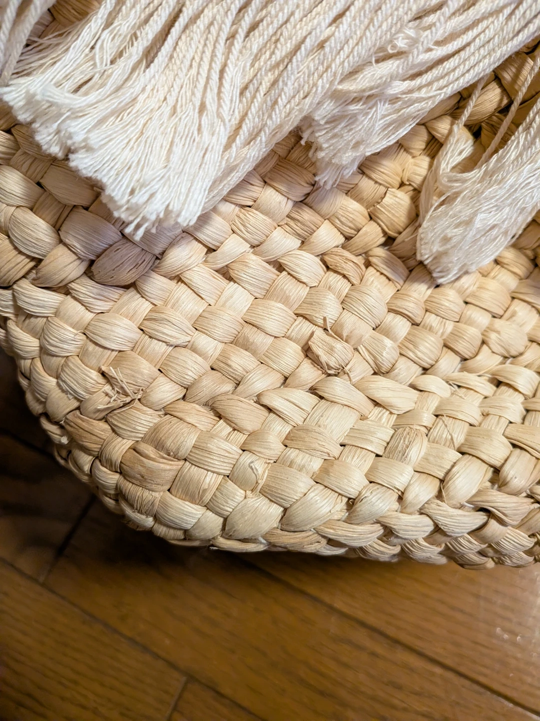 タッセル付きのカゴバッグです! 【情報】 ・カラー:ベージュ ・素材:カゴ素材 ・デザイン:生成色のタッセル付き ・サイズ:縦全長約45cm、持ち手高さ約21cm、      バック高さ約23cm、横幅約30cm、      マチ約9cm ・状態:3回ほど使用しました。     カゴの部分、数カ所ほつれがあります(写真4〜8枚目参照) 自宅保管、中古品であることご了承ください。 通販サイトにて購入しました!3回ほど使用しその後出番なくずっとしまいっぱなしでした。 改めて見ると、数カ所ほつれがあります。 カバンの中は側面に小さめのポケットがついています! ビビッとこられた方いらっしゃればぜひメッセージお願いします^^ 現物を見て、思ったものと違うようならばキャンセルも可能です! 随時出品しますので、まとめてのご購入もご検討ください(^^)