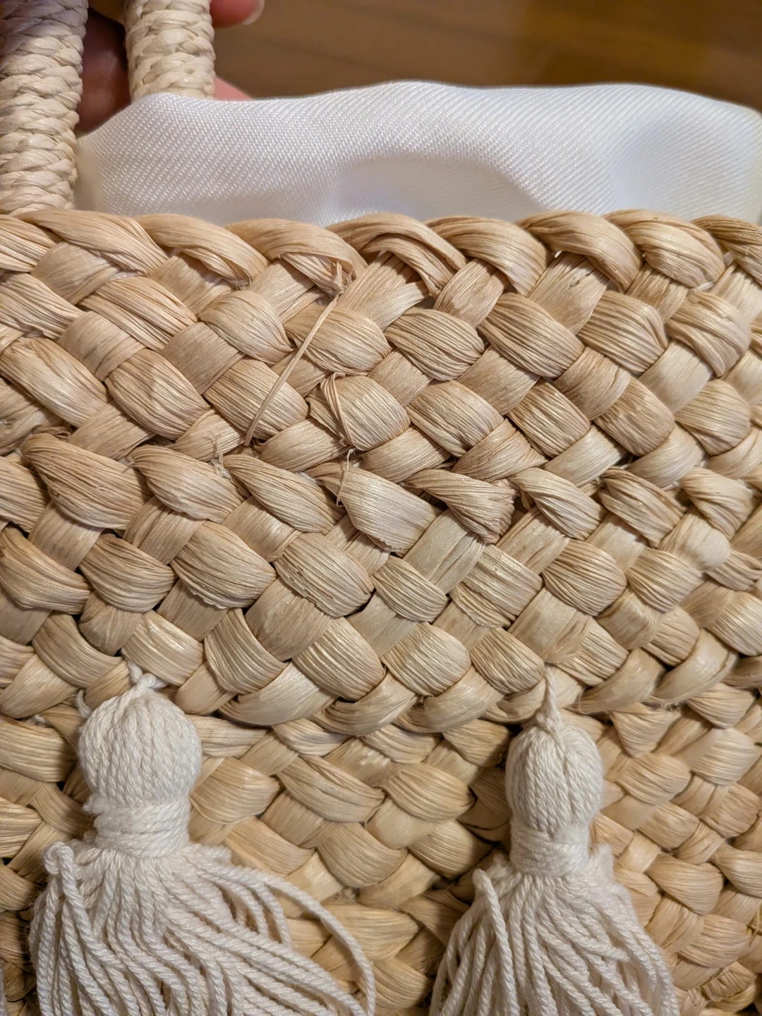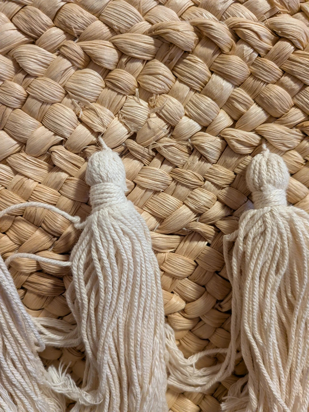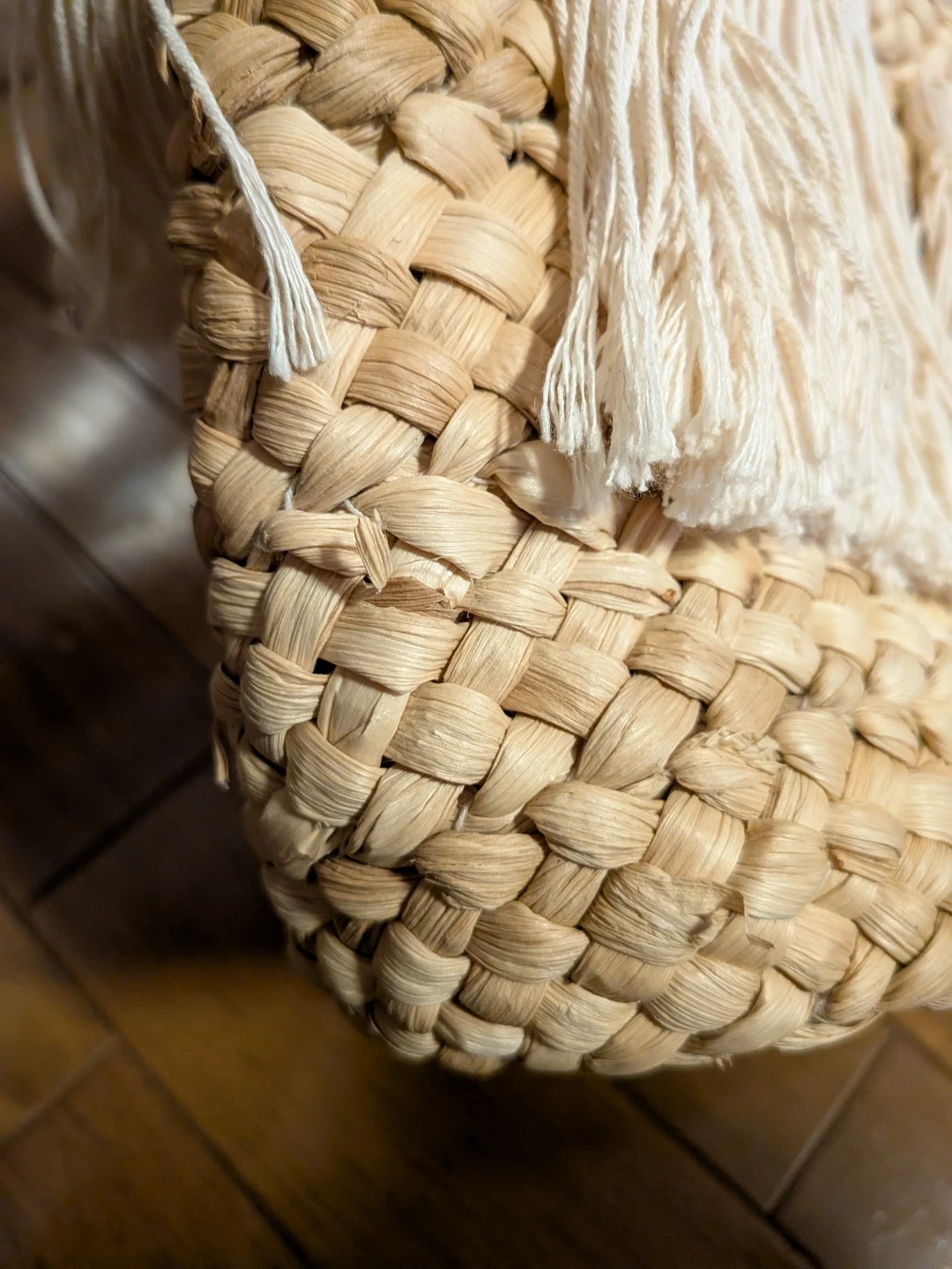 タッセル付きのカゴバッグです! 【情報】 ・カラー:ベージュ ・素材:カゴ素材 ・デザイン:生成色のタッセル付き ・サイズ:縦全長約45cm、持ち手高さ約21cm、      バック高さ約23cm、横幅約30cm、      マチ約9cm ・状態:3回ほど使用しました。     カゴの部分、数カ所ほつれがあります(写真4〜8枚目参照) 自宅保管、中古品であることご了承ください。 通販サイトにて購入しました!3回ほど使用しその後出番なくずっとしまいっぱなしでした。 改めて見ると、数カ所ほつれがあります。 カバンの中は側面に小さめのポケットがついています! ビビッとこられた方いらっしゃればぜひメッセージお願いします^^ 現物を見て、思ったものと違うようならばキャンセルも可能です! 随時出品しますので、まとめてのご購入もご検討ください(^^)