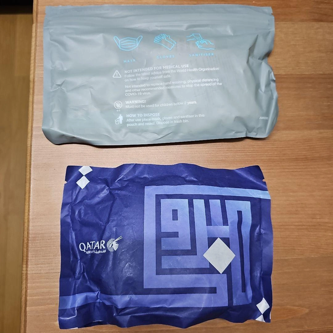 ご覧いただきありがとうございます。 カタール航空搭乗時にいただいたトラベルキット2点です。未開封ですが、中身はマスク、ゴム手袋、ハンドジェル、靴下、歯ブラシではないかと思います。 青い袋は紙製で、しわがあるのでご了承いただける方のみお願いいたします。