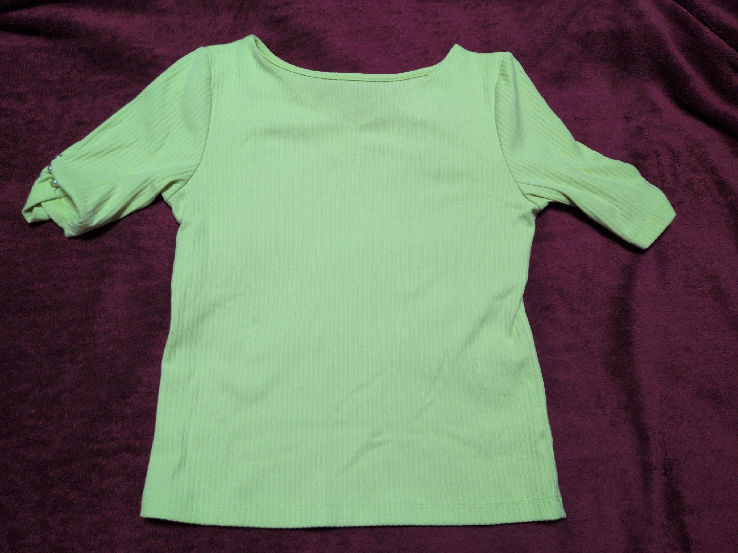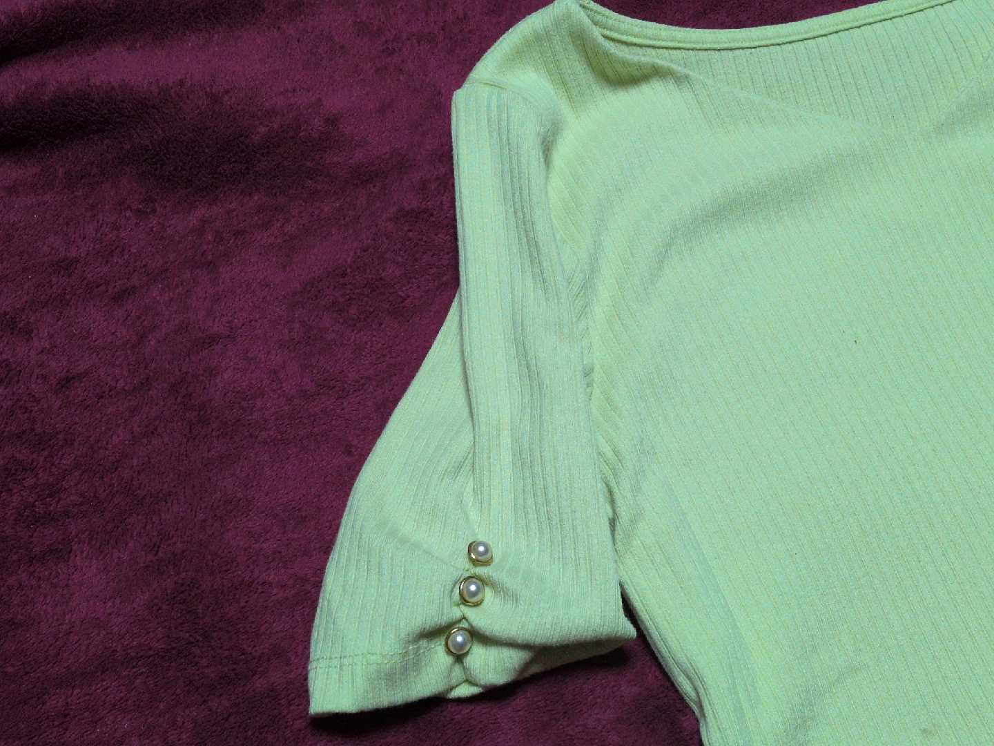 カットソーです ・カラー:ライトグリーン ・サイズ:M(38/M) ・素材:ポリエステル73%、レーヨン24%、ポリウレタン3% ・袖にパールのような装飾があります 春夏に良く着ました。 中古品であることご了承ください。