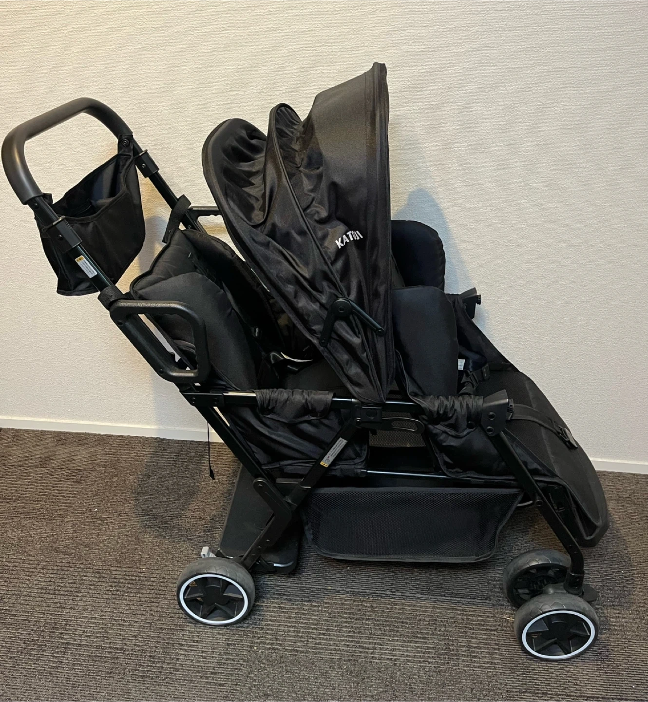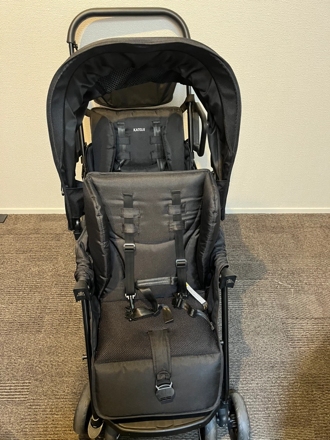 ・ブランド カトージ ・カラー ブラック ・タイプ ダブルベビーカー 取替用リアシートとレインカバー付きです。 公式サイトで34800円で購入しました。 レインカバーについては未使用です。 また希望する方には別売りの日除カバー2つもお付けします。 2歳差の子供用に購入したのですが子供があまり乗ってくれず使用回数は2回です。