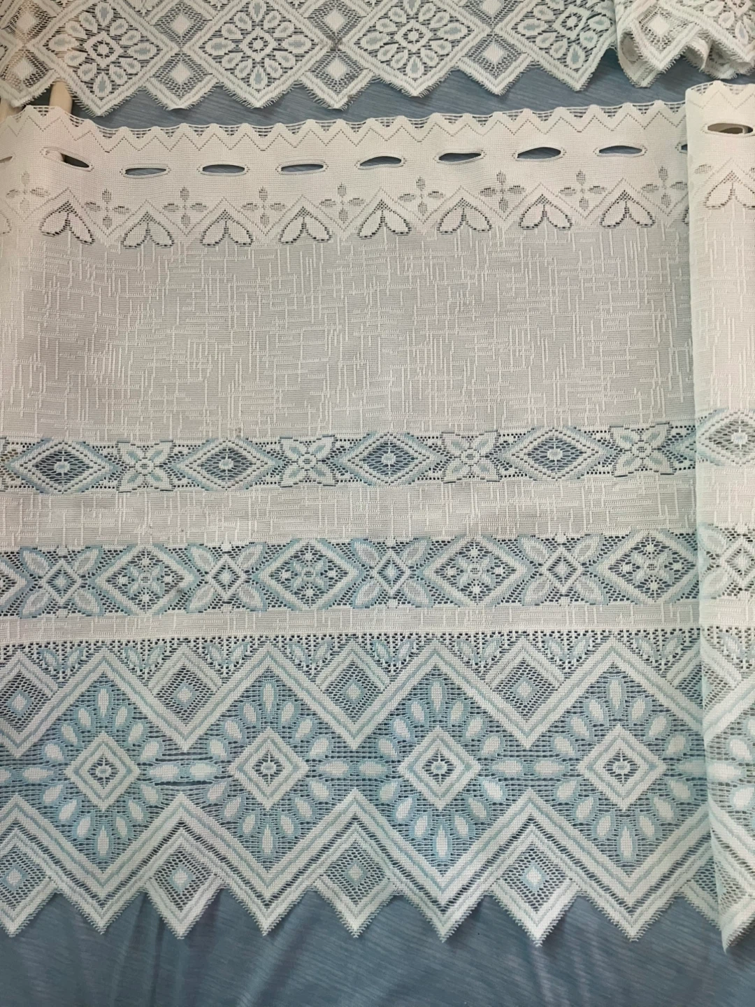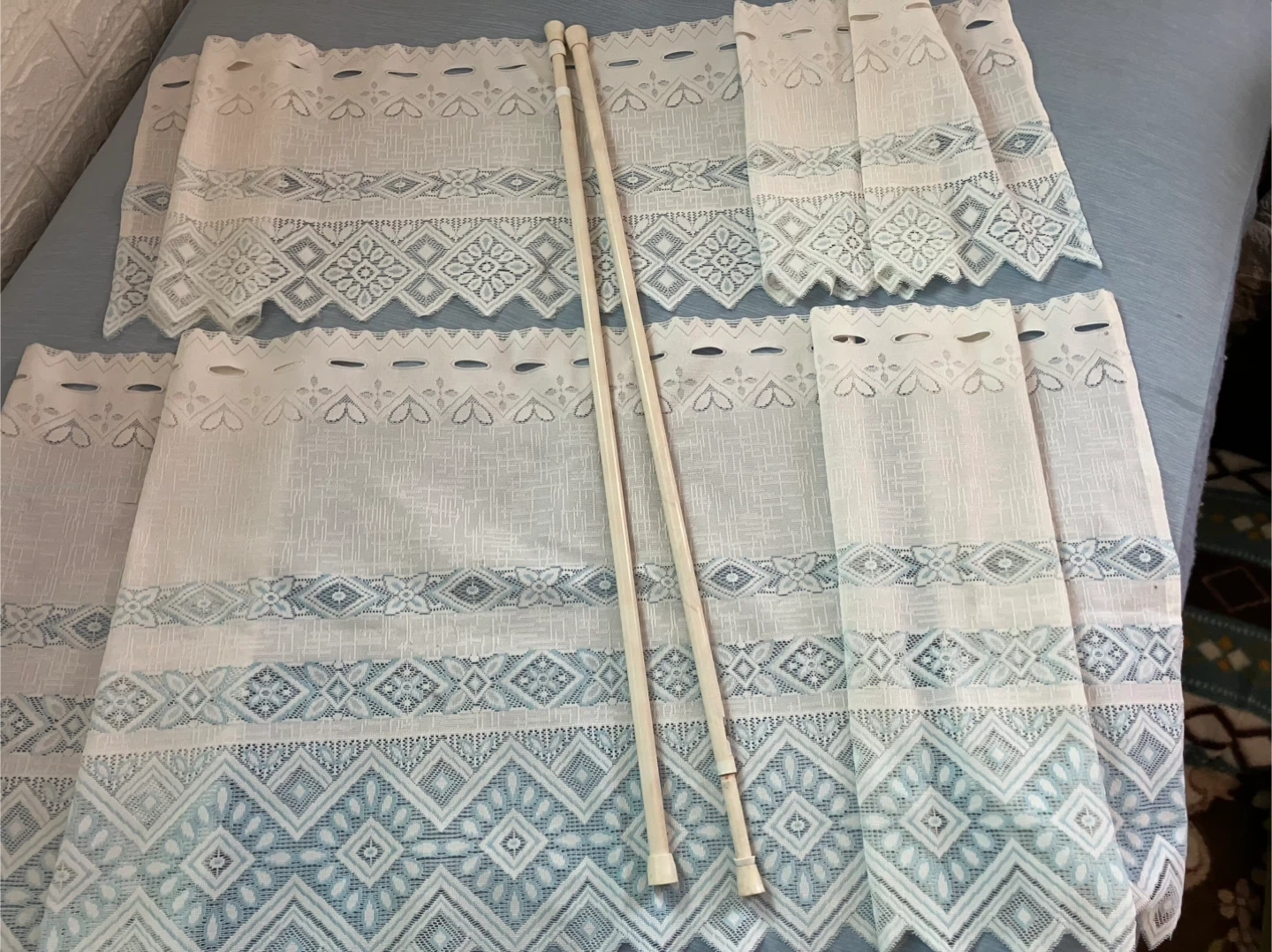 カフェカーテンです。2枚 ・白色、模様入り ・2枚セット 50x150cm 29x150cm 突っ張り棒 2本 すぐに使えます。 中古品ですが洗ってあります。 他にも色々出しています。