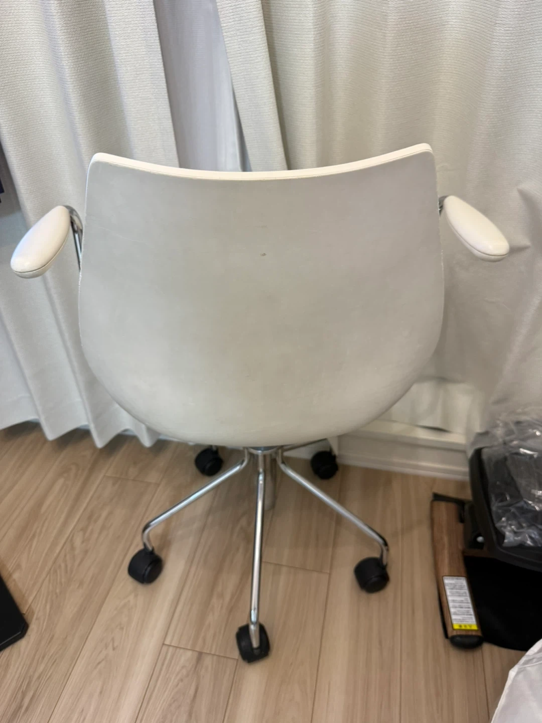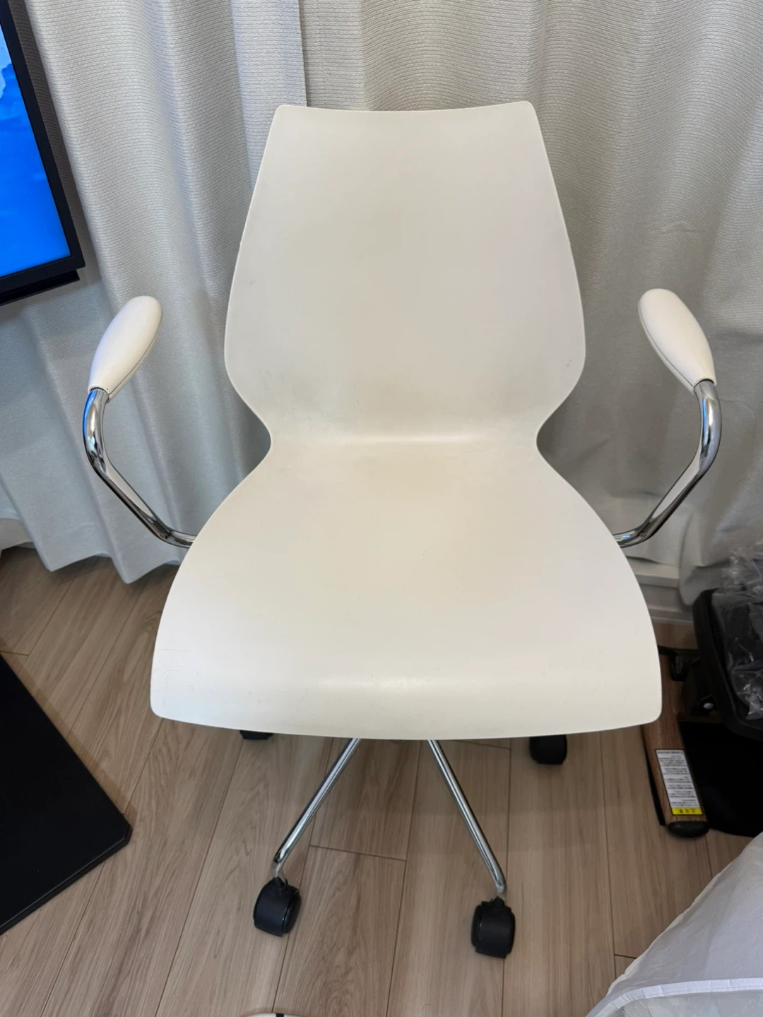 カルテル (Kartell) マウイチェア ア ーム付、キャスター付、、座面昇降付 カラー:ホワイト フレーム: クロムメッキ鋼 サイズ(cm): W55x D52x H77x CH77 座面の上下と回転、 キャスターは問題なく作動しています。 使用感はあります。写真のような傷もあります。 神経質な方はご遠慮ください。