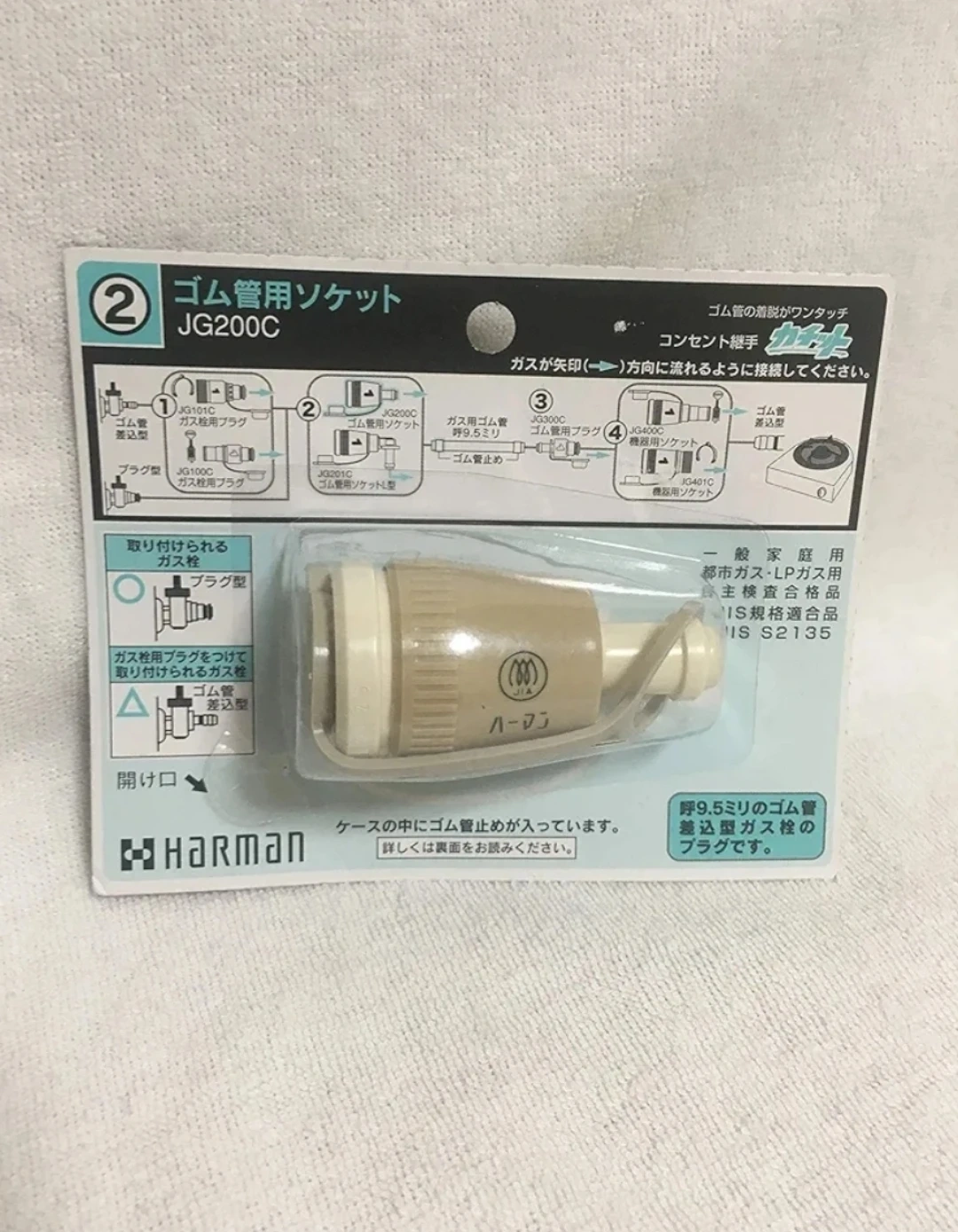 ガスホース用ソケットです。 ・都市ガス用、プロパンガス用のホース ・型番:JG200C HaRMaNのゴム管用ソケットです。 材質: ゴム 色: ホワイト サイズ : 直径29.5×高さ56mm 本体重量 : 250g 素材・材質 : 難燃性樹脂 原産国 : 日本 内径9.5mmゴム管用です。 ご希望の方はお気軽にご連絡ください。