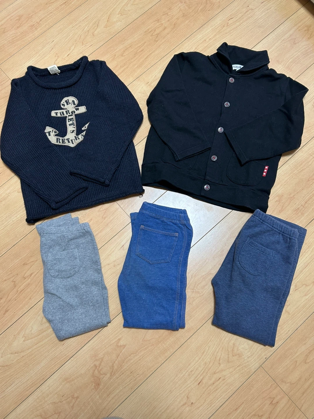 子供服の5点セット。レギンスは全てユニク ロです。 男の子でも女の子でも着ていただけると思います。 ・紺色のマリンテイストのニット ・黒色のカーディガン ・グレーリブレギンス ・ブルーデニムレギンス ・ブルーデニムレギンス(裏フリース) 目立つ汚れ等はありませんが、使用による毛羽立ち等は若干あります。 ご了承の程、よろしくお願いいたします。 お取り引き場所はアピタ長津田店か十日市場駅希望です。