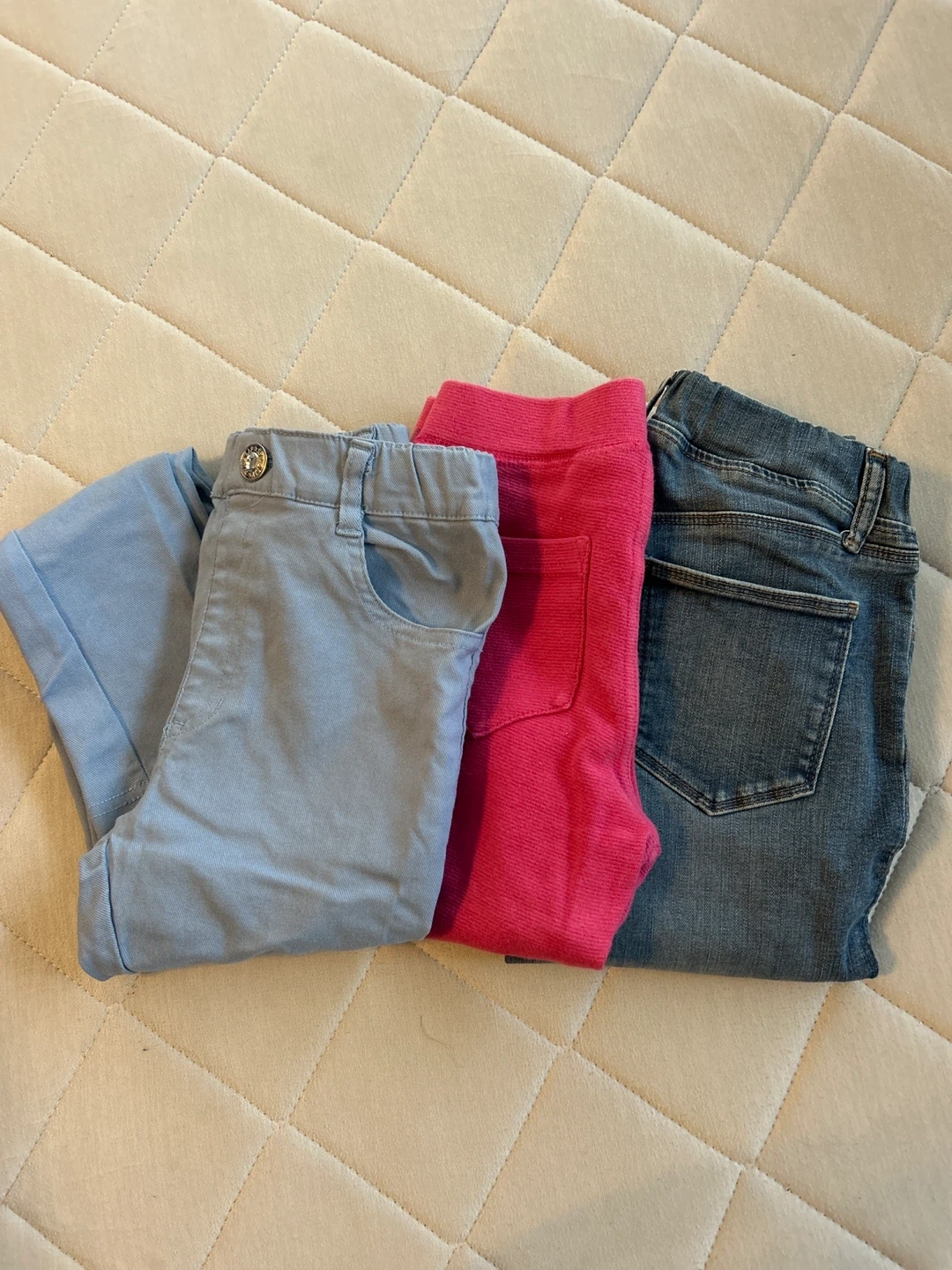 キッズパンツ3枚セットです ・色:水色(140)ピンク、デニム(130) ・状態:ほぼ未使用 スキニータイプでピッタリしています。 子は足にピッタリのパンツが好きではなかったので、ほぼ履いていません。 中古品であることご了承ください