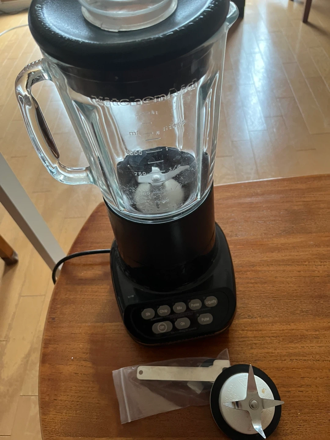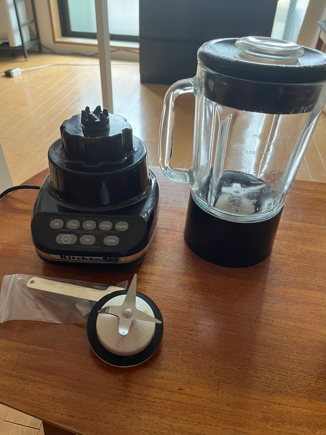 キッチンエイドのブレンダーです。 【情報】 ブランド:キッチンエイド カラー:ブラック 容量:1.25L (1000mlまで目盛あり) 【付属品】 替え刃 aKitchenAid blender. [Information] Brand: KitchenAid Color: Black Capacity: 1.25L (with 1000ml graduations) [Accessories] Replacement blades