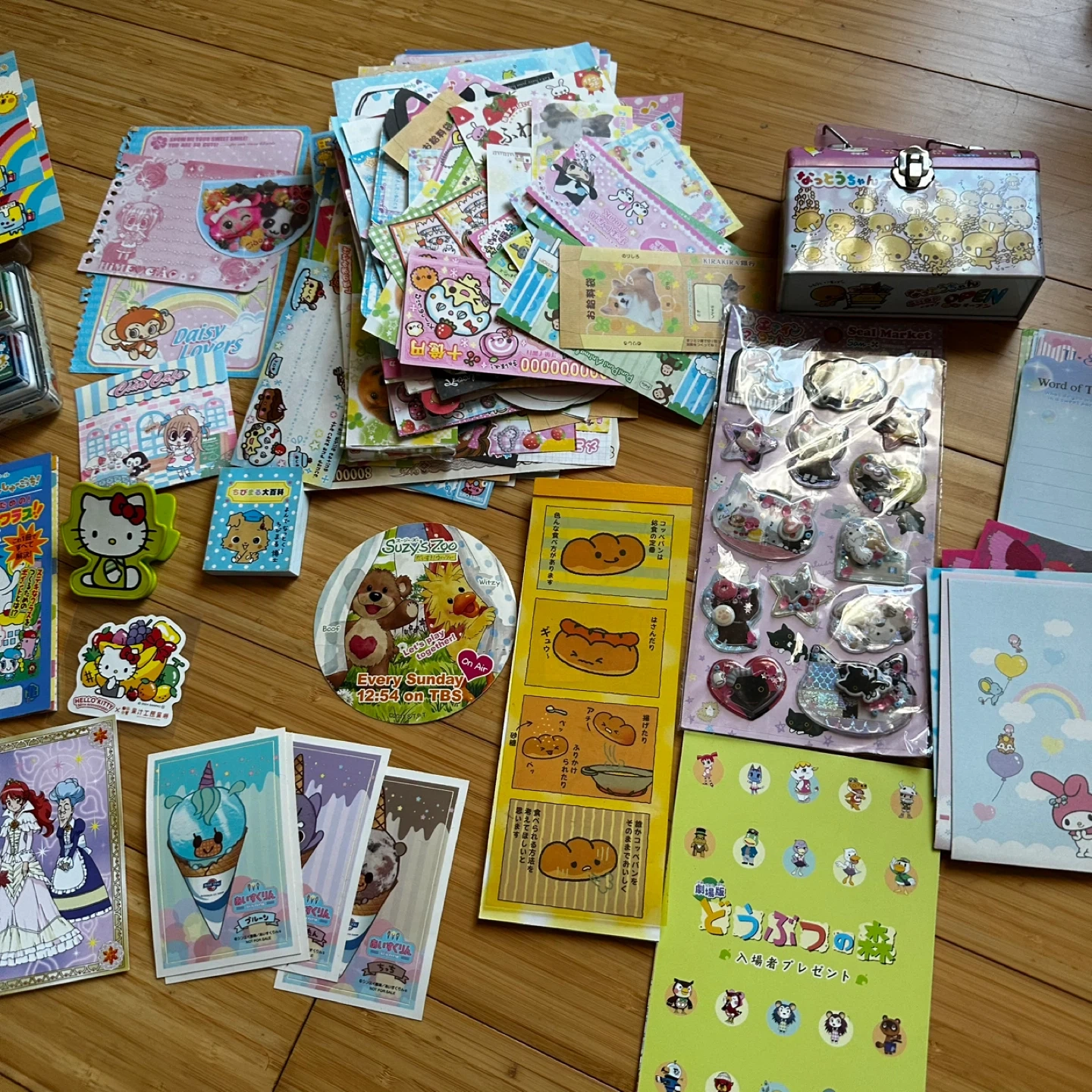 平成キャラクターの文房具セットです。 なっとうちゃんの缶ケース シール ・靴下にゃんこ エアインマスコット(7年以上前に購入してるので、粘着不明) ・あいすくりん×BLUE SEAL ・スージーズー(PLAZAで昔頂いたもの) ・ハローキティ×果汁工房果琳(おまけです) ハローキティ クリップ(たしかハッピーセットか何か) スタンプ(インク乾いてると思いますが、スタンプは使えます。) メモ帳 ・メモ帳交換で集めたもの(100枚以上) →きらレボなどちゃお付録もあります ・パンくんち ・ちびまる レターセット ・まめゴマ ・マイメロ など ポストカード ・劇場版どうぶつの森 入場特典 ・ふしぎ星のふたご姫 ・シルバニアファミリー ・ツムツム ・JAL×たまごっち(羽田空港で押したまめっちのスタンプ付きと無しの2枚セット) 比較的状態が良いものを選んでいますが、そうでないものも混ざっている場合がありますので完全美品をお求めの方はお控えください。 レアな物も含んでるので、高めにしてます。 (各お品物相場みて変更する場合もあります。)