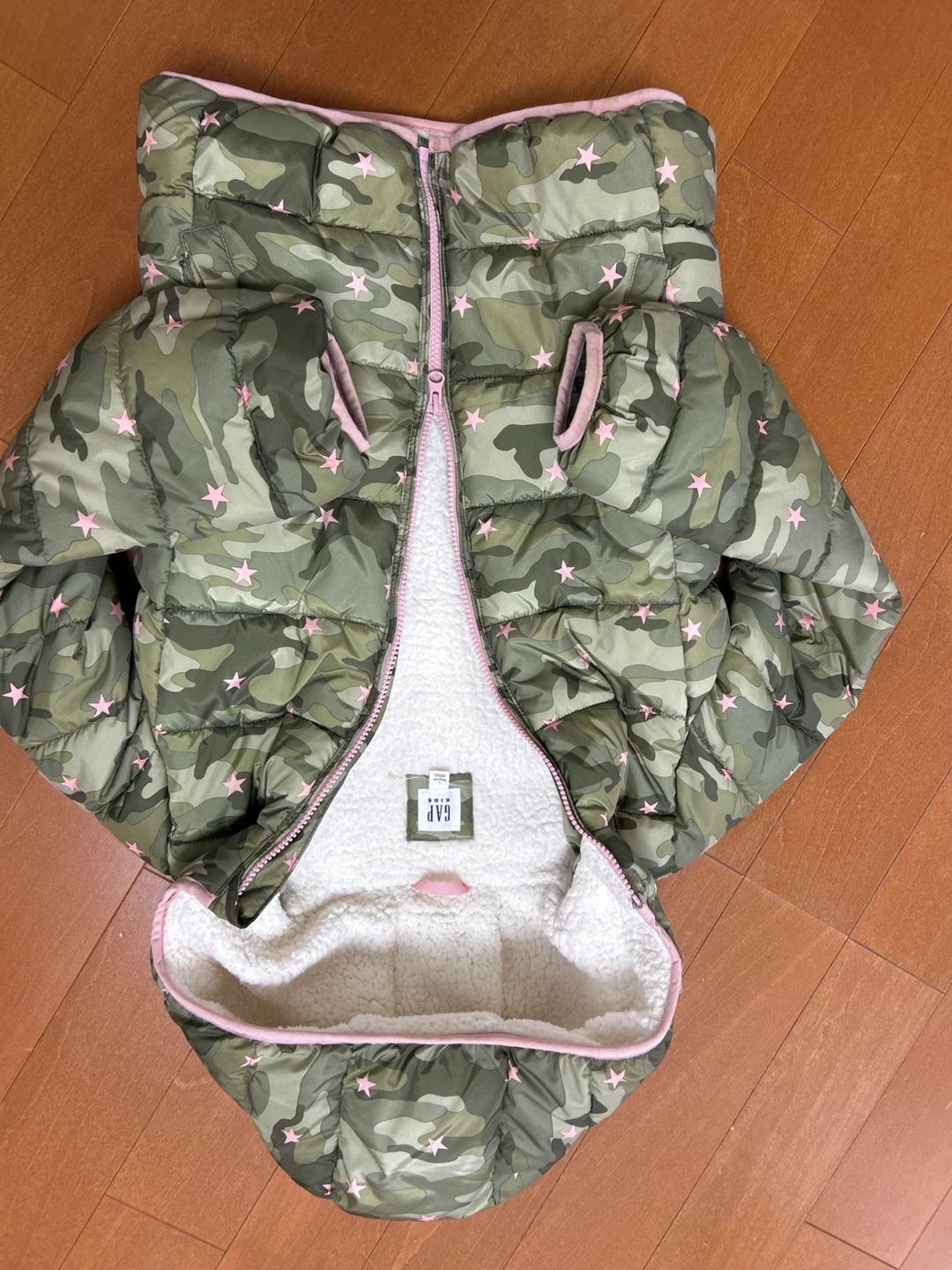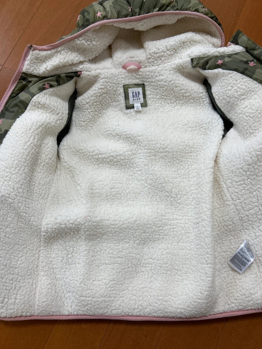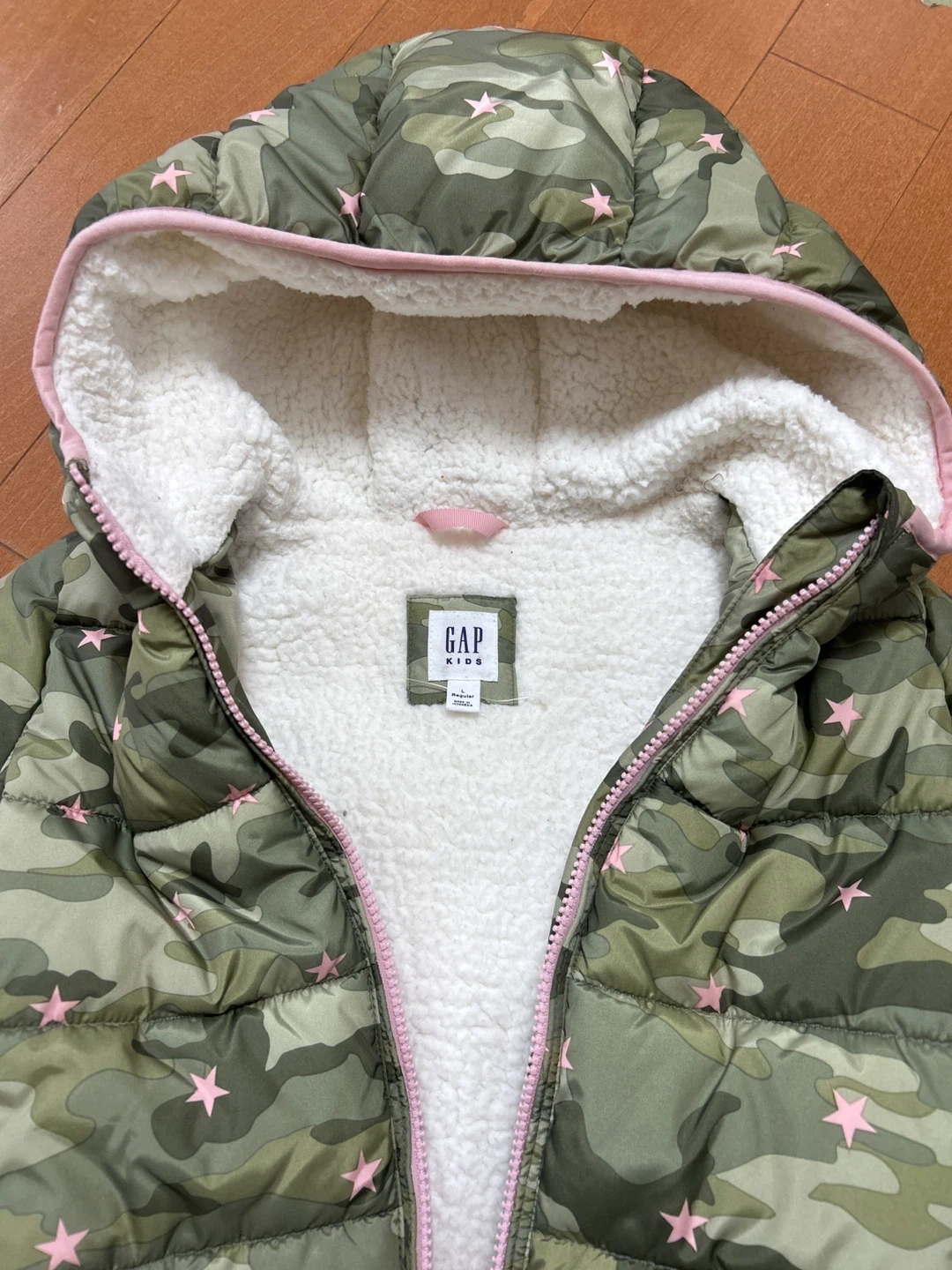 ギャップキッズのアウターです。 子供はすぐ大きくなります〜。今年の冬は中古で乗り切ろーと思って頂ければ、お安いかと思います。 着用感は少し小さめだと思います。 ・ブランド:ギャップキッズ ・サイズ:L ・カラー:迷彩柄、ピンクの星 ・裏地はボア素材 袖ぐり、裾まわり、使用感あります。 中古品であることご了承ください