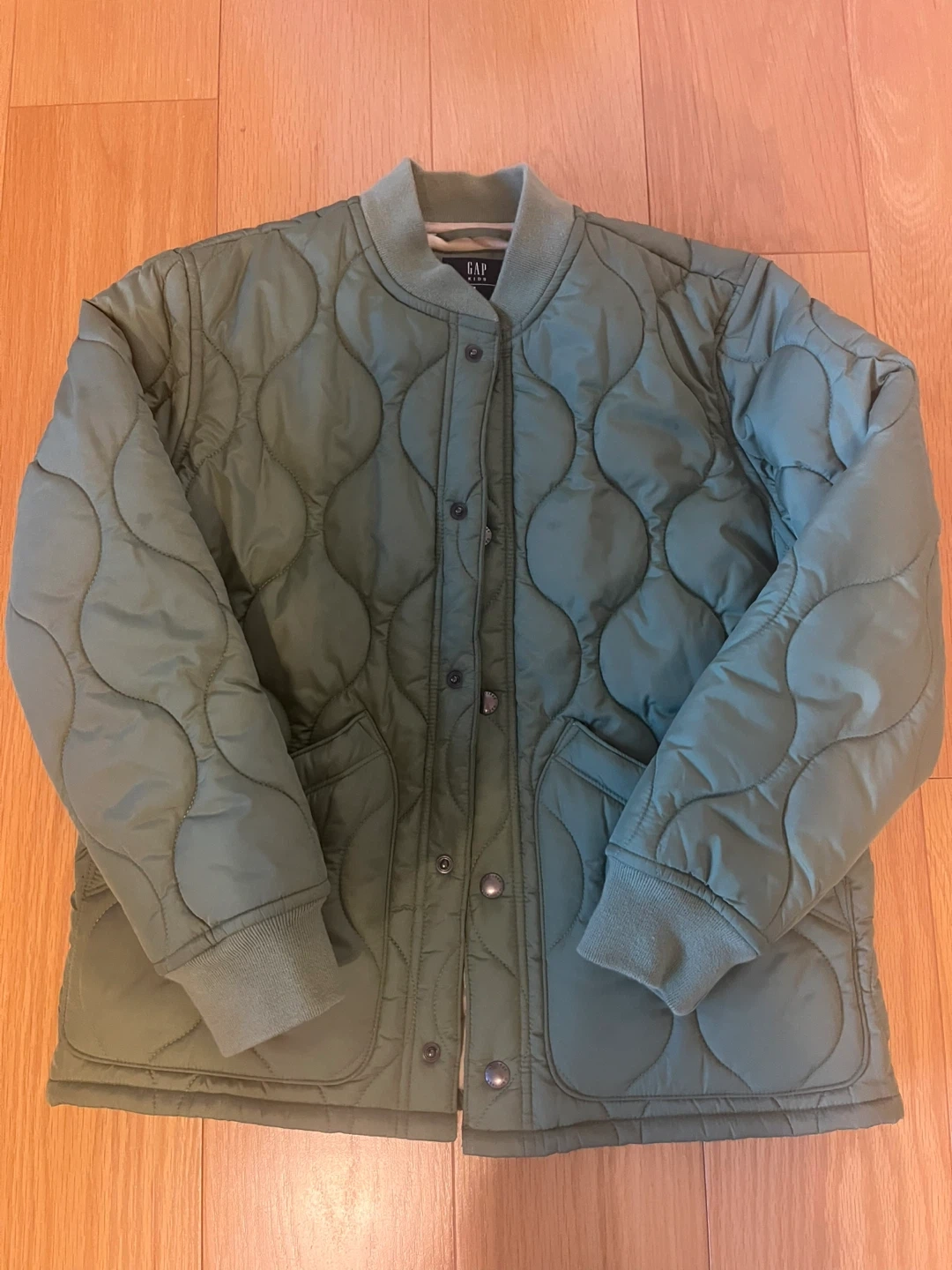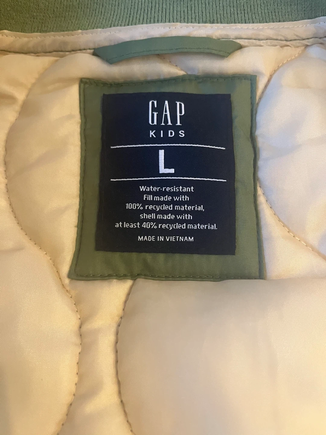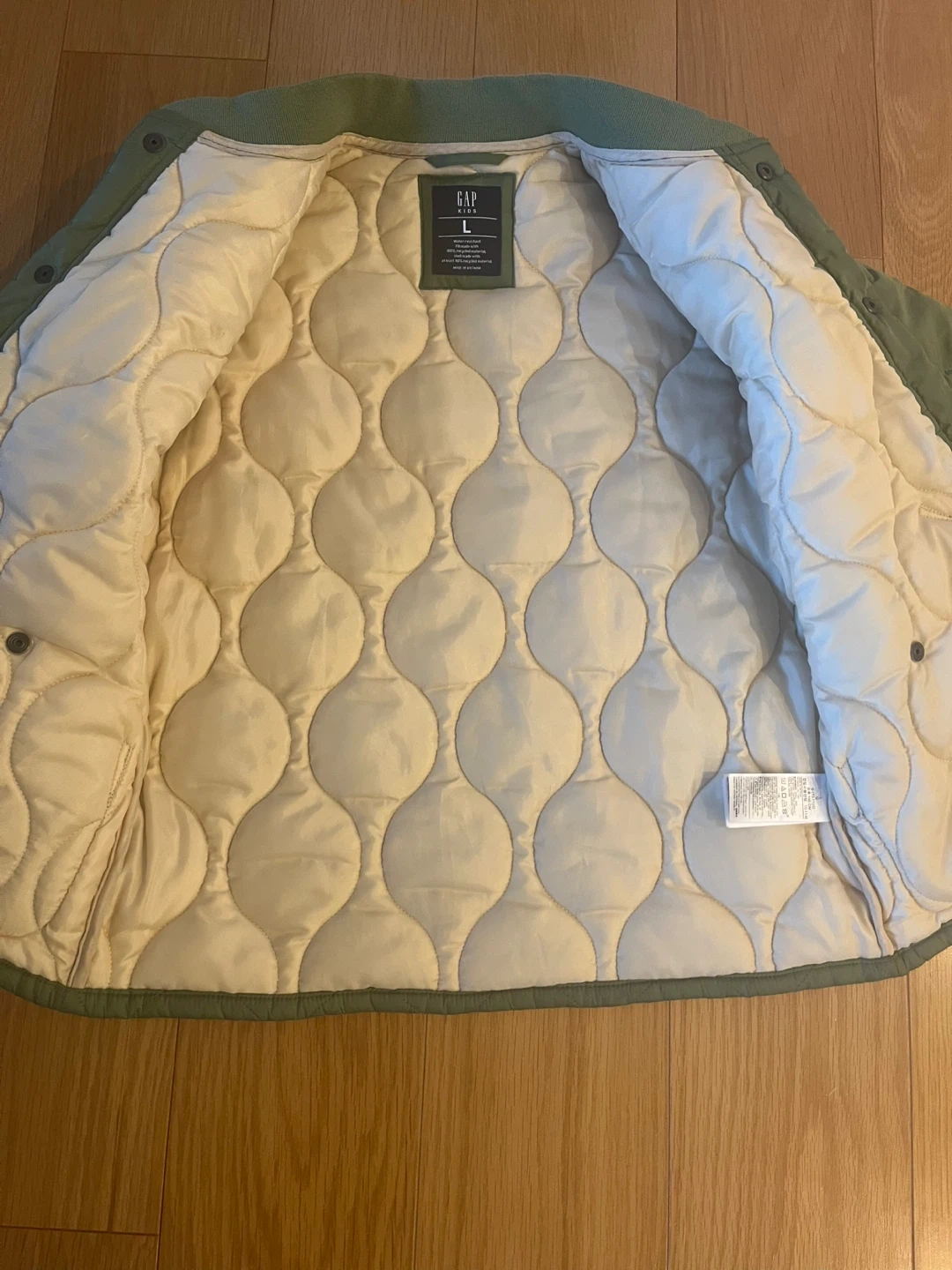 ギャップキッズのジャケットです。 ・ブランド:ギャップ ・サイズ:L(10-11歳、140cm) ・カラー:グリーン系 ・素材:画像参照 ・状態:使用感少なめ 中古品であることをご了承ください。