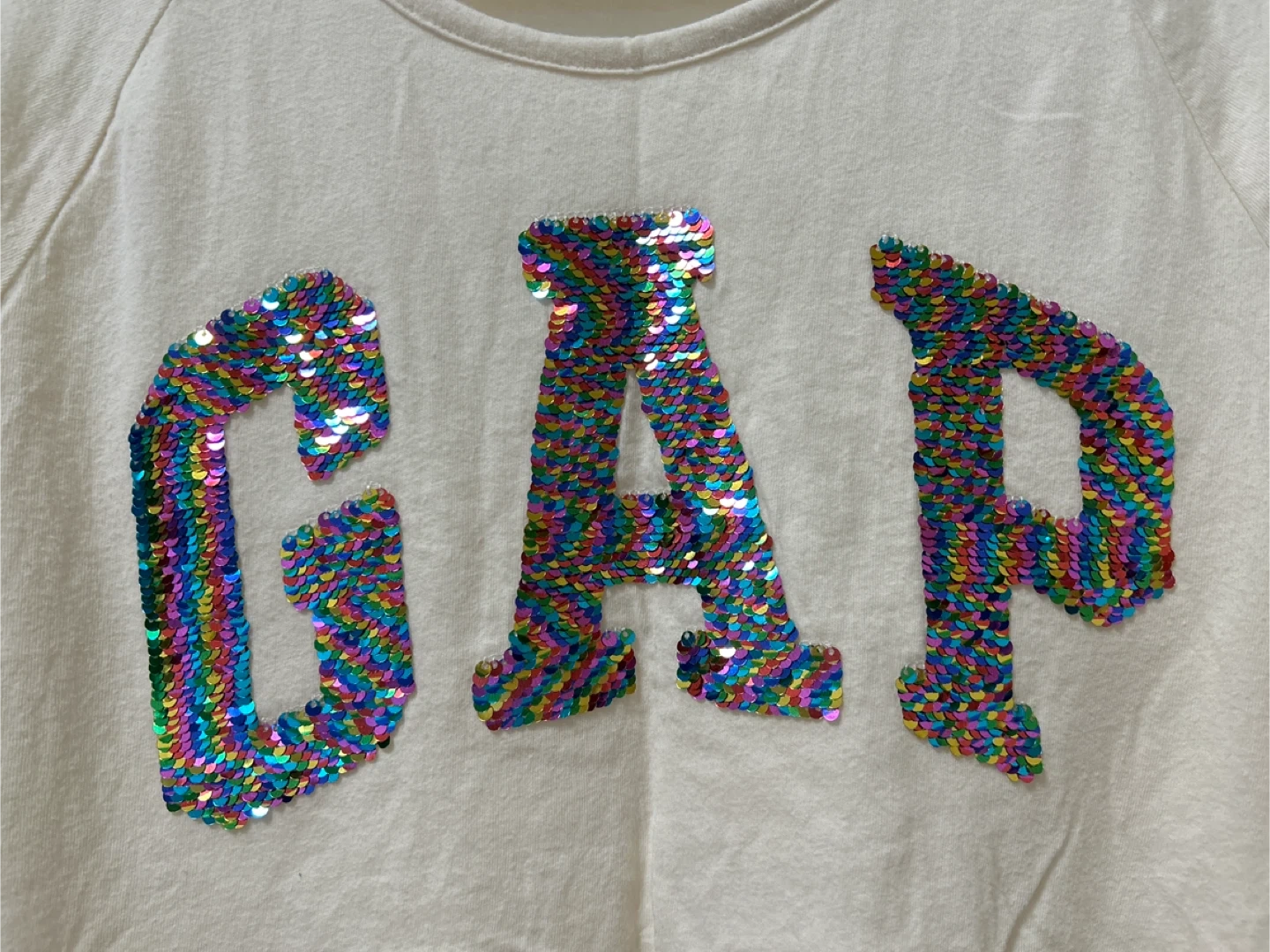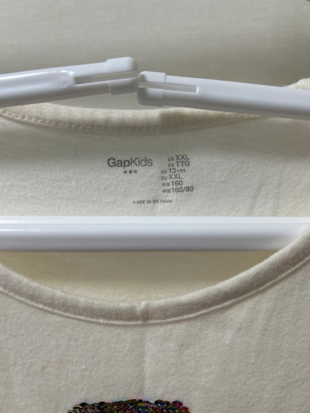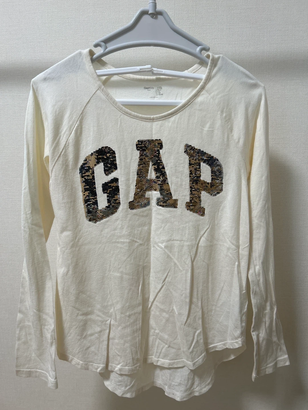 ギャップキッズの長袖Tシャツです 【情報】 ブランド:ギャップキッズ サイズ:日本160/80 色:オフホワイト 【状態】 使用感少なめ、目立つキズなし スパンコールの向きで色がかわって かわいいです  中古品であることご了承ください