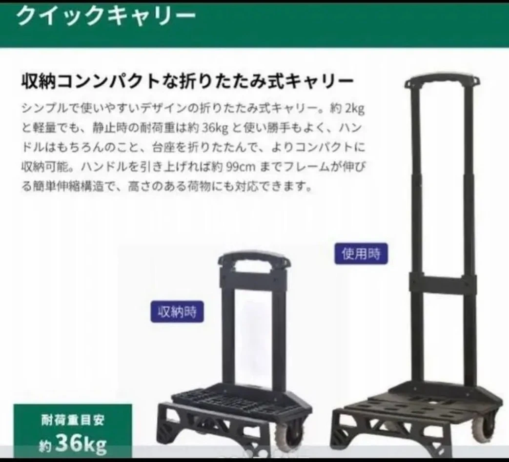 ■お取引ご希望の方は、必ず当方のプロフィールをお読み頂き、納得された上で、ご連絡ください。 折りたたみ式キャリーカートです。 某フリマサイトで購入しましたが、使う機会が無いので、どなたが必要な方にお安くお譲りしたいと思います。 ・折りたたみ式 ・耐荷重目安:約36kg 中古品であることをご了承ください。