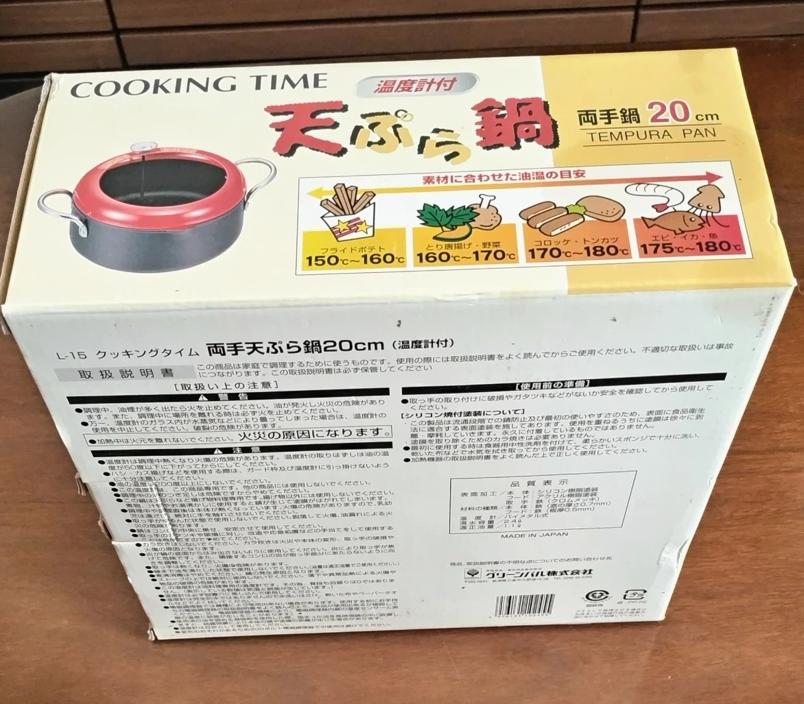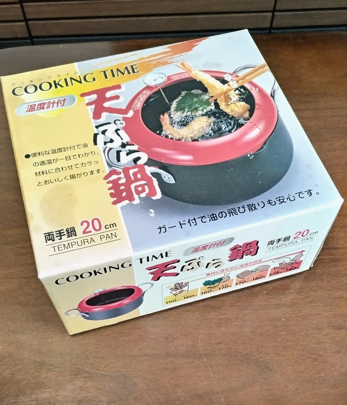 クッキングタイムの天ぷら鍋20cmです。 卓上で、揚げたて天ぷらって美味しいですよね😉 【情報】 ブランド:クッキングタイム 商品:天ぷら鍋 サイズ:20cm 【状態】 新品、未使用です😊 箱は年季有りですが😅 【付属品】 温度計付きです。 中古品であることをご了承ください。