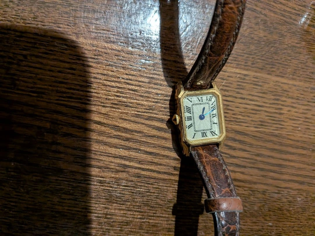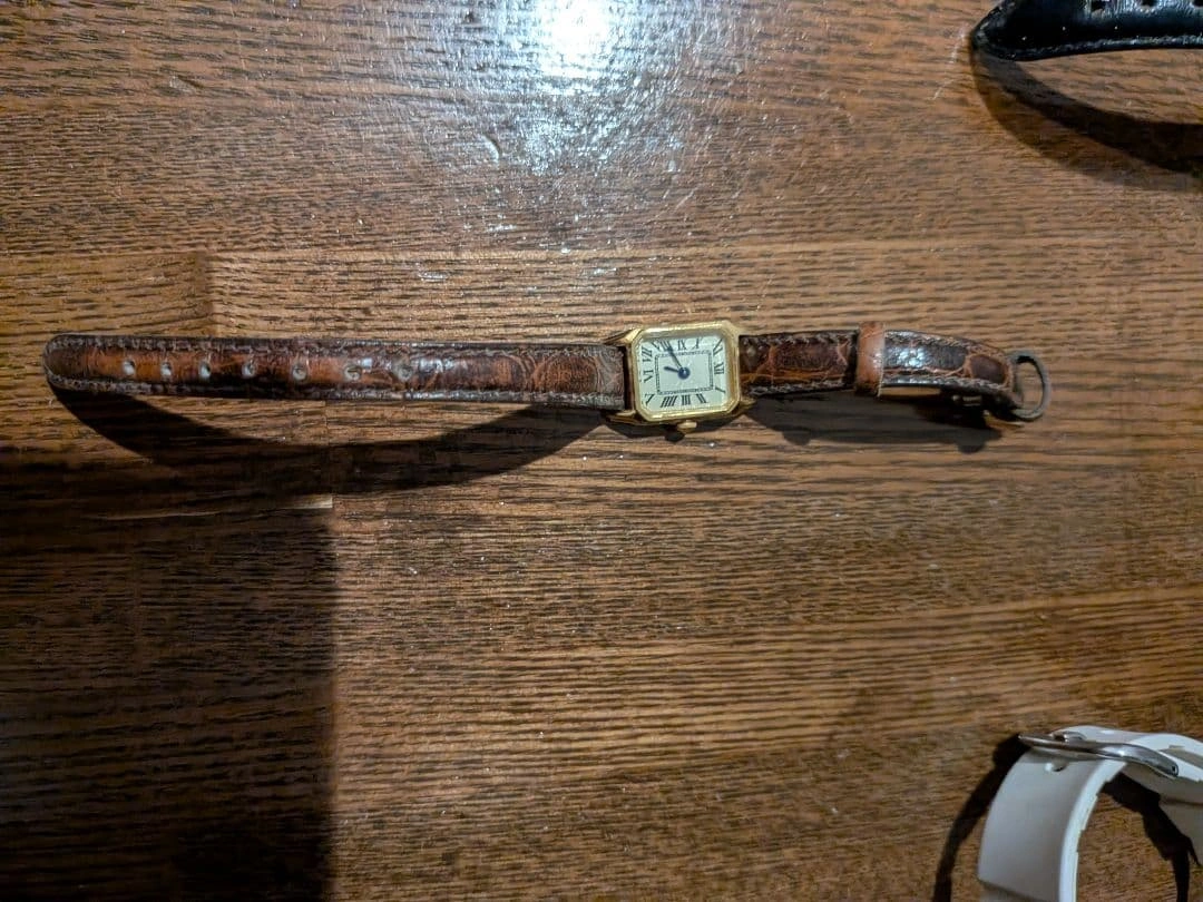 クラシックなローマ数字の文字盤を持つレザー製の腕時計です。 - デザイン: 四角形のケースとローマ数字の文字盤 - バンド素材: レザー製のブラウンバンド - カラー: ゴールドのケースとホワイトの文字盤 - スタイル: クラシックなデザイン ご覧いただきありがとうございます。 ご希望の方はお気軽にご連絡ください。