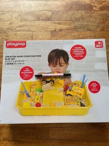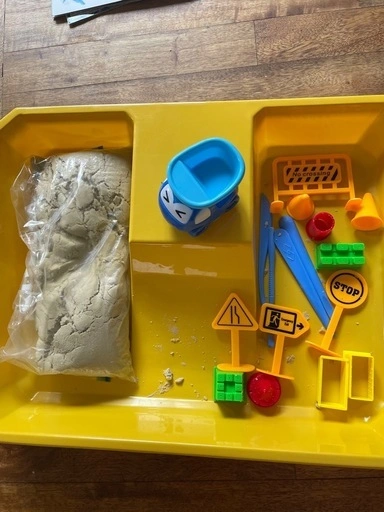 クリエーションサンド工事現場プレイセットです。対象年齢3歳からです。 さらさらの砂が型に入れると固まります。約1キロの砂です。 屋内で砂遊びが出来、お家遊びの時活躍しました。 小物はありますが車両はなくしてしまったのでつきません。おまけで車一台自宅にあったものを付けてます。 大きさは箱の上にのせたペンと比較して下さい。 お渡しは自宅付近の東高津小学校正門前です。 日時は要相談です。 ご希望の方はお気軽にご連絡ください。